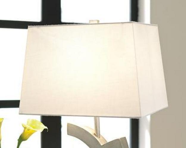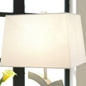 Lamp base made of resin in silver finish,Rectangular hardback shade enhances the modern, structural aesthetic,3-way switch makes this lamp a smart choice for task lighting,1 type A bulb (not included); 150 watts max or 25 watts max CLF; UL Listed,Clean with a soft, dry cloth