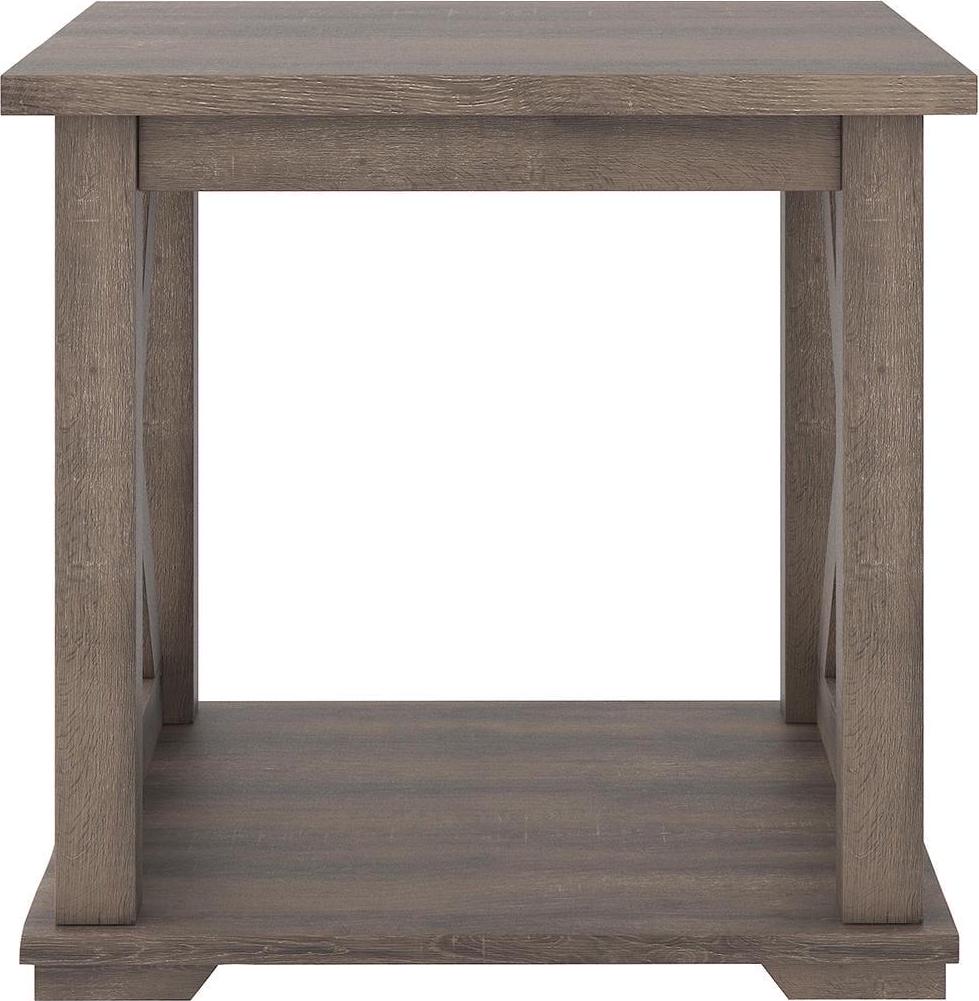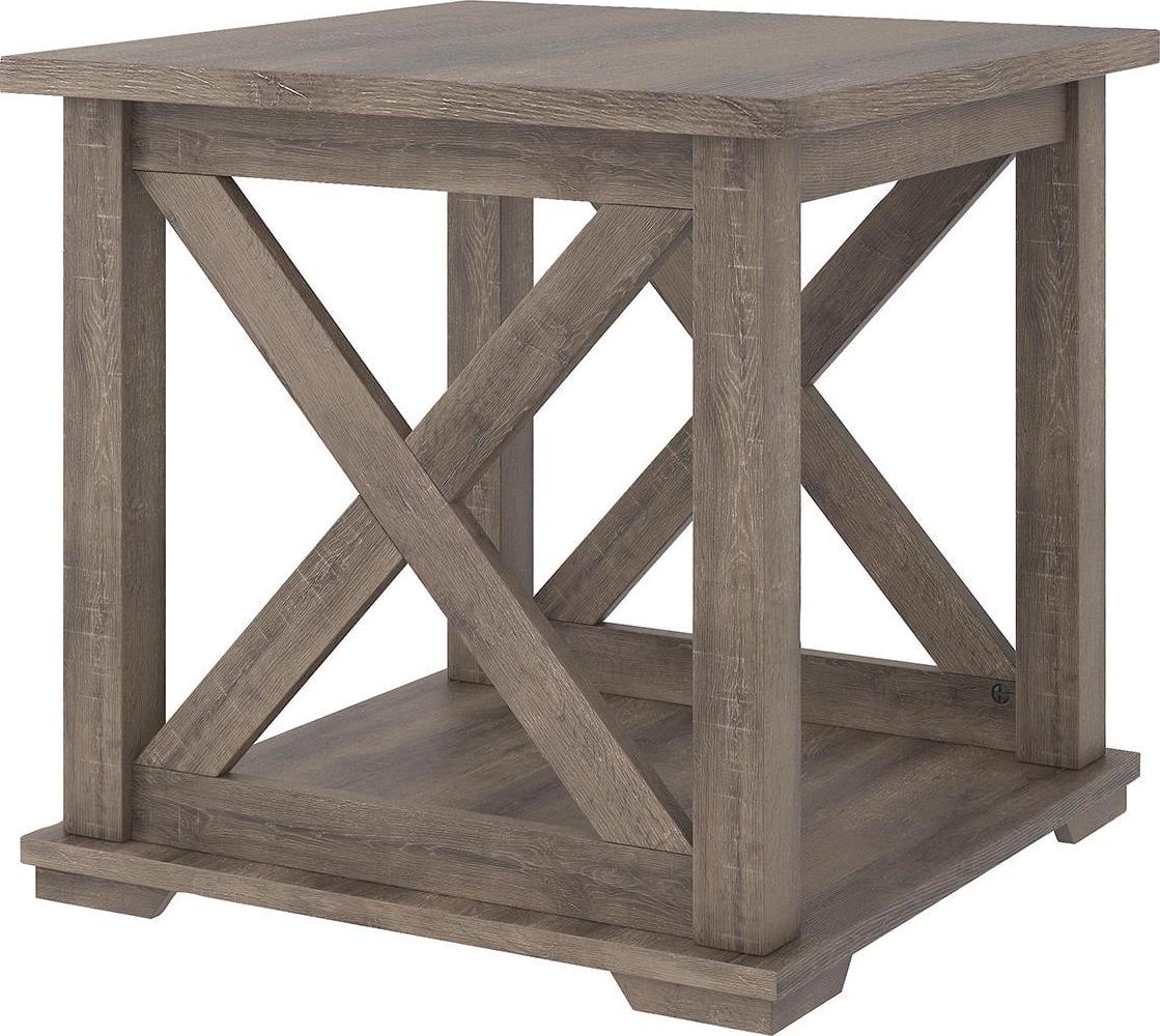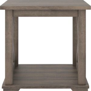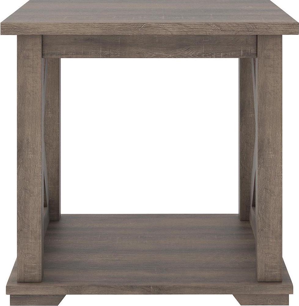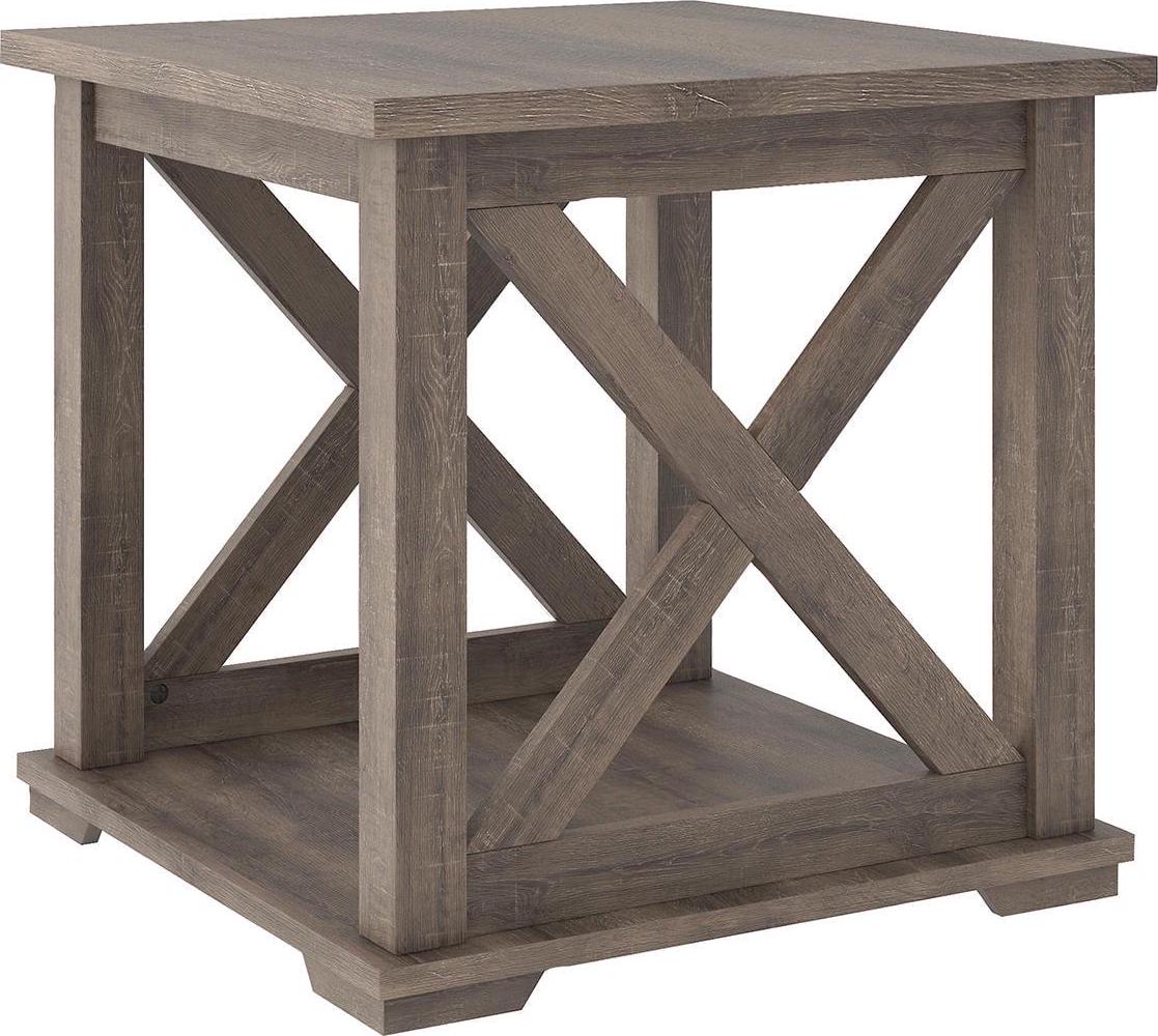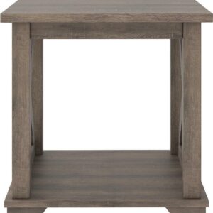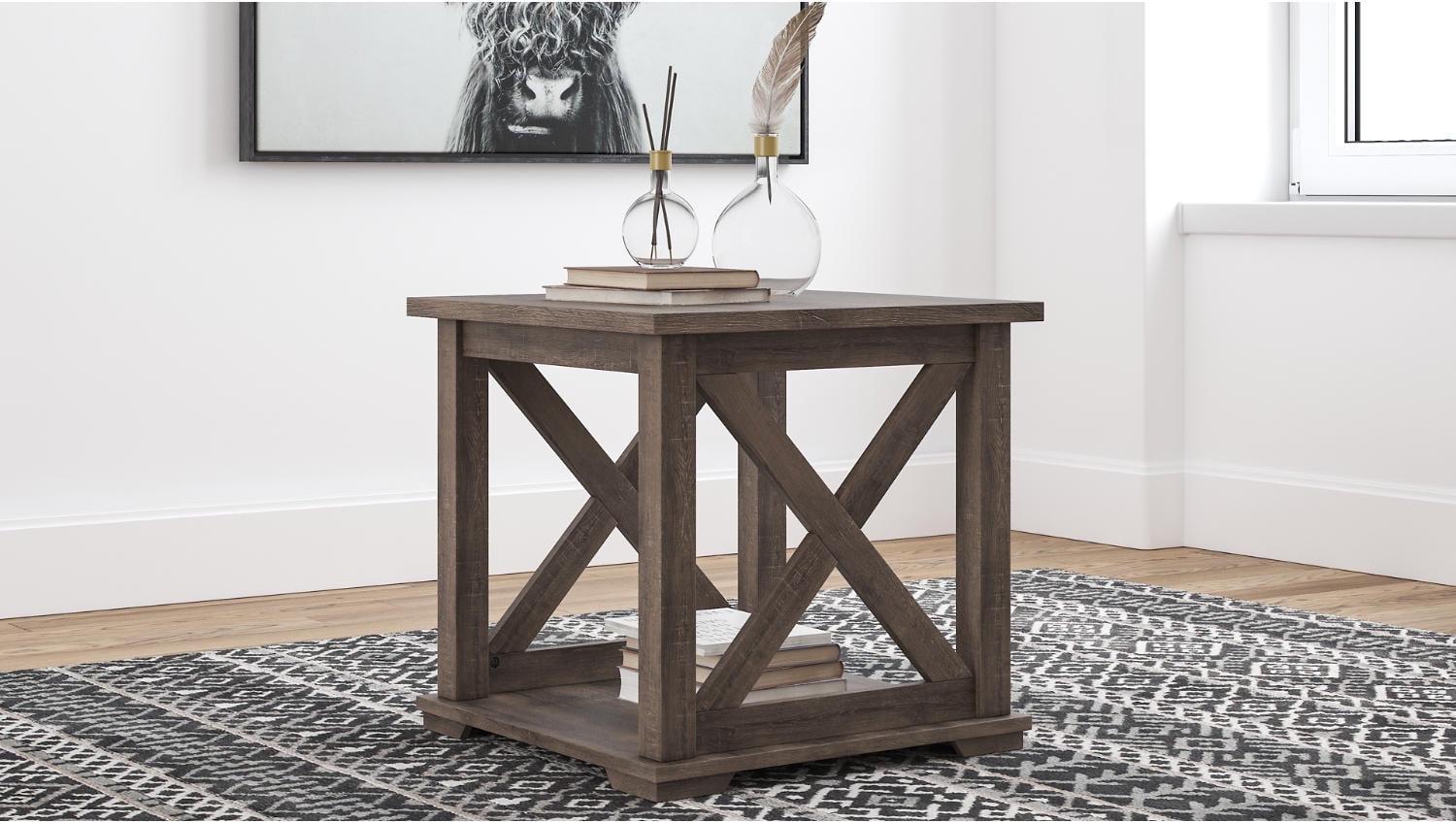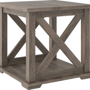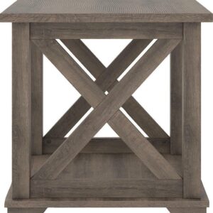 Raise the bar on modern farmhouse design with the Arlenbry end table. Sporting a handsome weathered oak effect and cross buck design, this table makes a statement wherever it lands. With its generous shelved storage space, this home essential is packed with possibilities.