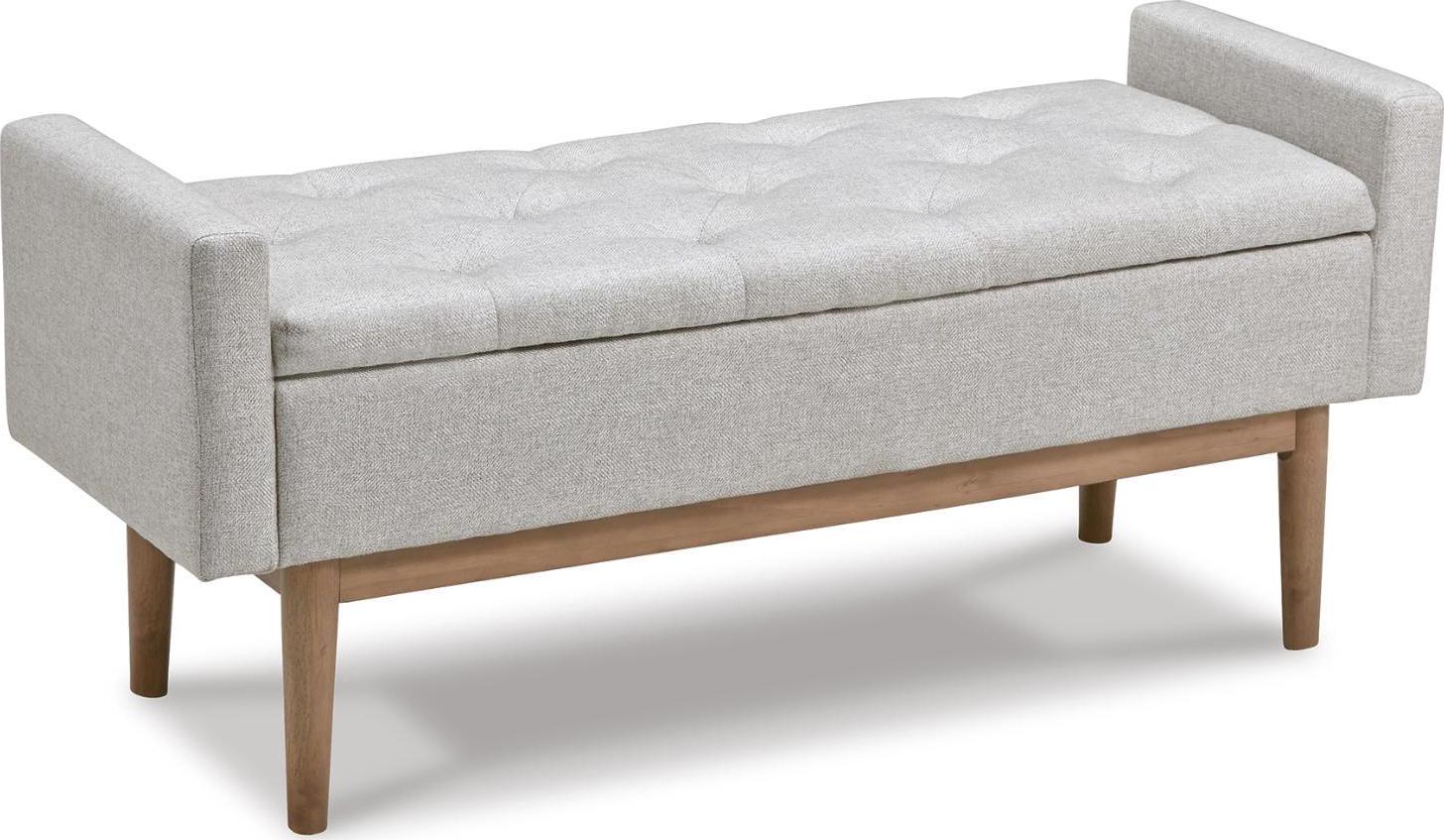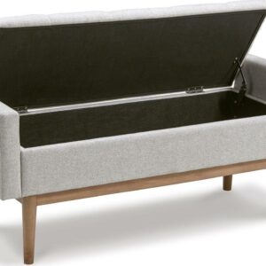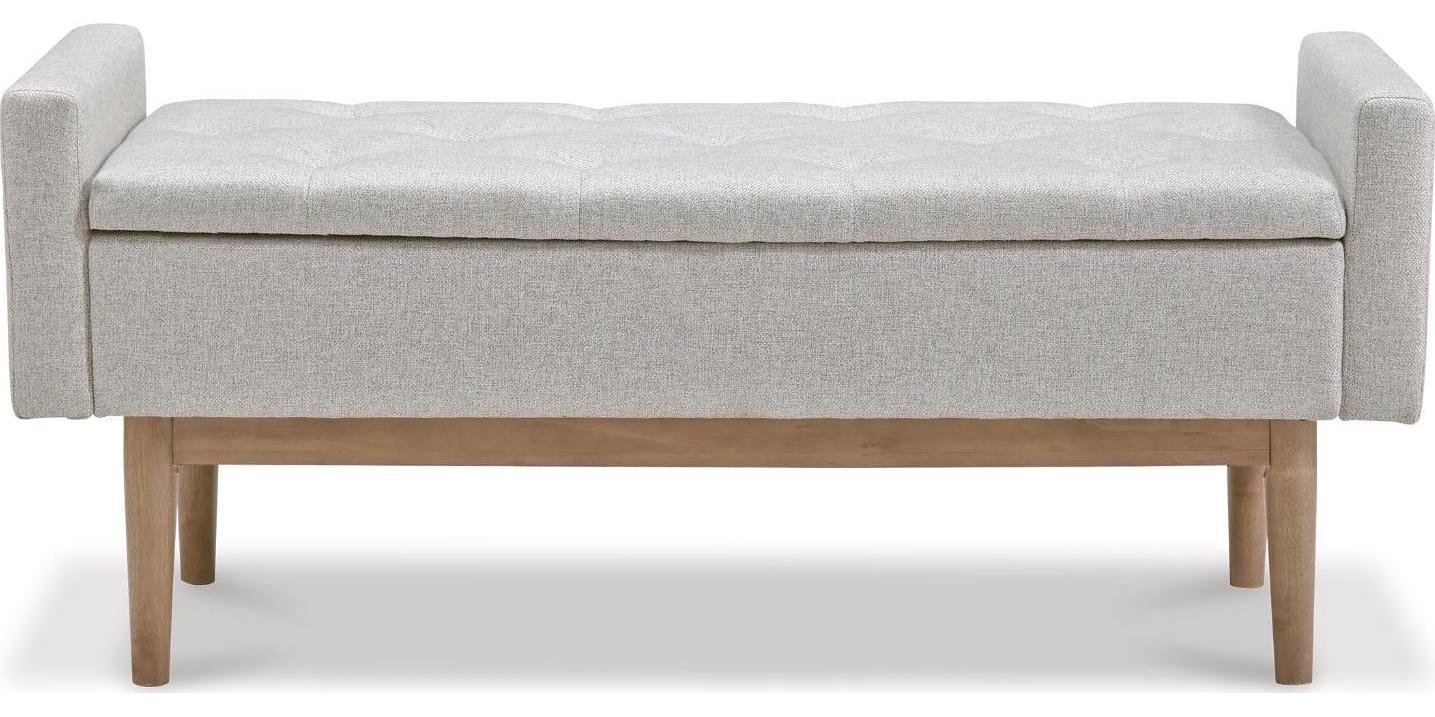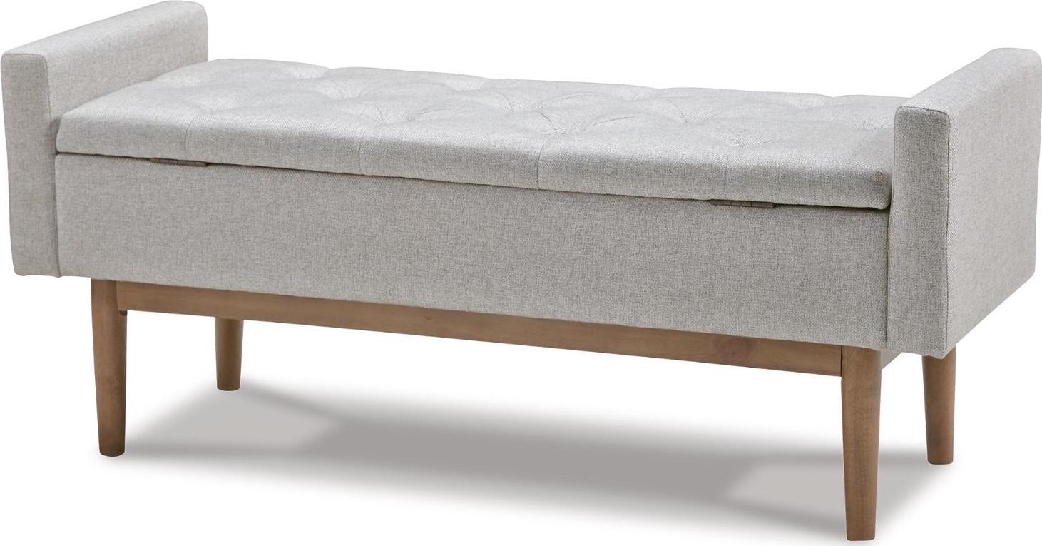 Contemporary style gets practical with the Briarson bench. The tufted beige seat cushion is hinged to allow easy access to whatever you need to hide in plain sight. The raised edges give the impression of arms on this cushioned seat while the light brown finished wood legs help it blend with many different modern styles.
