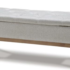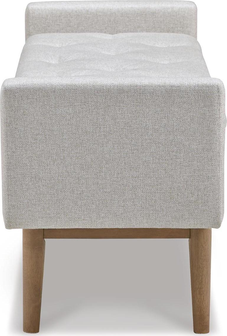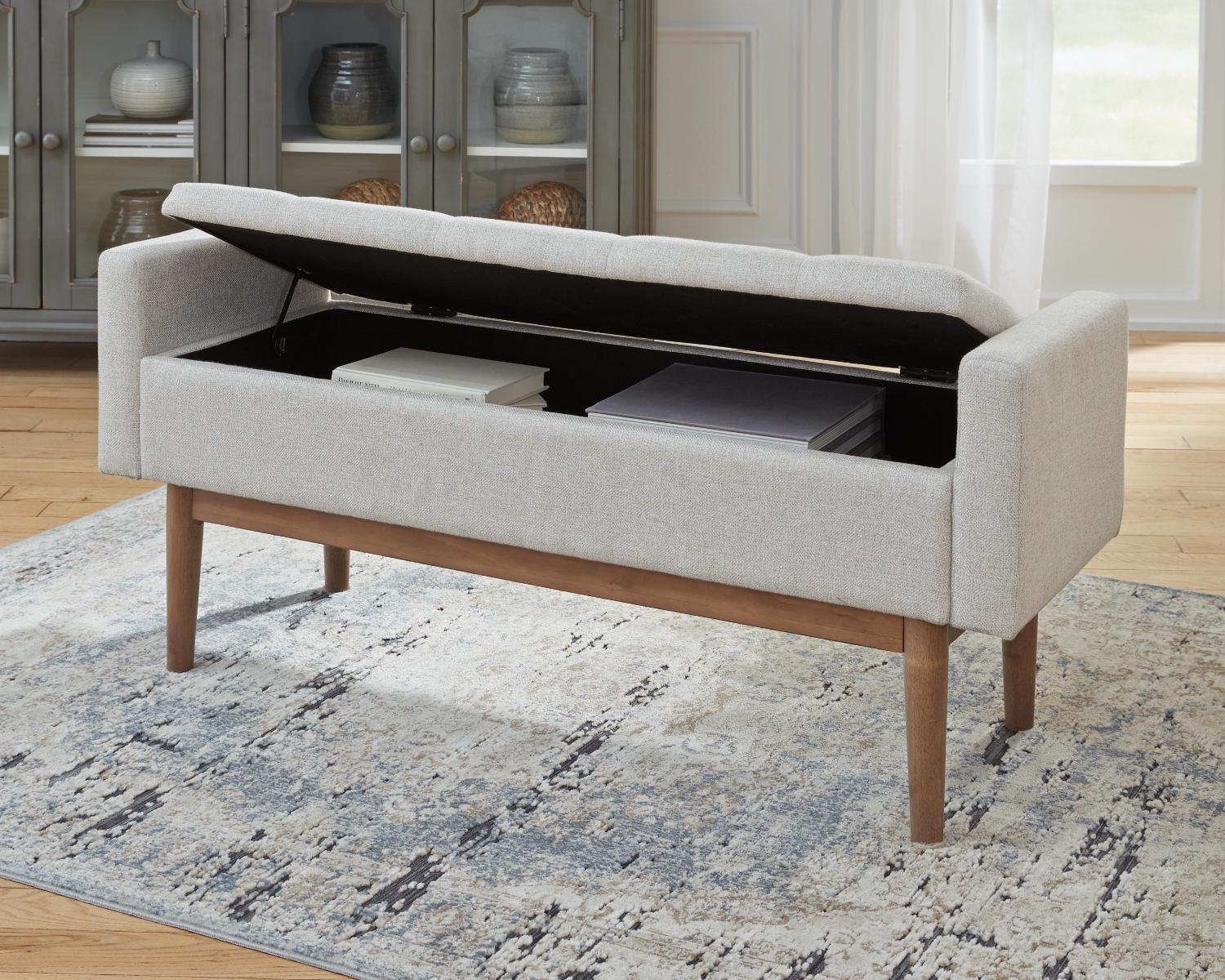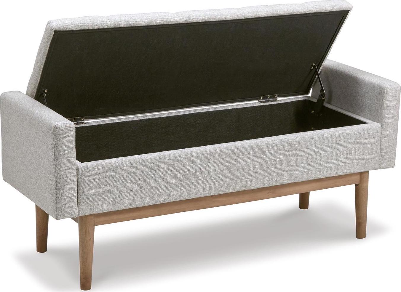 Contemporary style gets practical with the Briarson bench. The tufted beige seat cushion is hinged to allow easy access to whatever you need to hide in plain sight. The raised edges give the impression of arms on this cushioned seat while the light brown finished wood legs help it blend with many different modern styles.