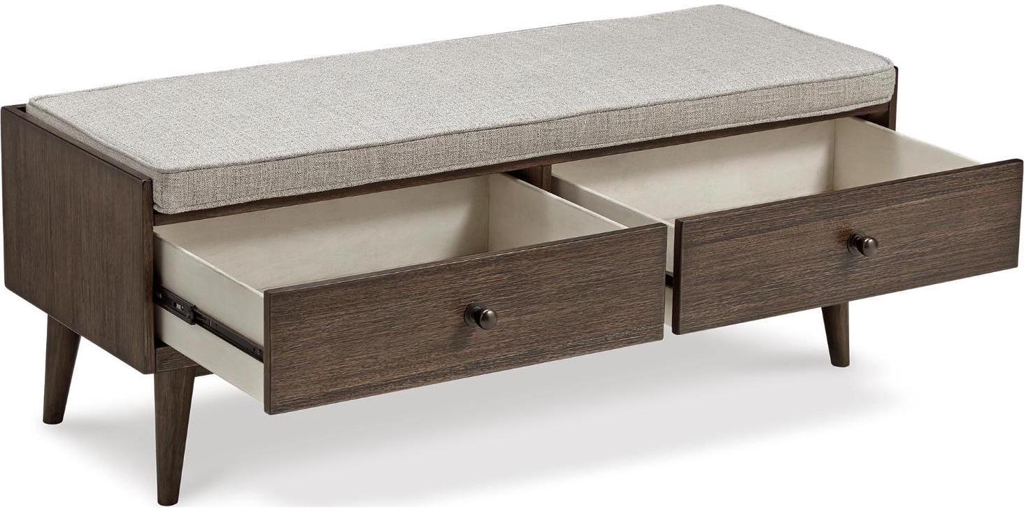 Style gets a practical upgrade with the two drawers of the Chetfield bench. The warm brown finish topped with a reversible cushion upholstered in gray fabric works in so many decor styles. Finished off with tapered legs and black-finish metal drawer pulls, this piece adds an efficient charm to your home.