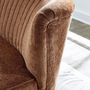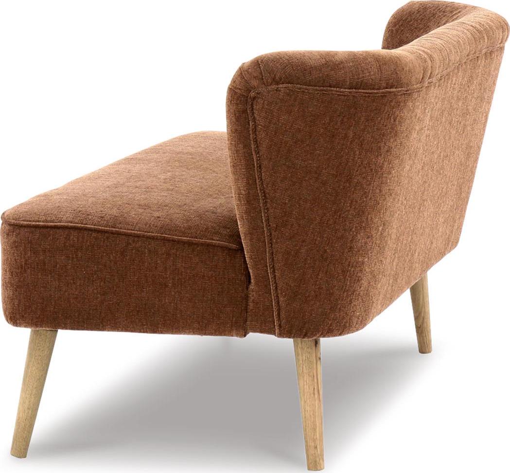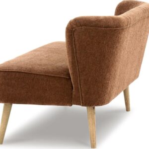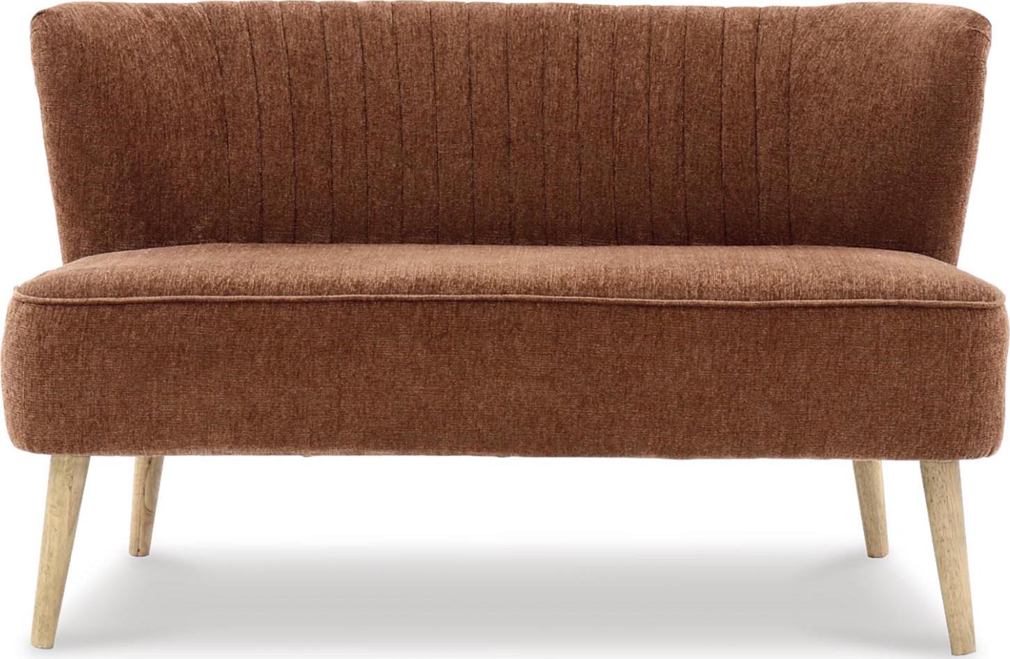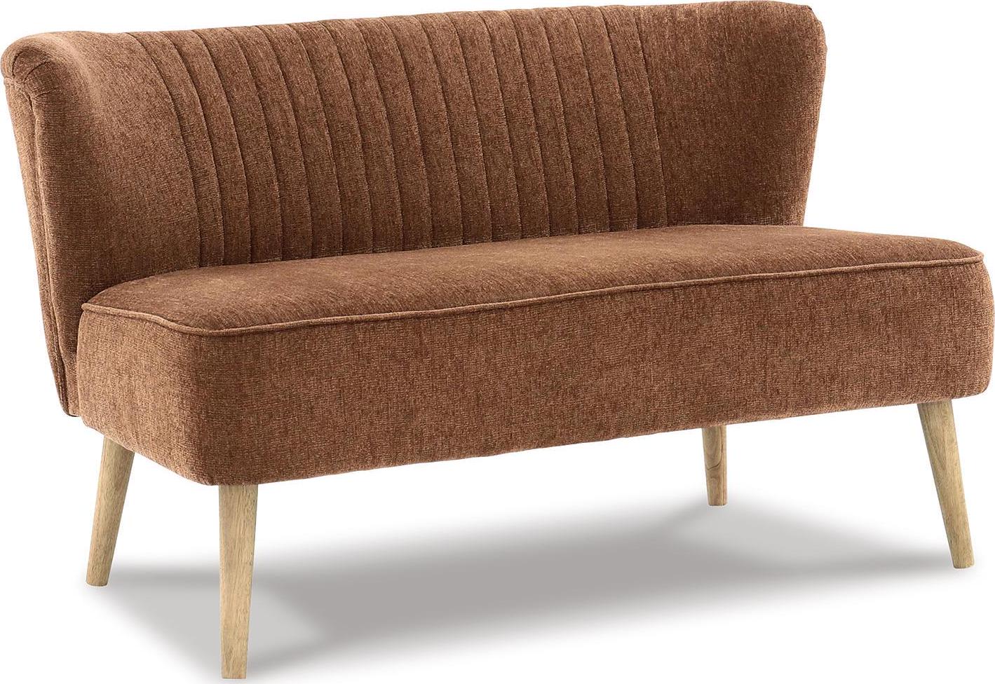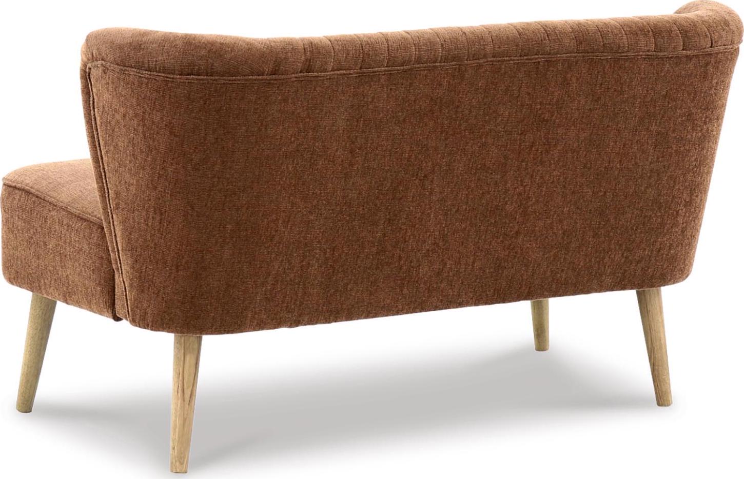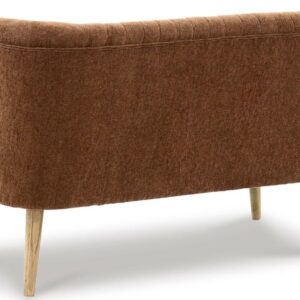 The Collbury settee boasts couture-inspired detailing with its curved sides and contemporary/mid-century allure. Channel stitched back design with natural wood tapered legs elevates its luxe appeal with feel-good cognac brown colored polyester fabric putting comfort in style.