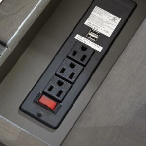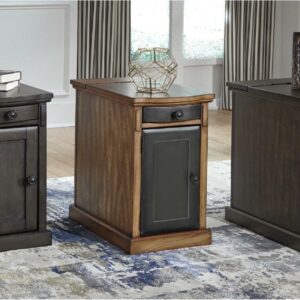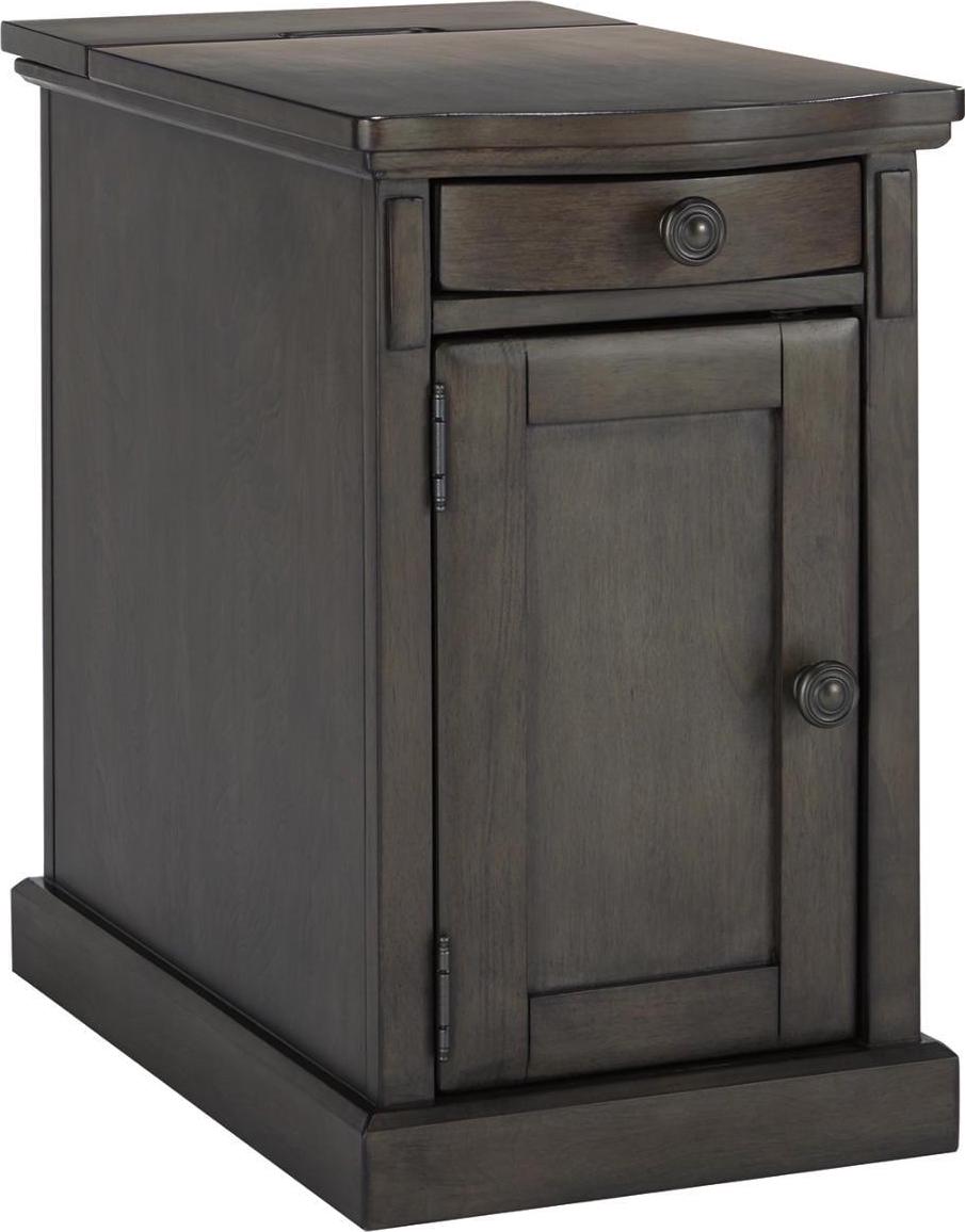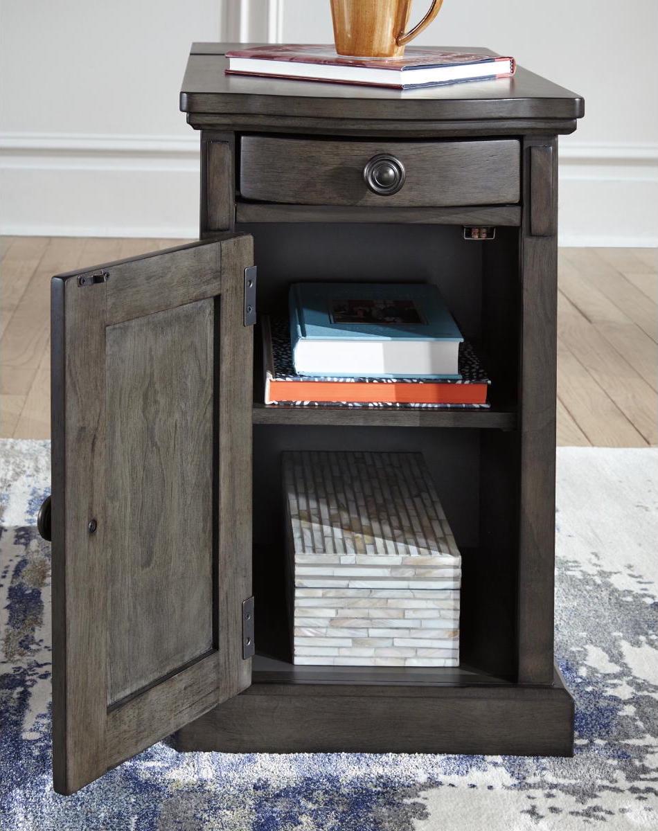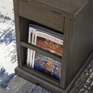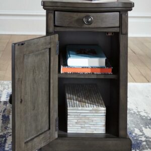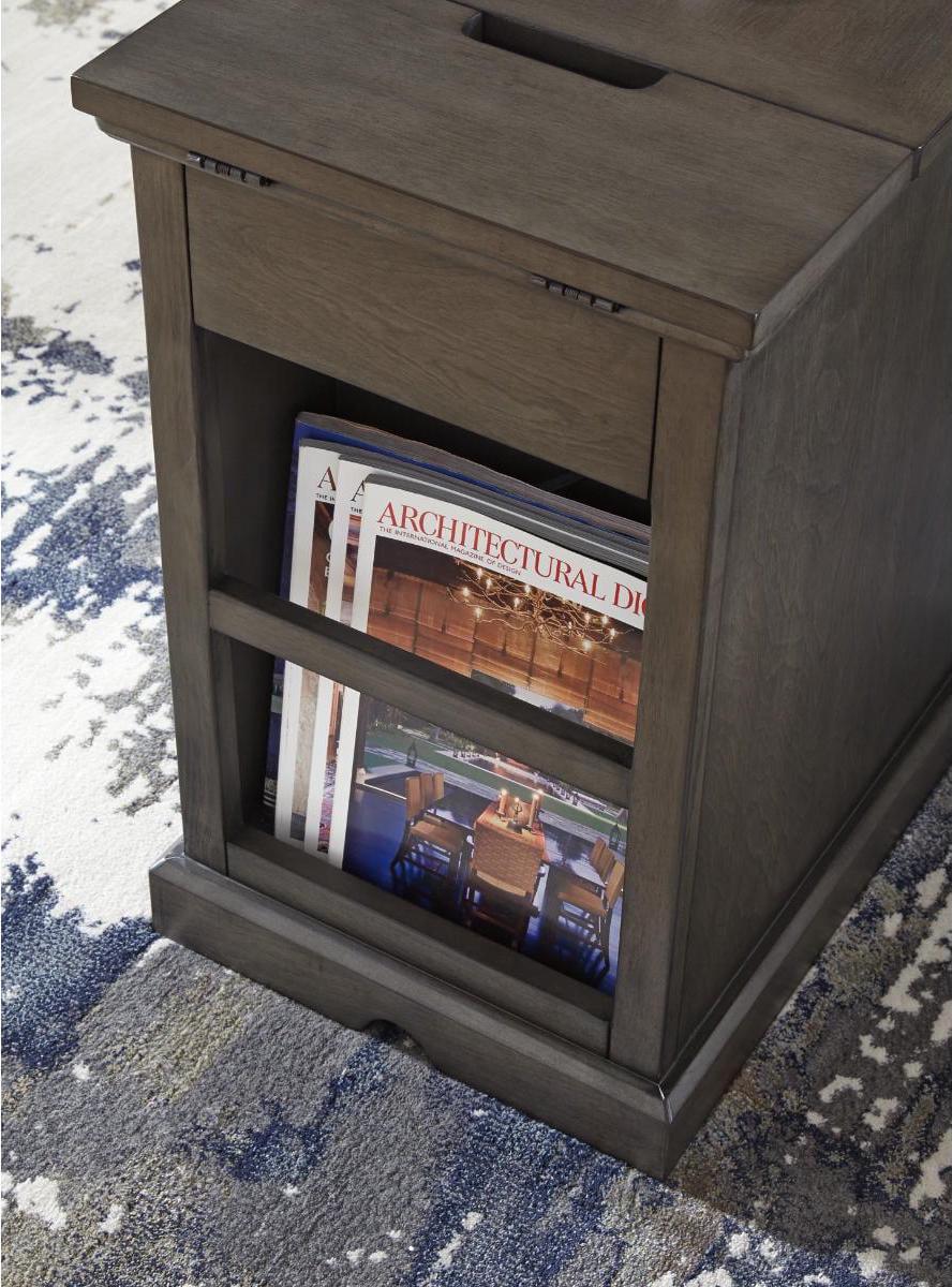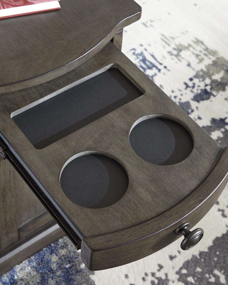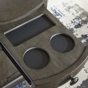 So much form and function in a beautifully compact piece of furniture. The richly styled Laflorn chairside end table puts it all within reach, including a flip-up top panel revealing a power port perfect for keeping your phone or laptop charged. Hidden twin cup holders and interior shelved storage are also a welcome surprise. With an attractive gray-tone finish, this piece easily complements other furnishings.
