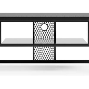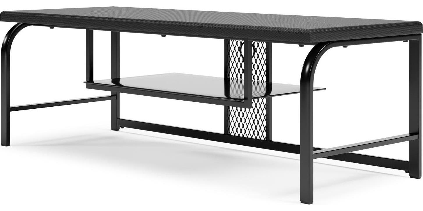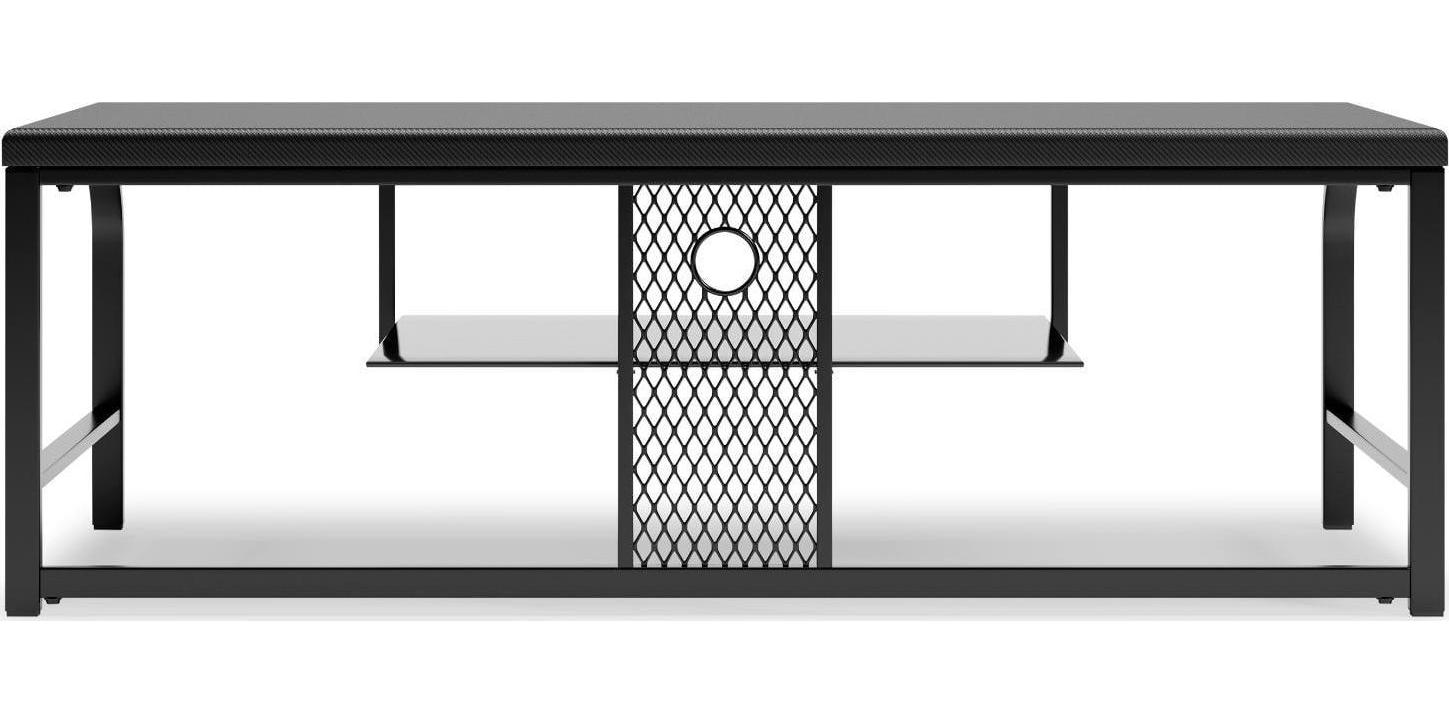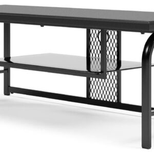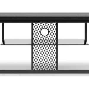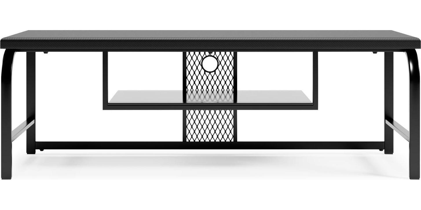 The ultra-stylish and contemporary Lynxtyn TV stand is right in tune with your way of living. Its sturdy metal frame includes a satin dark gray metallic finish and engineered wood top. Tech-inspired decorative laminate surface with softly profiled edges and a suspended black glass media shelf perfect the aesthetic. This TV stand, which includes a mesh modesty panel for convenient cord management, makes a great gaming setup, too.