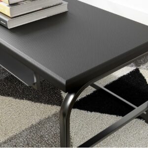 Sturdy metal frame with engineered wood top,Satin dark gray metallic finish,Tech-inspired decorative laminate surface with softly profiled edges,Suspended black glass media shelf,Mesh modesty panel for convenient cord management