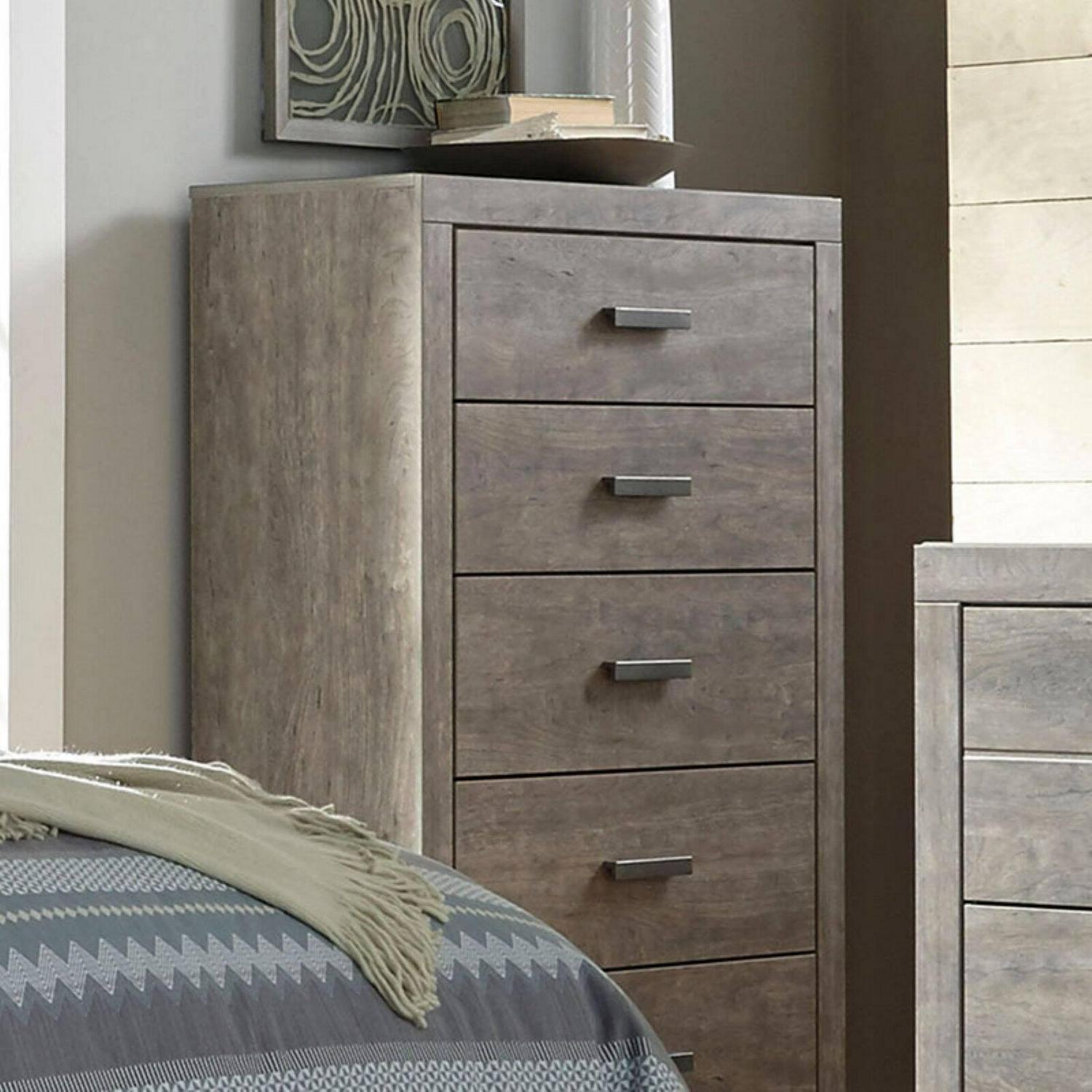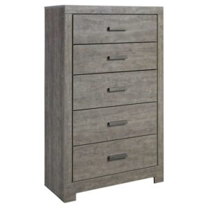You’ll fall in love with the ethereal aesthetic of the Signature Design by Ashley Culverbach 5 Drawer Chest. It boasts quality engineered wood and veneer craftsmanship along with a smooth gray finish. Five drawers with faux linen linings offer plentiful storage space for clothes, bedding, and other items. Sleek satin nickel handles adorn each of the drawers of this chest.