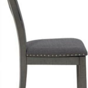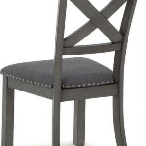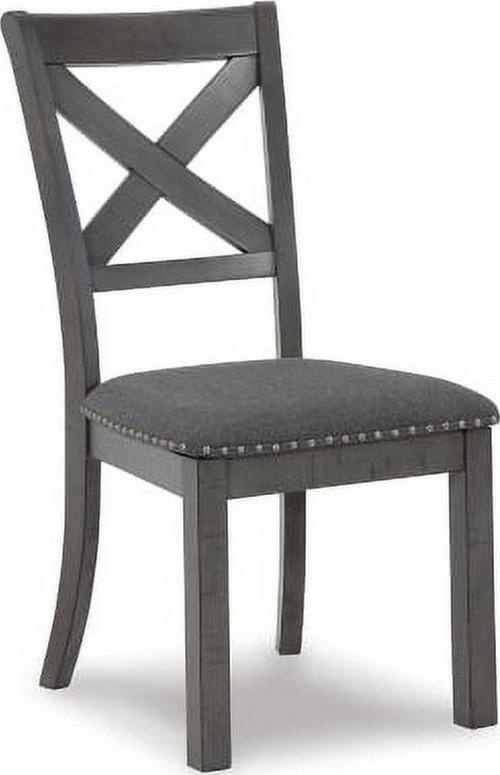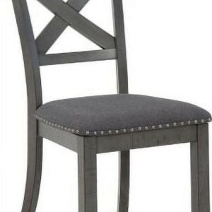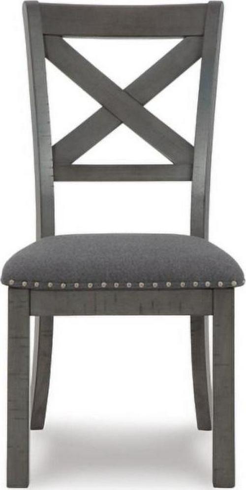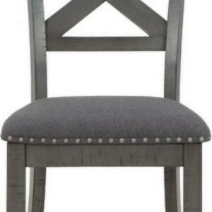 Going gray in the best possible way. The Myshanna upholstered dining chair wows with an utterly on-trend smoky gray finish and X-back styling. Its softly cushioned seat with gray textured upholstery and nailhead trim will have you lingering a little longer at mealtime. Just a touch of distressing helps it fit right in with your modern farmhouse decor.