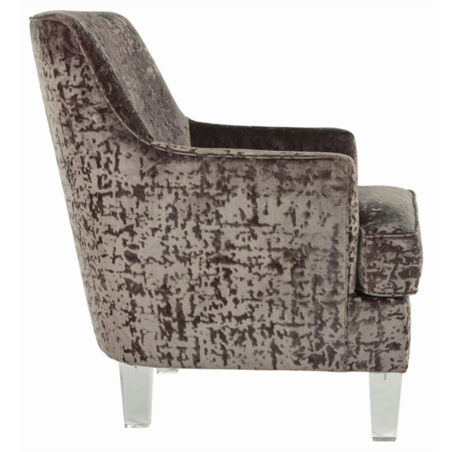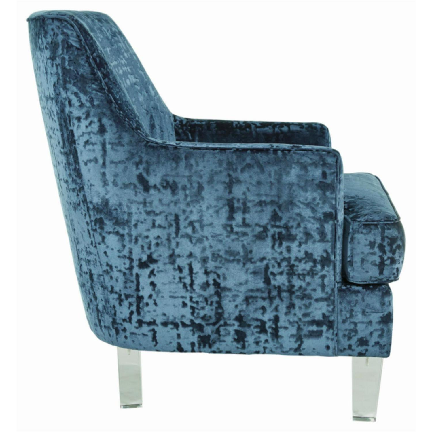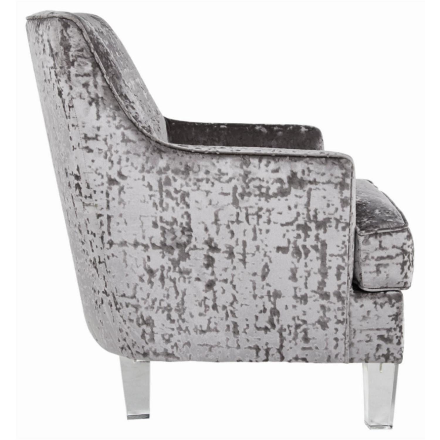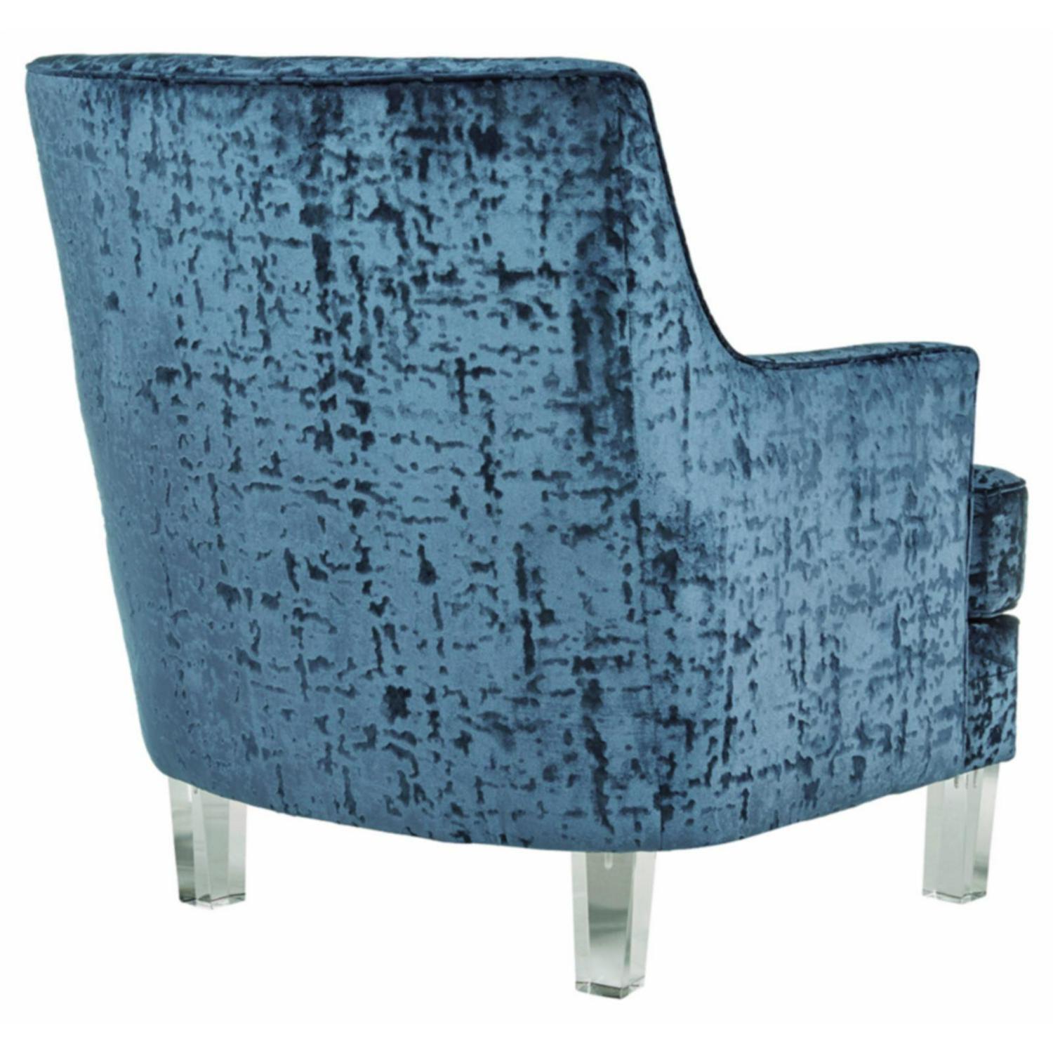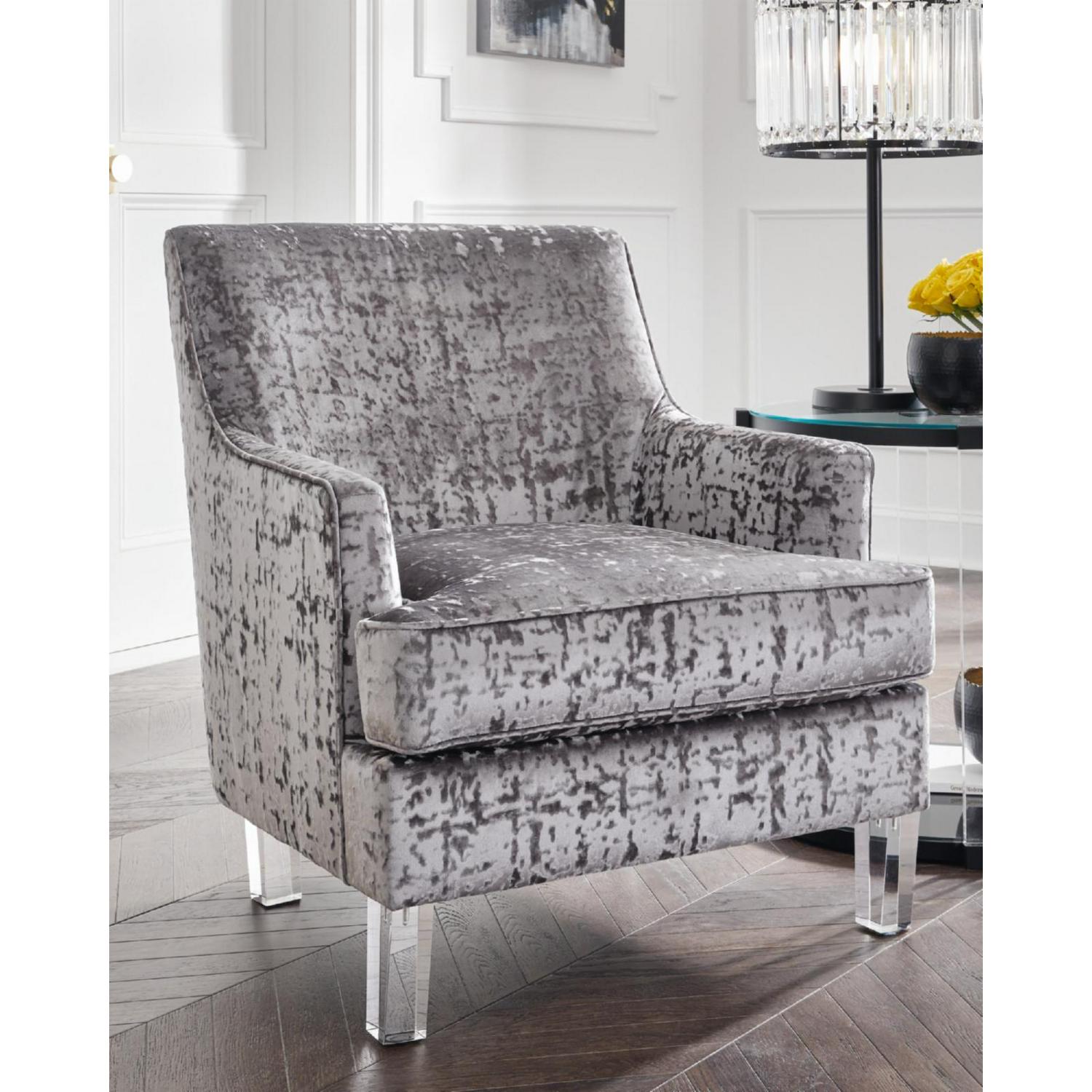 The Gloriann accent chair with shelter arm styling merges contemporary and traditional styling in the most beautiful way. The combination of polyester crushed velvet upholstery and tapered clear acrylic legs makes for one cool contrast. Combining comfort and fashion-forward design for the modern enthusiast.