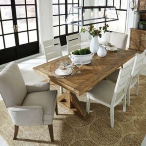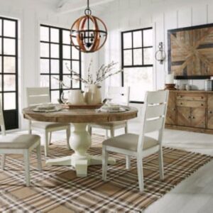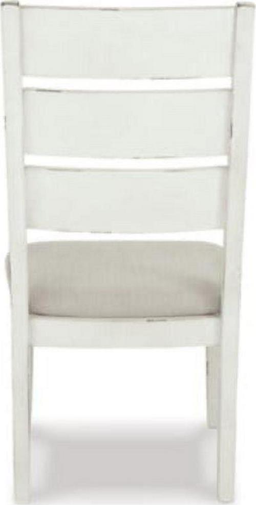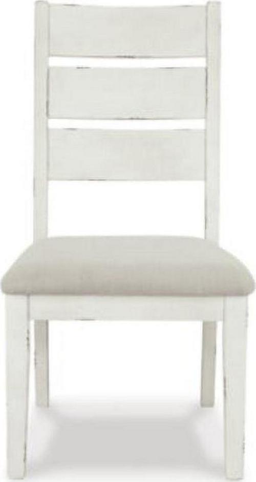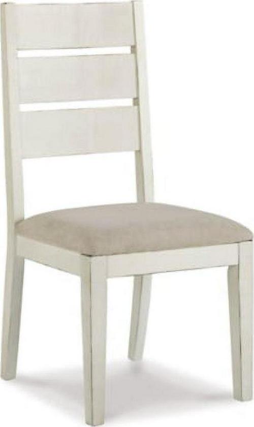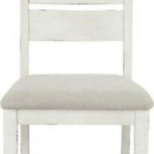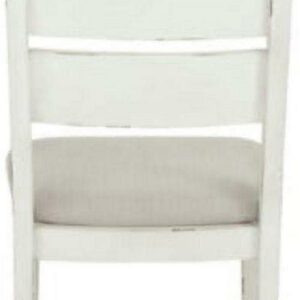 Comfortable and functional. Grindleburg upholstered dining chair is a well-designed country cottage inspired piece. Wood frame with textured white finish showcases supportive broad ladder back design. Seat cushion is upholstered in a stunning light gray. Easy-to-clean Nuvella fabric is bleachable and incredibly colorfast, even in sunlight. This innovation eases your worry when food takes a plunge from your heartwarming farm to table meals.