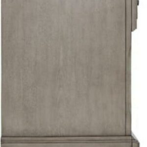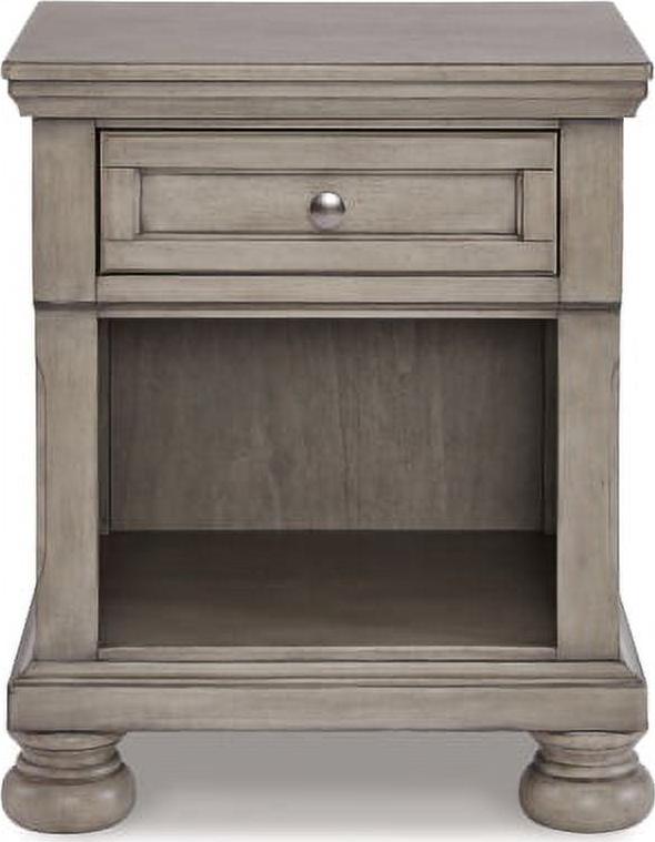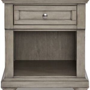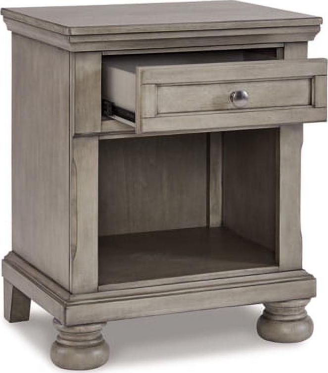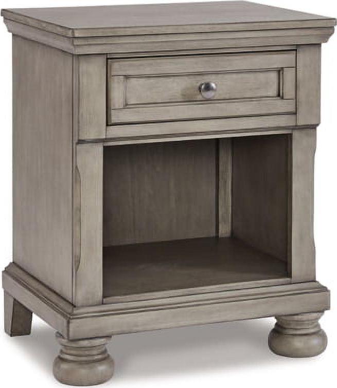 Satisfying your taste for tradition, the Lettner nightstand sports serene sophistication. Forever classic design details inlaid panels, silvertone patina hardware and bun feet are so easy to love. Burnished light gray finish elevates the look with modern sensibility. Drawer and open cubby space beautifully accommodate your bedside storage needs.
