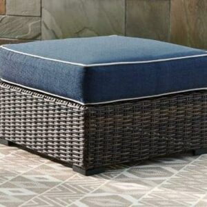 Outdoor ottoman with cushion,All-weather resin wicker handwoven over durable aluminum frame,Powder coated aluminum resists rusting and fading,Zippered cushion covered in high-performing Nuvella fabric,All-weather foam cushion core wrapped in soft polyester