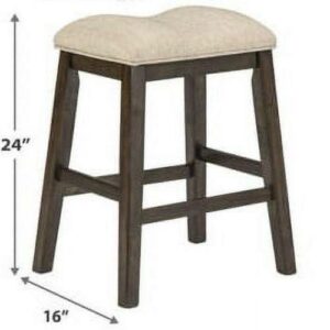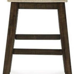 Love a modern farmhouse sensibility Saddle up with the Rokane upholstered stool. Its sturdy wood frame with rough sawn texture is topped with a sumptuous saddle seat covered in a light brown textured fabric for a relaxed look and feel.