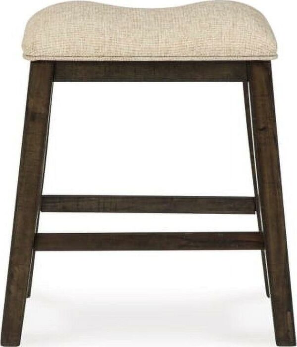 Love a modern farmhouse sensibility Saddle up with the Rokane upholstered stool. Its sturdy wood frame with rough sawn texture is topped with a sumptuous saddle seat covered in a light brown textured fabric for a relaxed look and feel.
