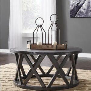 Make it bold and beautiful when you round up the rustic style of the Sharzane coffee table. You’ll love the casual look that’s delivered through its transitional design. A drum shape with repeated “X” motifs form a unique base and the round top has a planking effect full of detail in a weathered finish. Saw kerf detailing adds notable character to each of the “X” motifs in the table’s base what a plus for creating a relaxed, rustic setting in your living area.