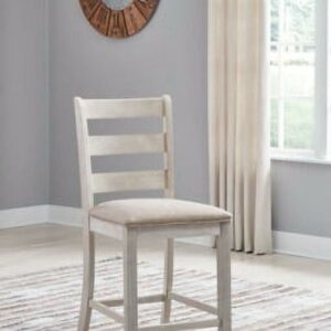 The Skempton upholstered bar stool invites you to raise the bar on small space living. An inspired choice for coastal chic or modern farmhouse settings, this comfortably cushioned bar stool with classic ladderback styling sports a grayish white finish with rub through effect for timeworn appeal.