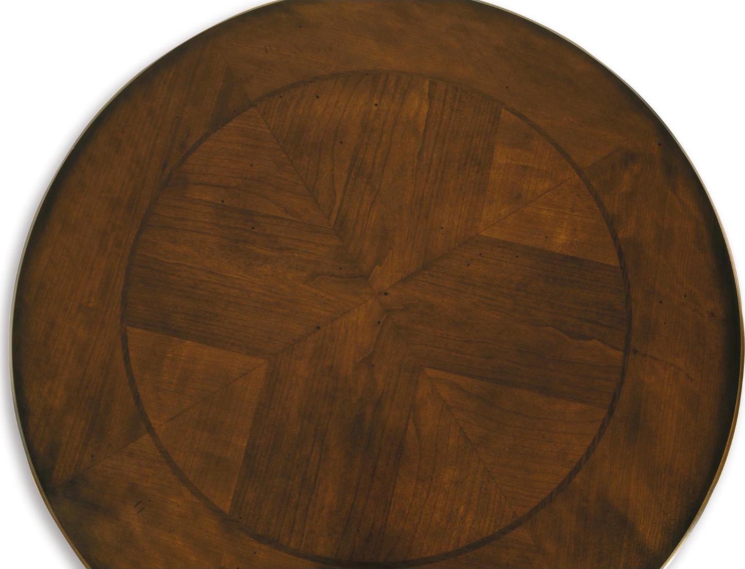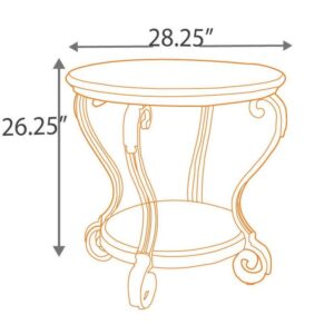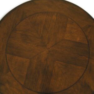 If there s an accent piece with a flair for making traditional elements look so fit for modern-classic settings the Nestor round end table is it. It s hard to not fall for the elegance and intricacy of acanthus leaf carvings and shapely serpentine legs. Bathed in a toasty finish with oil-rubbed accents, the tabletop and bottom shelf are top shelf for warmth and high-end rustic appeal.