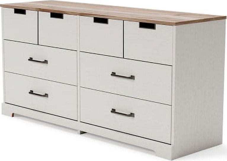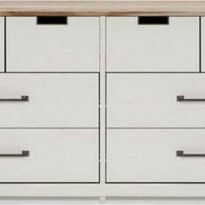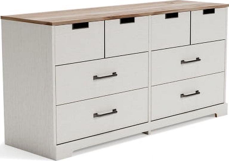 Dresser only,Made with engineered wood (MDF/particleboard) and decorative laminate,White painted finish with subtle replicated wood grain,Top with warm brown finish over replicated elm wood grain,Top drawers with metal detailed openings