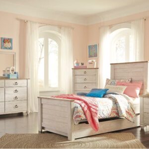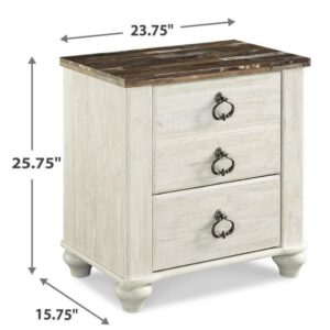 The Willowton nightstand is the ultimate statement piece for your coastal cottage or shabby chic inspired retreat. Whitewashed finish on the drawers and sides is wonderfully easy on the eyes. Paired with the unique plank-effect top, it s a driftwoody look that has our minds drifting away to beachy-keen escapes.