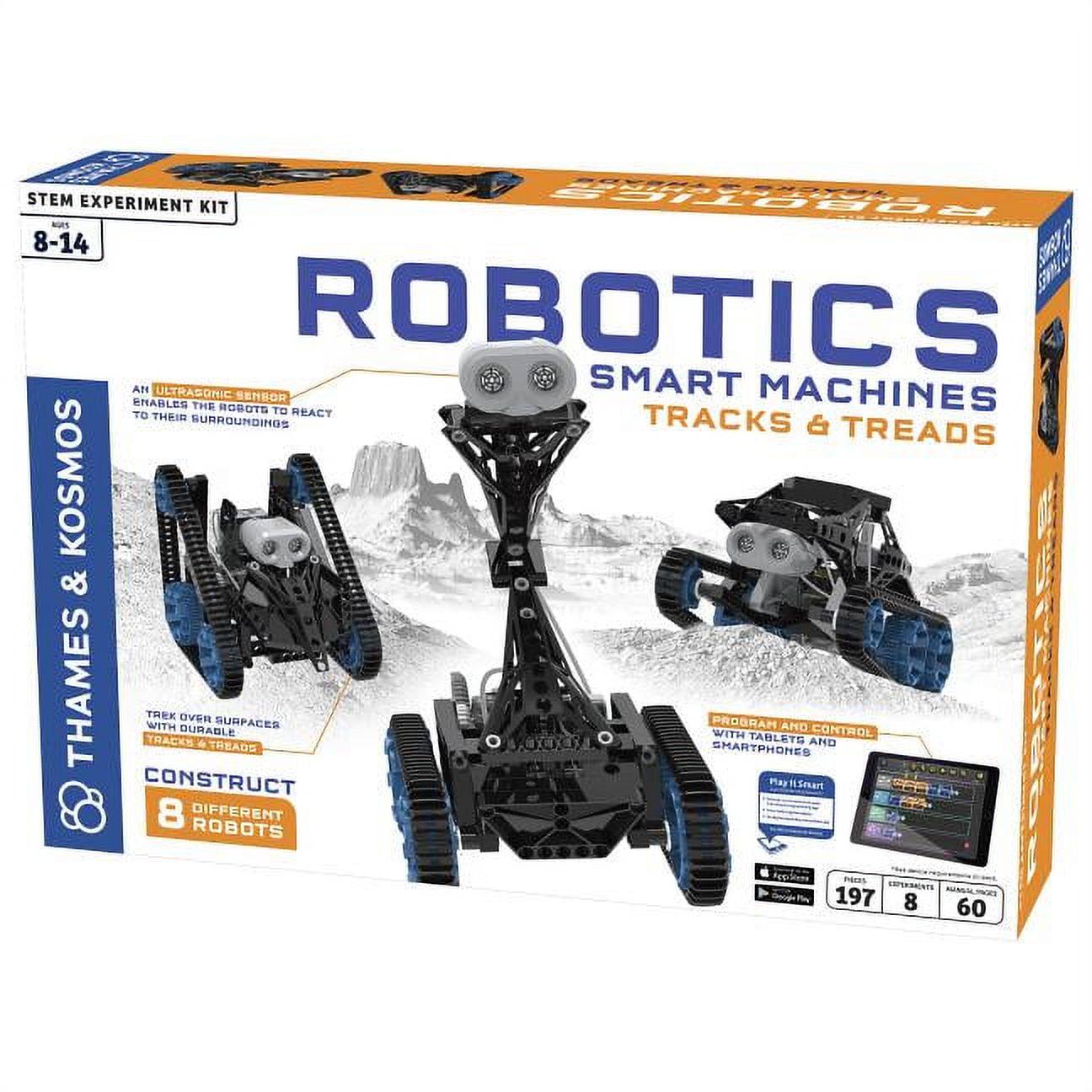 The latest installment in the award-winning Robotics: Smart Machines line, this version focuses on motorized machines that make use of continuous tracks, also known as tank treads, to move themselves and other objects around. Models are controlled by programs and an ultrasound sensor, so in addition to constructing the machines, youll also learn how to use the included visual programming app on your tablet or smartphone to code the programs yourself! Build a robot with two large continuous tracks that drives around and avoids obstacles in its path. The attentive tracker bot model detects your hand, moves toward it, and follows it around. Construct models of real-world smart machines, like a conveyor belt robot that carries small objects and an escalator model that carries objects up to another level. You can also assemble other fun robots including a dozer bot with a bulldozer attachment on its front end and a fire rescue robot that drives its ladder up close to other objects. Once you understand how the technology works, you can build your own robots using the kits 197 building pieces and create your own programs in the programming app, which is available on iOS and Android devices (tablet or smartphone required, not included).