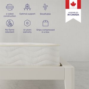 Set the stage for some shut eye with the Signature Sleep Solace 6″ Flippable Twin Spring Mattress in a Box. This medium firmness level tight-top mattress combines heavy-duty Bonnell innerspring coils, thick dual-sided polyester pads, and a cozy quilted cover to give side, stomach, and back sleepers preferred soft body-hugging comfort and firm spinal support. Its thin 6-inch height and low profile perfectly accessorizes your twin size daybed, trundle bed, child’s bunk bed, teen’s loft bed and even guest bedroom or RV camper. And its lightweight reversible 2 sided construction lets you flip it over for use on both sides to lengthen mattress life while preventing sagging. Skillfully assembled in Canada, this eco-friendly mattress is crafted using 50% regenerated fibers for less waste to benefit the environment. The kid-friendly Solace has also earned GreenGuard Gold Certification by meeting rigorous indoor air quality standards for a safe and healthy home. Bonus, this value bed-in-a-box ships straight to your door for easy handling. Start enjoying moments of Solace!