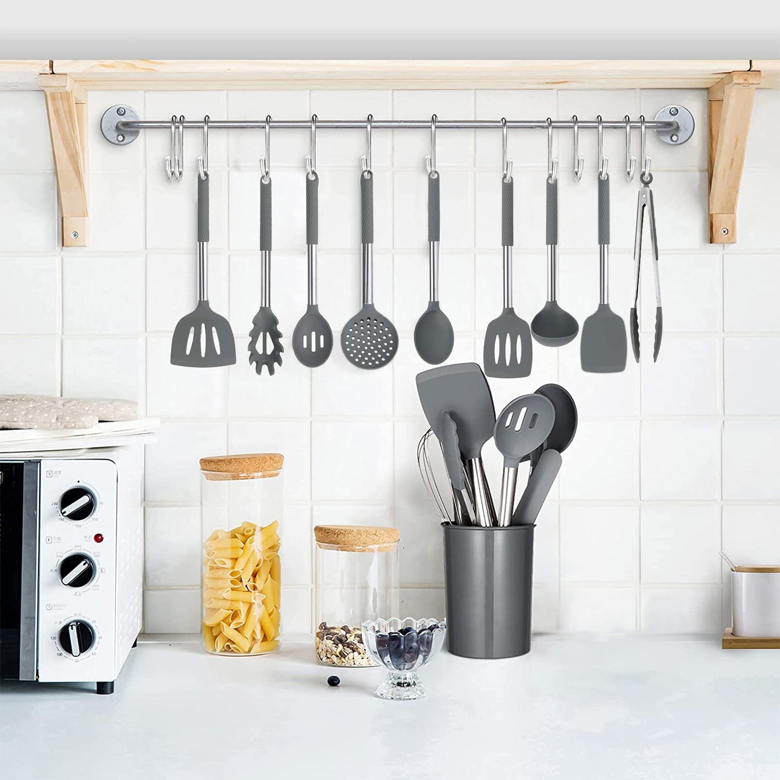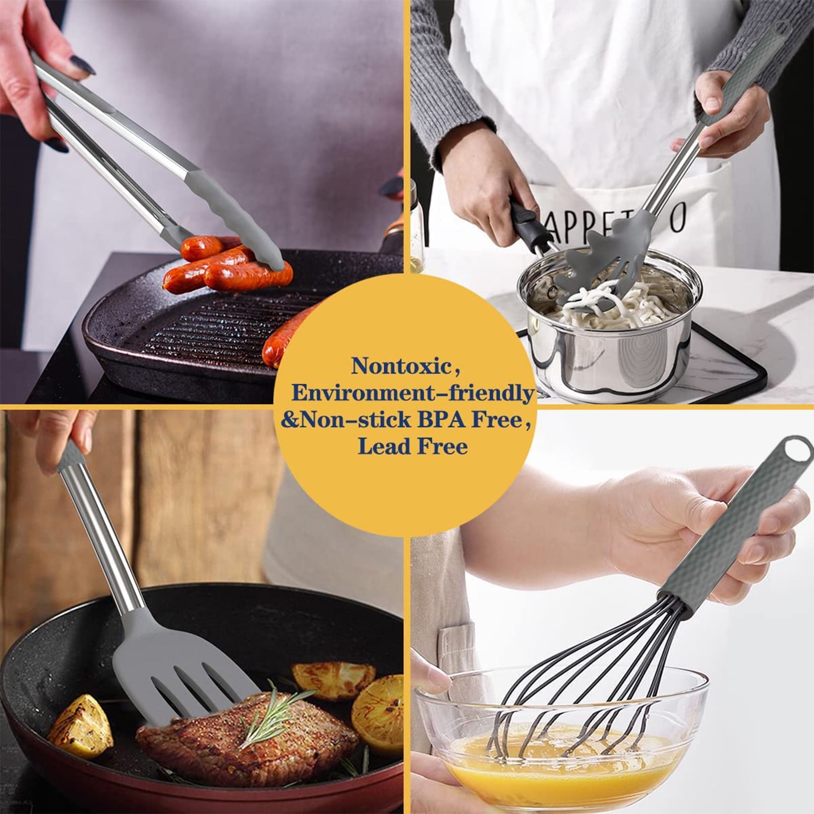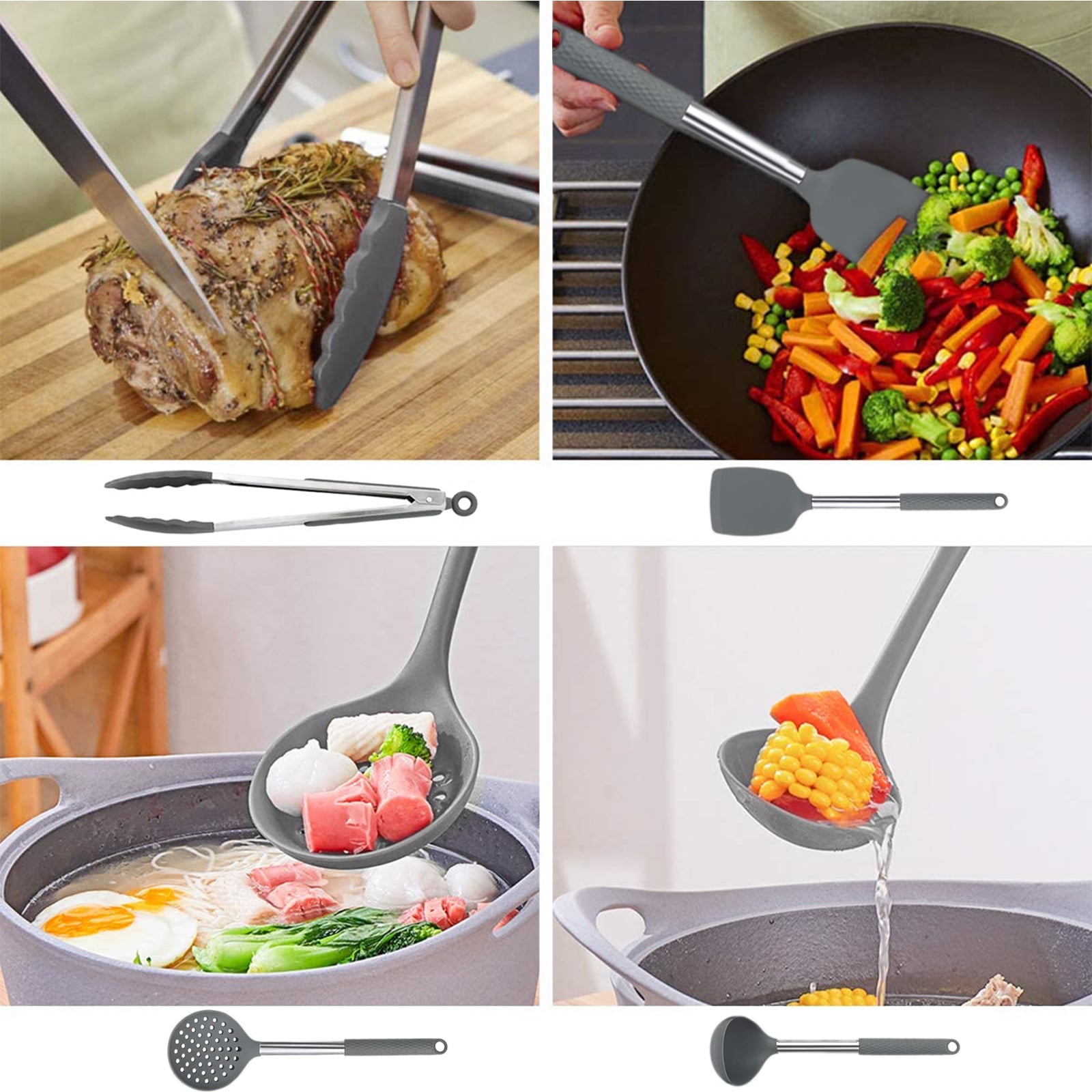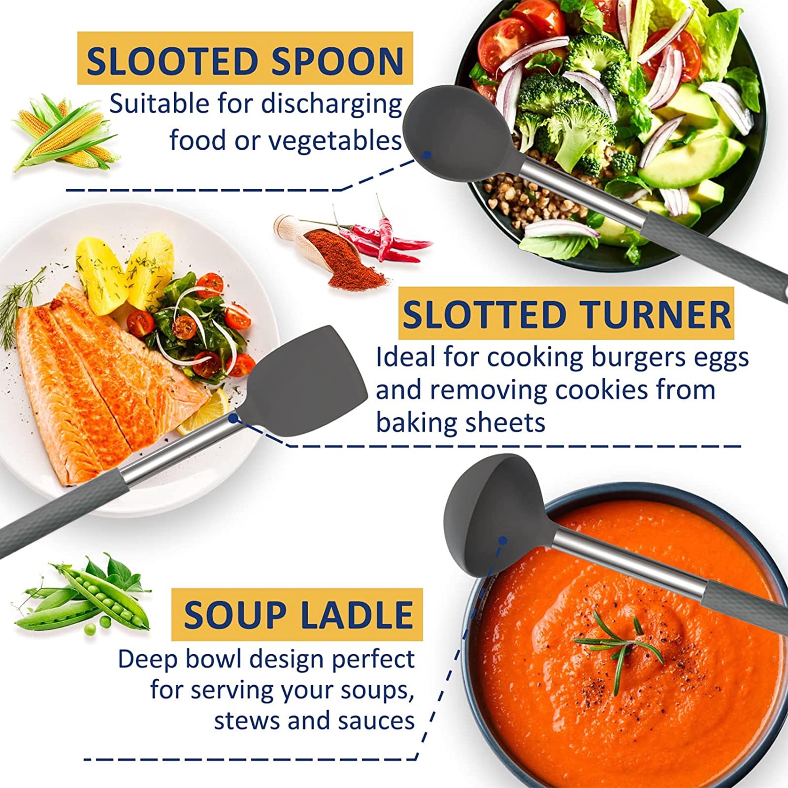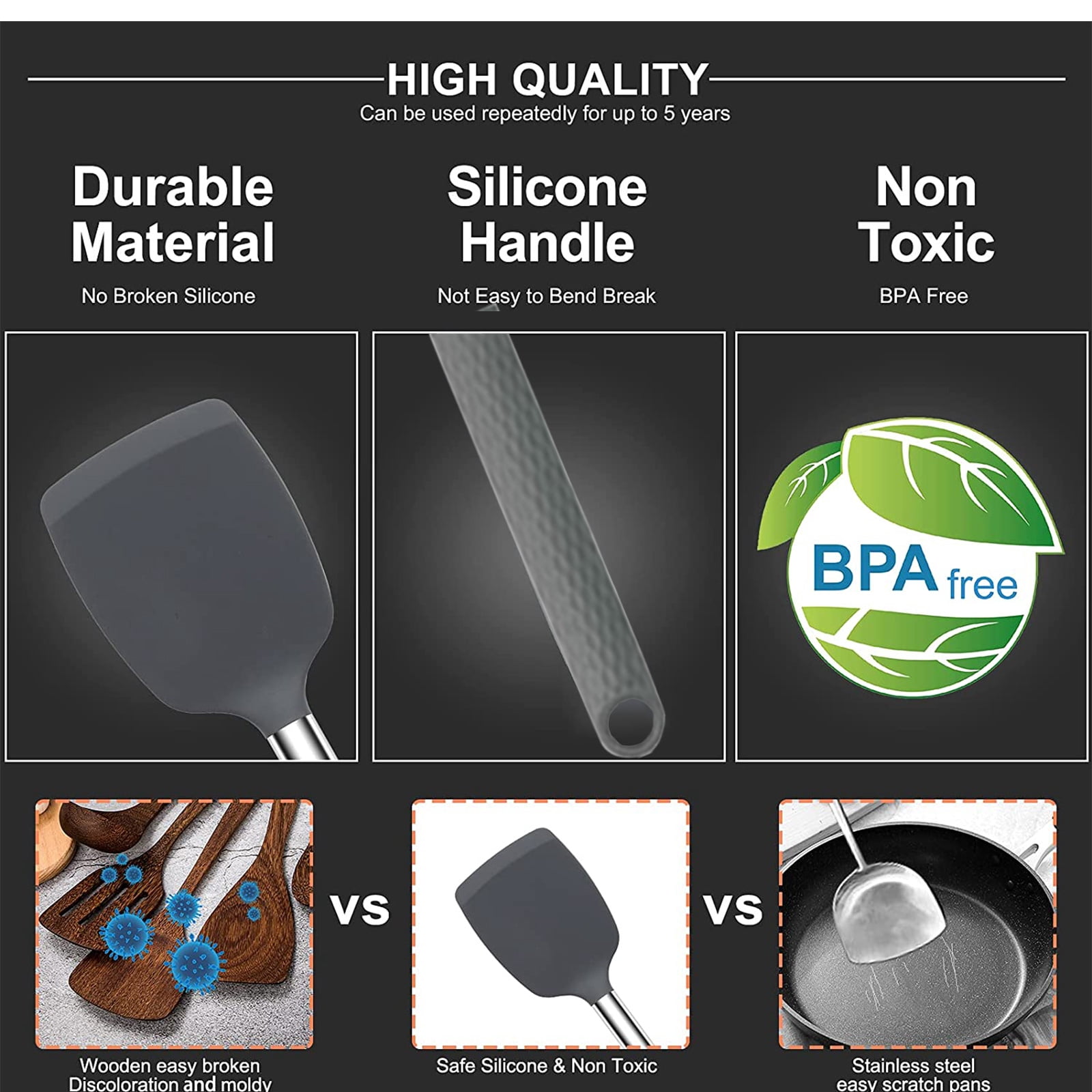✅30 PCS PROFESSIONAL SILICONE KITCHEN UTENSILS SET: Silicone Kitchen Utensils Set includes slotted turner, solid turner, deep soup ladle, pasta server, flexible spatula, spoon spatula, spreader spatula, slotted spatula, bating brush, egg whisk, slotted spoon, solid spoon, kitchen tongs and holder. Also comes with 5 pcs measuring spoons of different sizes, 10 pcs Hooks. Meet your all kinds of kitchen needs. 30 Pcs different Utensils making your cooking much interesting and easier ✅STAINLESS STEEL HANDLE & FOOOD GADE SILICONE: Made of food-grade silicone, safe for any type of food. Firm silicone heads, sturdy stainless control and fantastic grip, premium quality heat-resilient silicone heads, designed to protect the non-stick surface of your precious pans. This will keep your cookware safe from scratching, BPA free. No rust. No breaking or bending. No melting. not produce any hazardous fumes.Anti scalding silicone handle sleeve protect your hand from burning. ✅HEAT-RESISTANT & STAIN-RESISTANT & AVOID THE MELT — The Silicone Cooking Utensils can withstand high temperatures up to 446°F/230°C. All-around silicone added to the softness, no longer worry food will stick your cookware. Silicone head protect your pans, keep the cookware surface not scratched or dented. Extend the life of all your kitchen pans ✅EASY TO CLEAN – With stainless steel core never warp. One-piece molding without any gaps to capture food. Make cleaning easier. comparing to the cheap plastic kitchenware, it doesn’t retain odors or colors when you use it for stirring deep-colored food. It’s great gift for anyone who loves to cook, a nice gift set for your friend’s/family’s house warming party/wedding party ✅A GREAT COMPANION IN THE KITCHEN: Prepare for many sessions of exciting cooking! Grill, whip cream, stir sauces, mix ingredients, flip eggs, burgers or pancakes, pan fry or stir fry as much as you wish. No excuses! an extra utensil holder that allow you to store all your kitchen gadget utensil set conveniently, Solid holder base ensures utensils fit properly, circular opening at the bottom ensures that the silicone cooking utensils in the holder is always kept in a dry environment