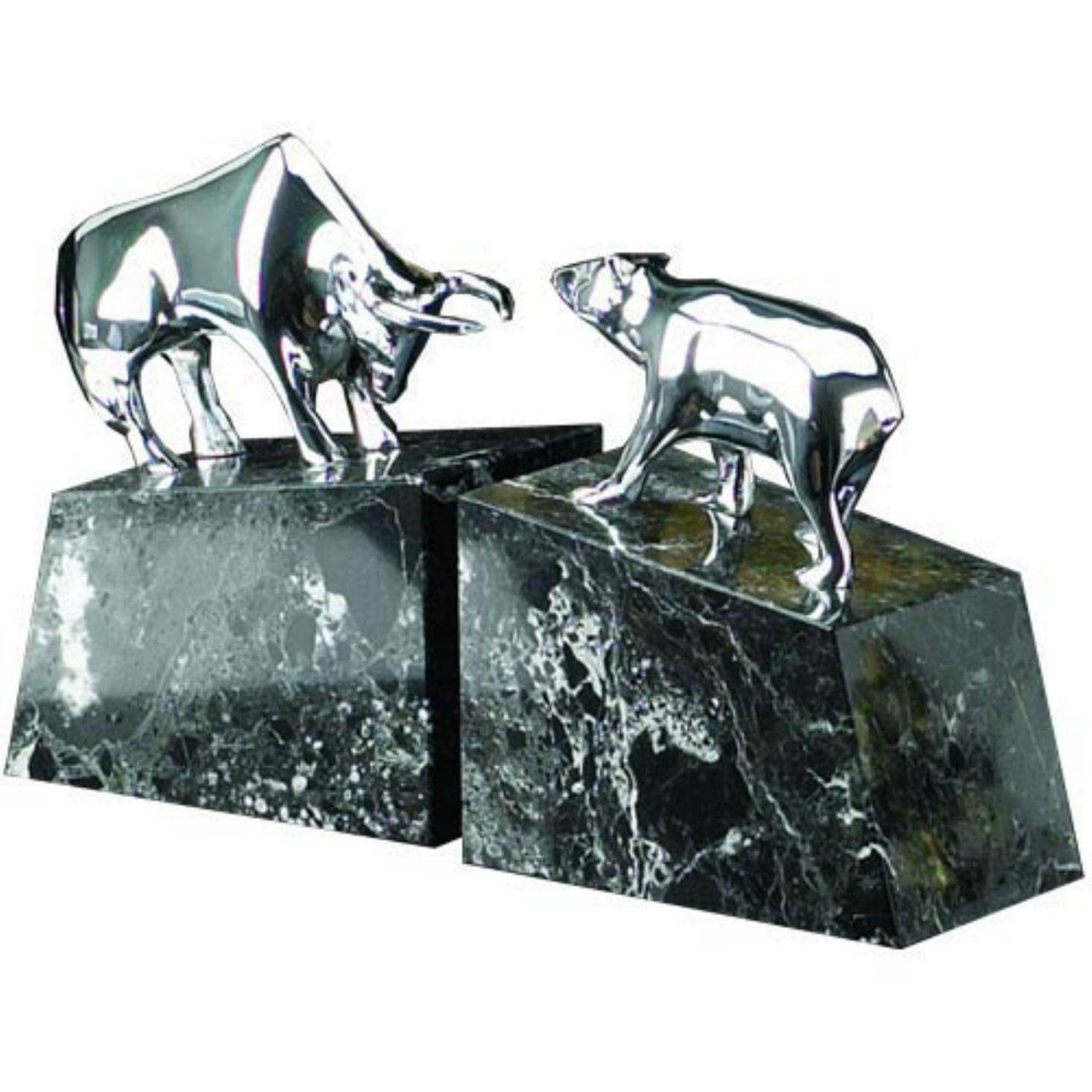 Lend elegance to your office or library with Silver Bull and Bear Bookends. Crafted of solid brass with a lustrous silver finish and set on a black marble base, these exquisite bookends will draw as much enthusiasm as the closing bell at the New York Stock Exchange. The Silver Bull and Bear Bookends are tasteful enough to please the most discerning stockbroker.