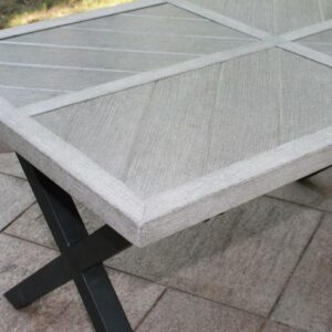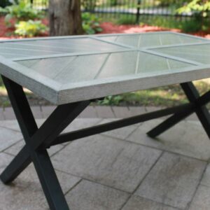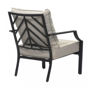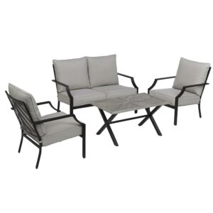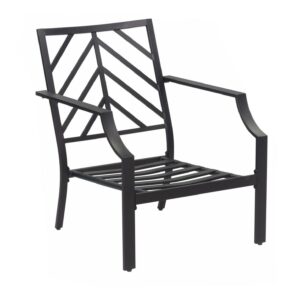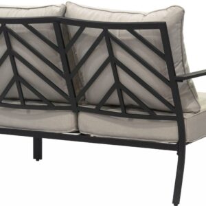 Create a unique look on your patio with the distinctive chevron-inspired openwork design and smooth, slatted surfaces with this 4 piece seating set. With two chairs, a loveseat and a coordinating low table, this metal set features an onyx grey coated frame with coordinating silver cushions. Add interest with the visual chevron story told on top of the x-frame coffee table. From balconies to patios and beyond, the Silver Spring set is the perfect way to style a gathering space you’ll love.