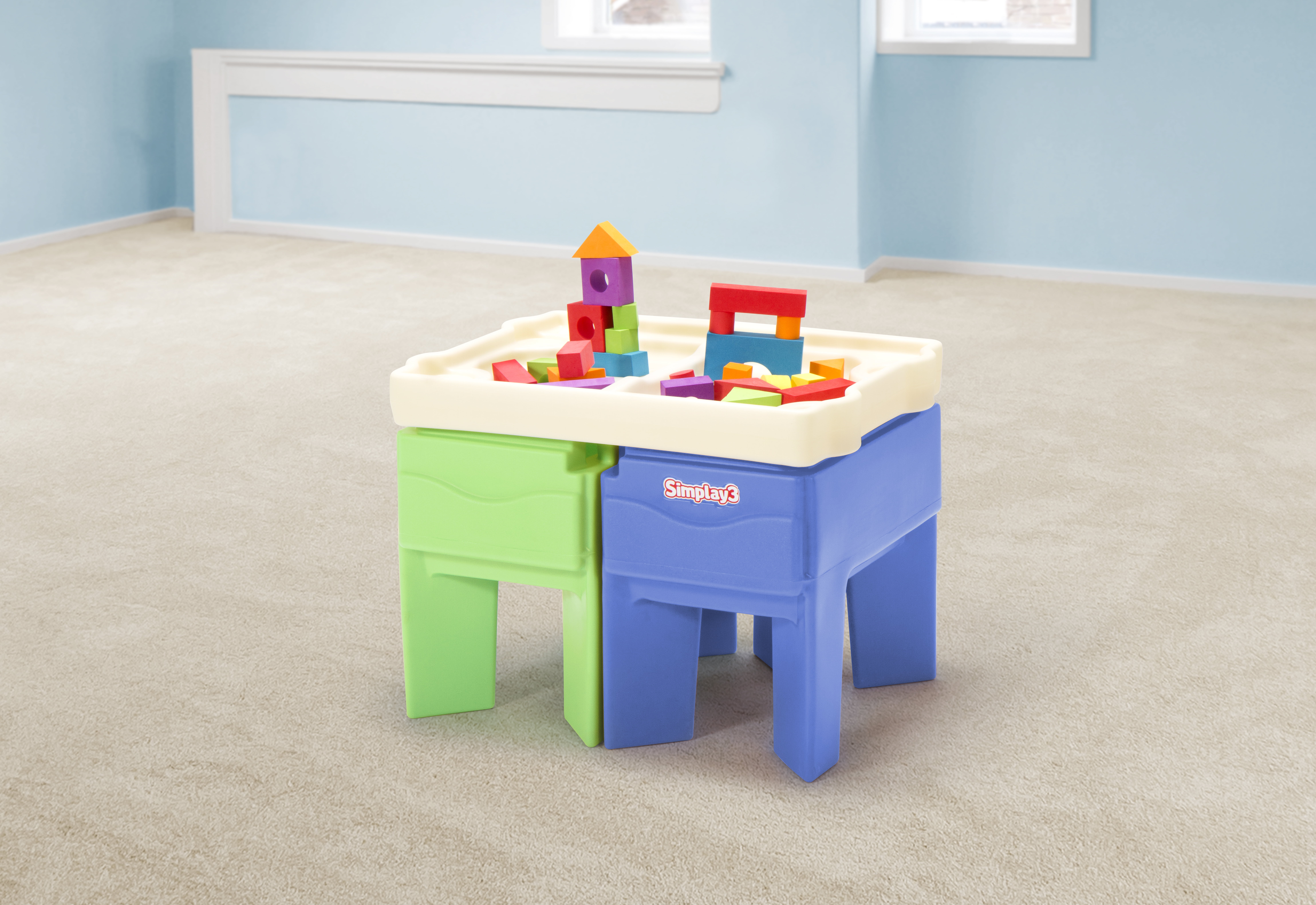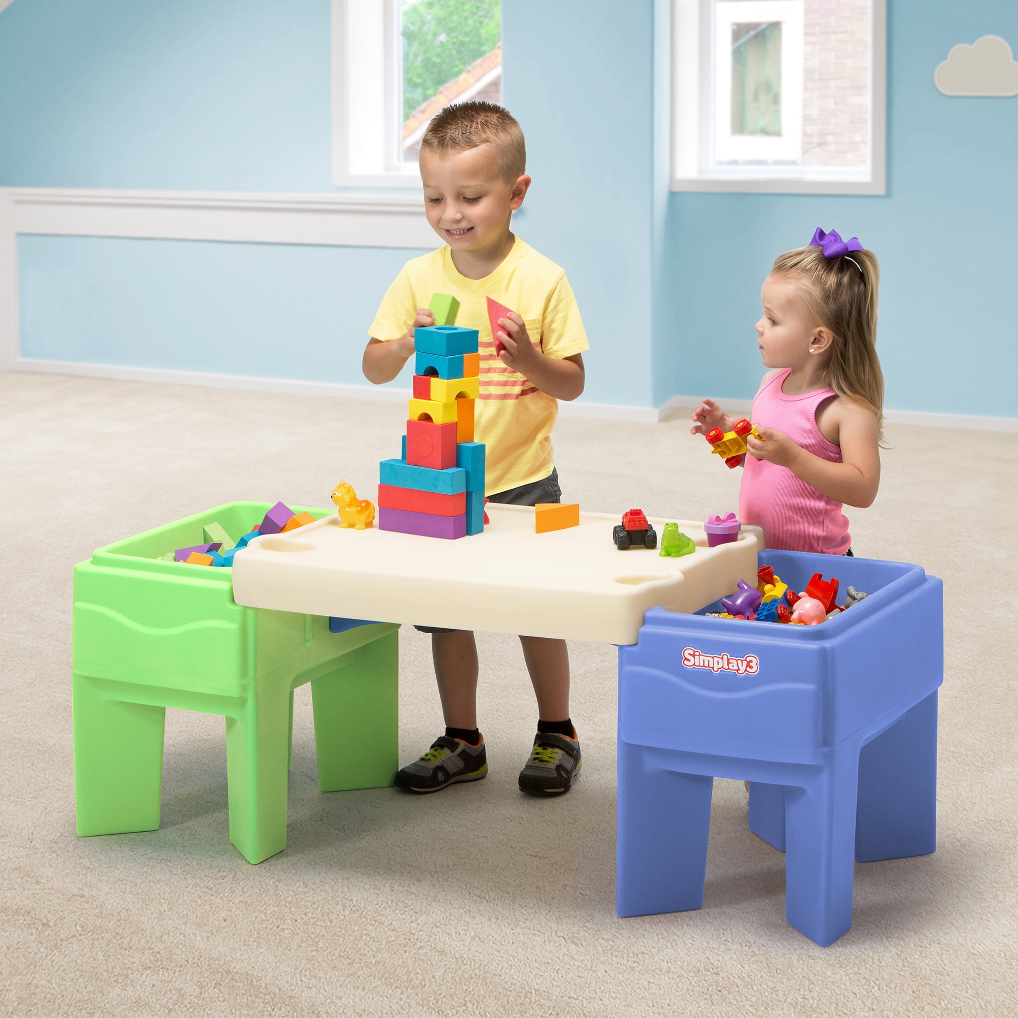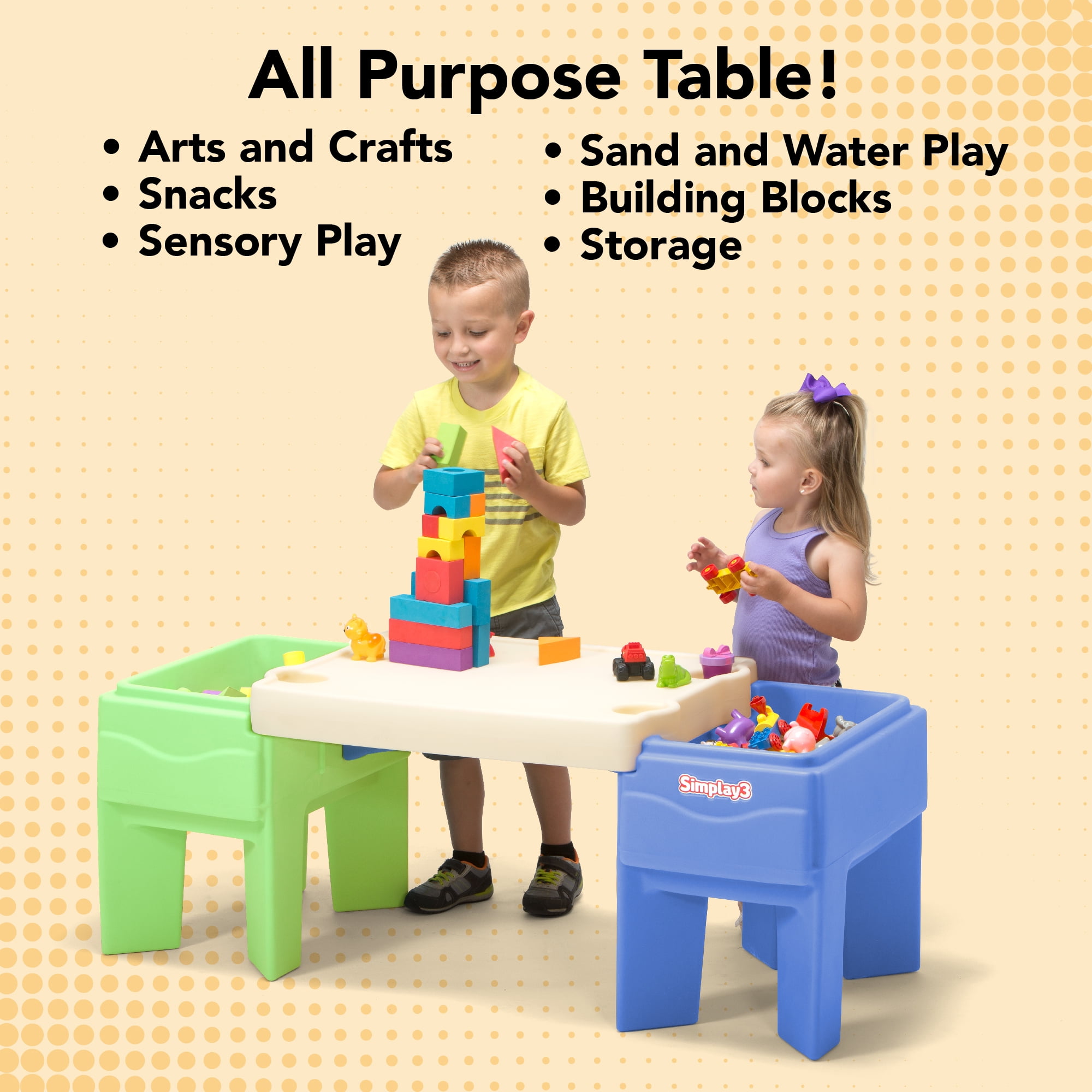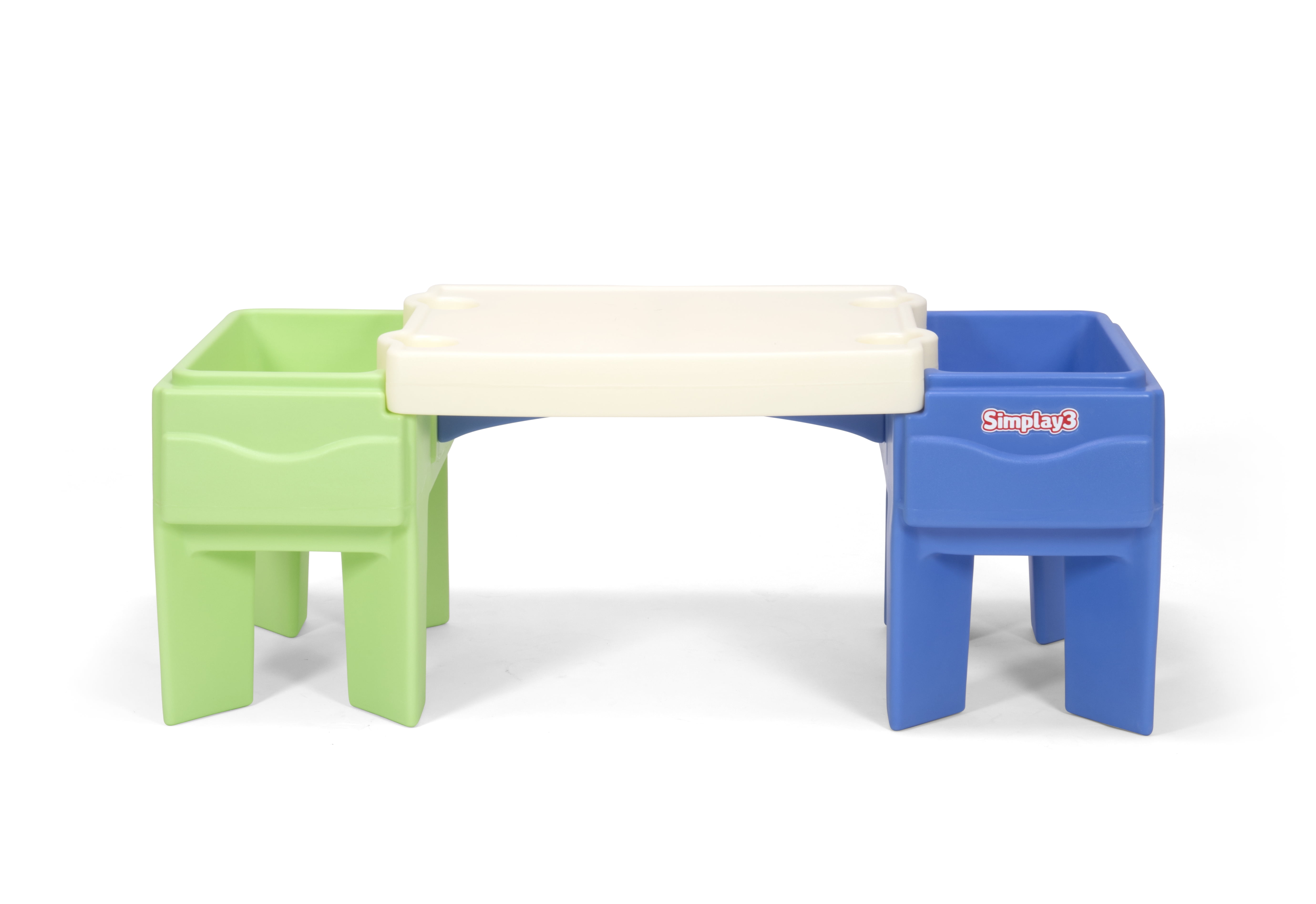 SAND AND WATER: Kids play table features dual sand and water compartments and features a table top that doubles as a sandbox lid to keep your sand dry. ALL PURPOSE ACTIVITY TABLE: Perfect for sand and water play and other sensory play, arts and crafts, building blocks and picnics. Includes 4 cup holders for snack time. LOADS OF STORAGE: When playtime is over, simply store your sand and water toys in the recessed play compartments to be ready for the next playtime adventure. EASY TO ASSEMBLE: Designed with parents in mind, this kids play table assembles in minutes and is easy to wipe clean. MADE DURABLE IN THE Heavy-duty plastic design will stand up to the elements and the toughest playtimes.