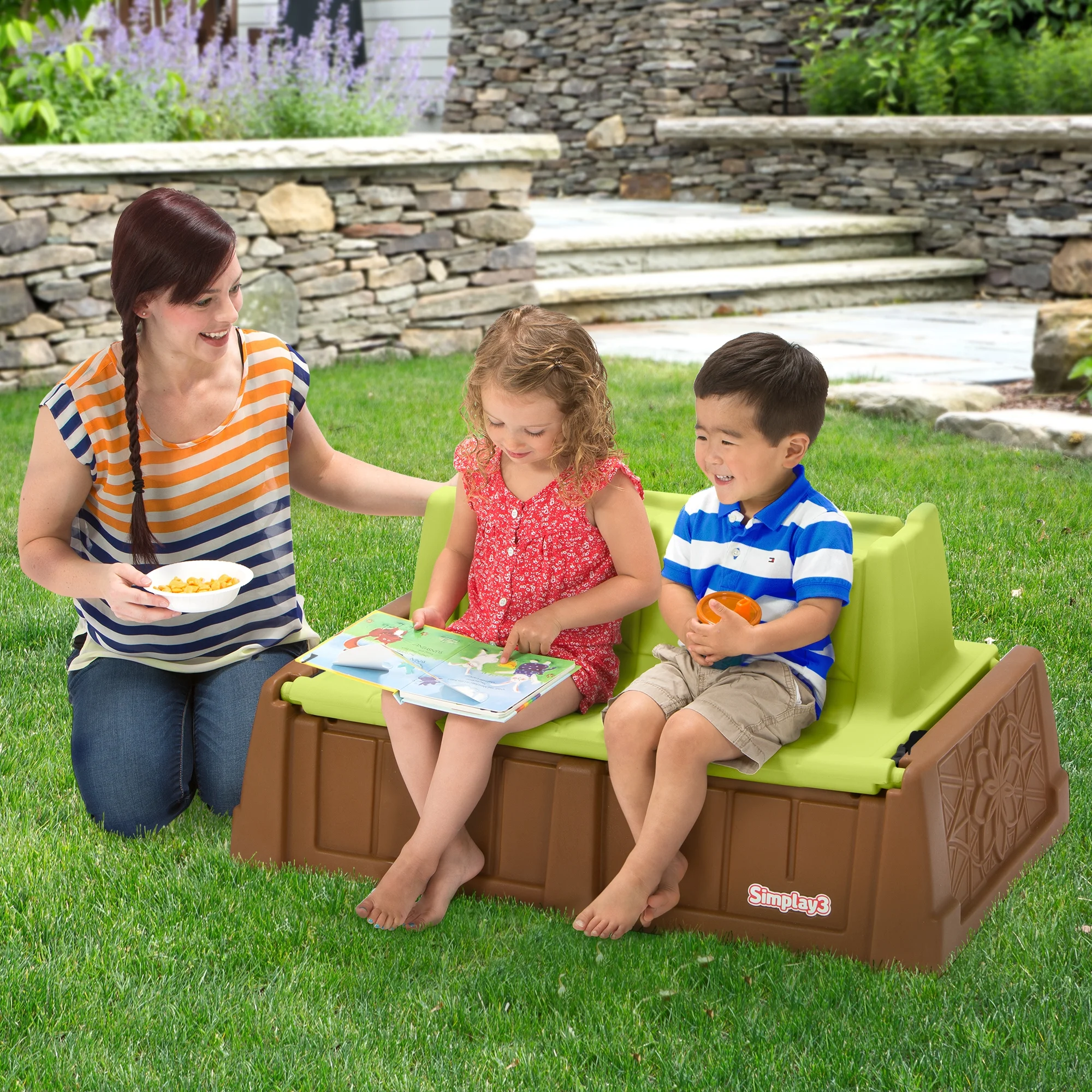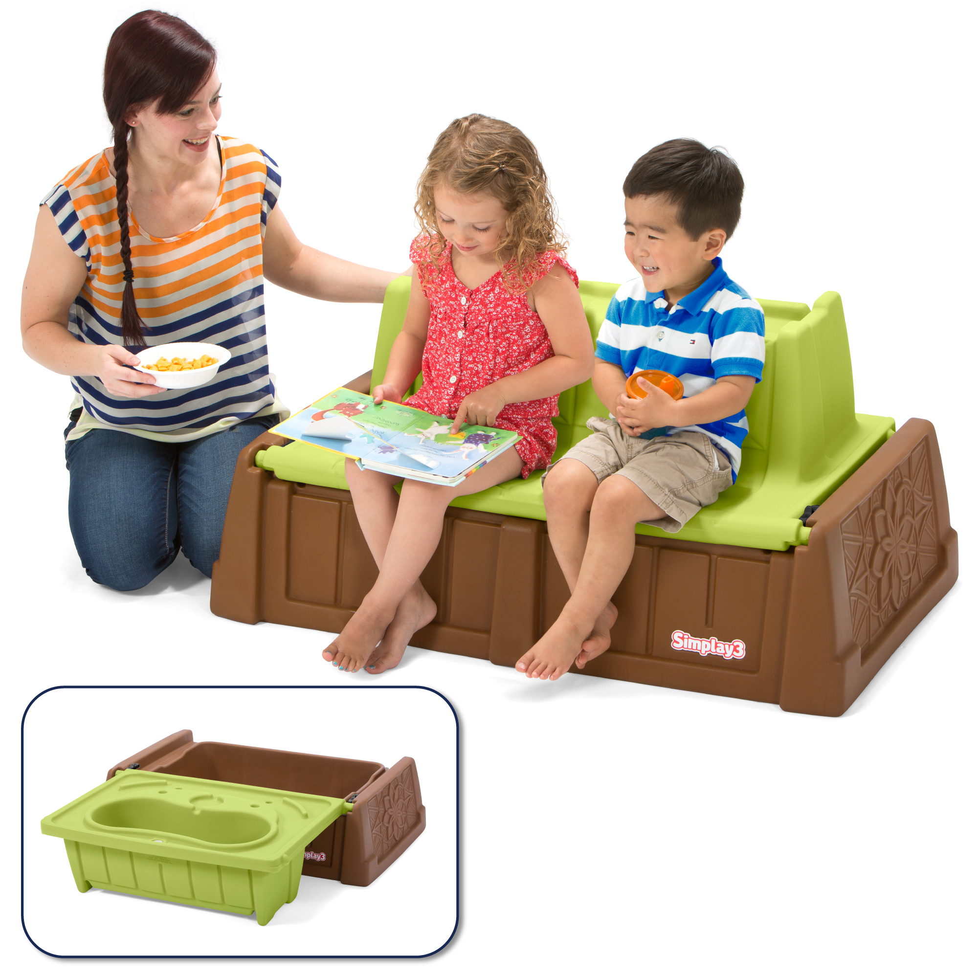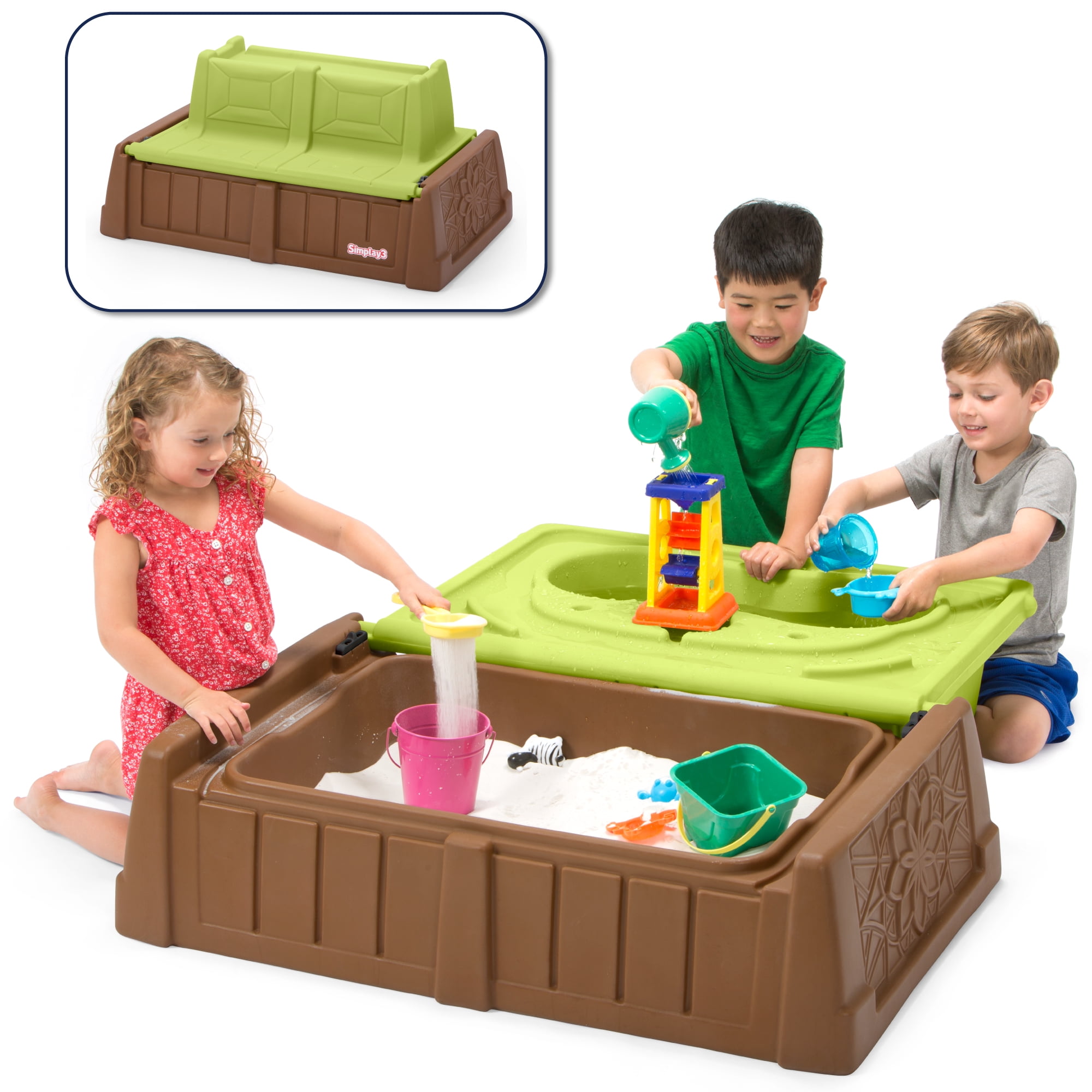 - SIMPLAY3 SAND AND WATER TABLE: Easily flip open the bench seat to reveal a sand and water play table for added outdoor play fun