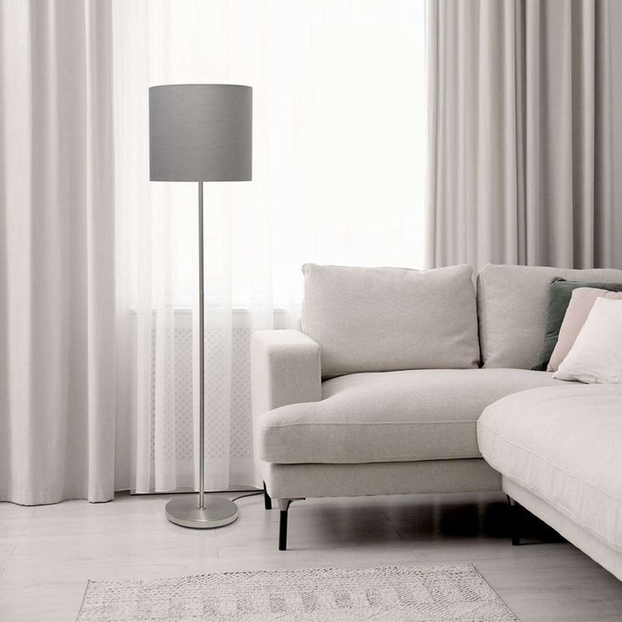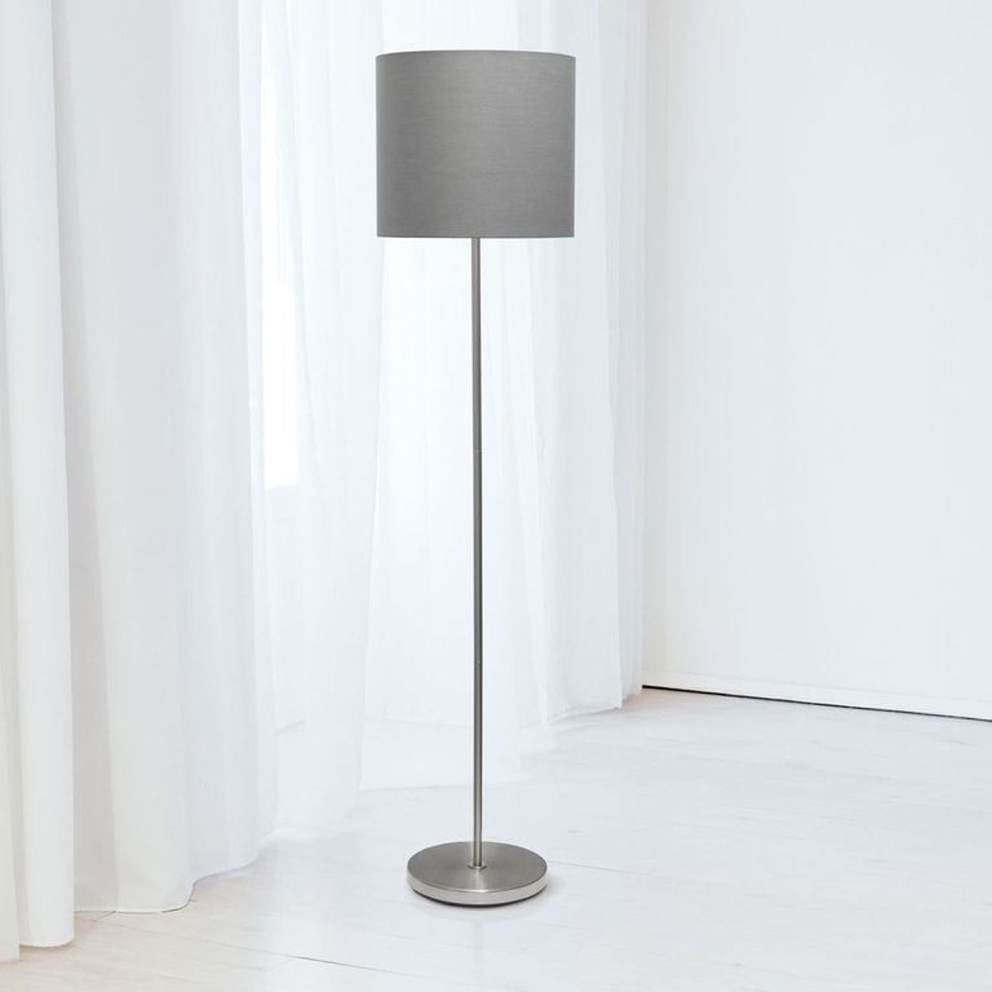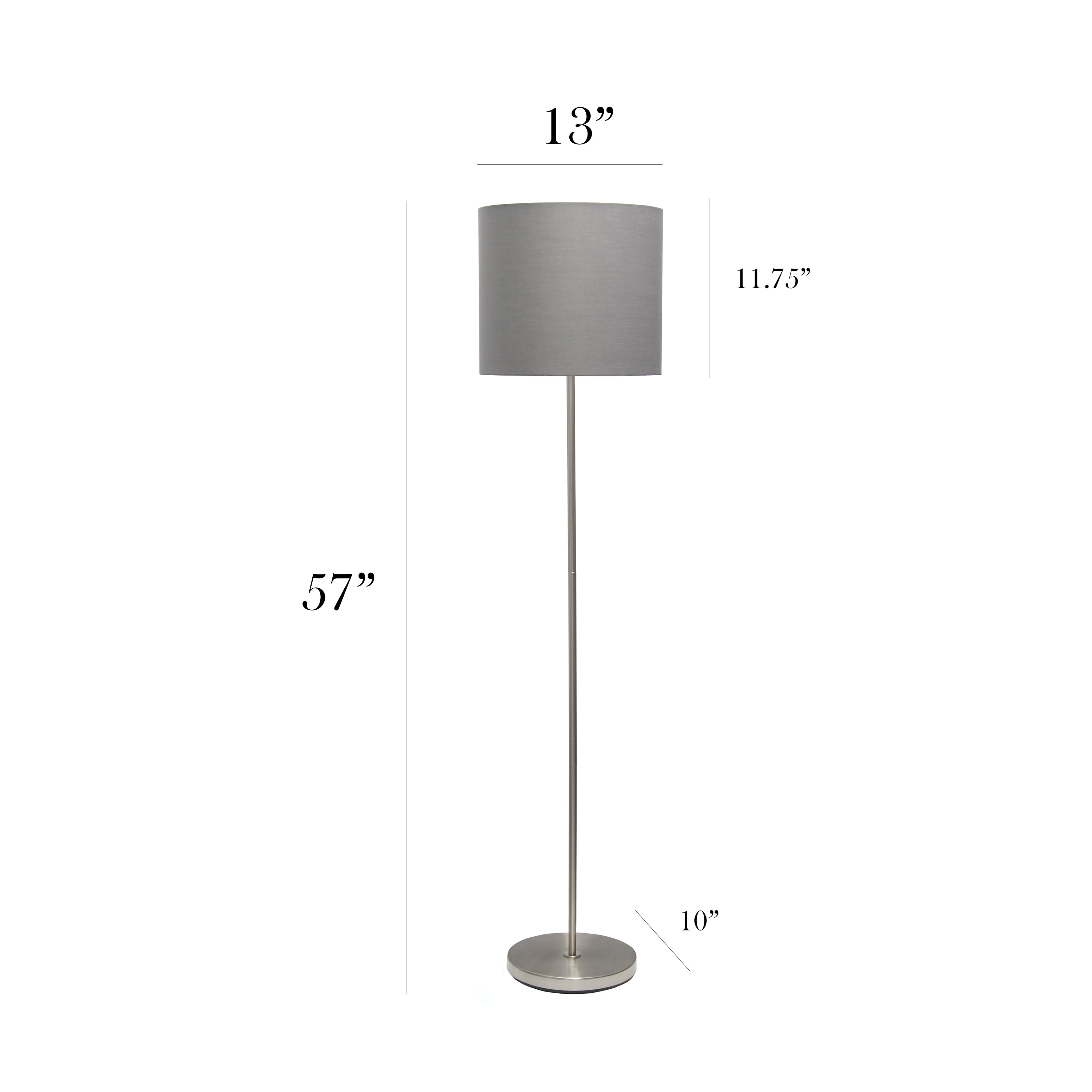 Simply designed to make this floor lamp ideal in your living room, bedroom, foyer, or study! Keep this light at the forefront to display, or tucked away on the side saving space. With a brushed nickel finish and gray fabric shade, it will be the right piece to add to your space! Features: Classic, simple design suitable for any room Brushed Nickel Finish and Fabric Shade Uses 1 x 60 W E26 Medium Base Bulb Foot Switch – Some assembly required Dimensions L:13.5″ x W: 13.5″ x H: 58″ Specifications: Frame Material: METAL Product Color: Brushed Nickel Product Color: Gray Shade Product Dimensions: 58″ H x 13.5″ W x 13.5″ D