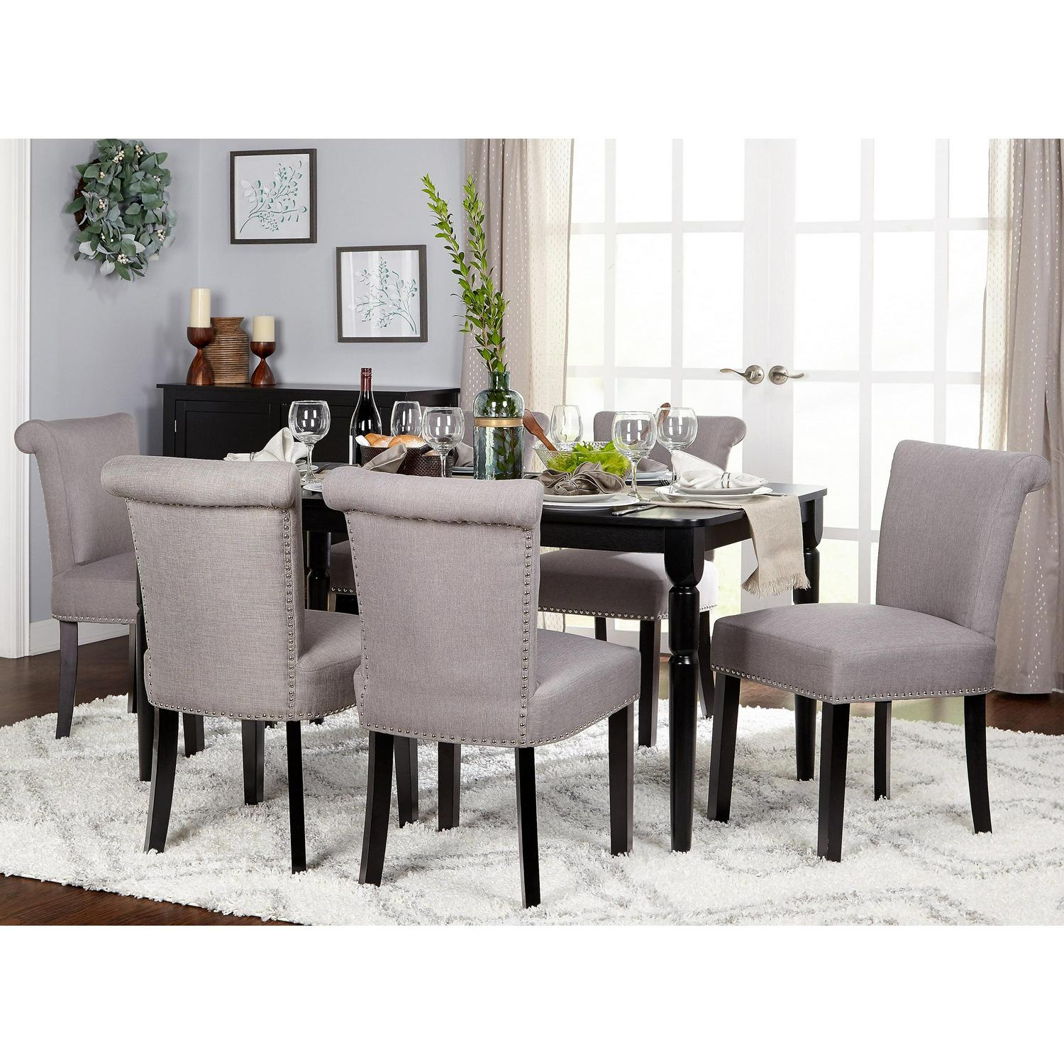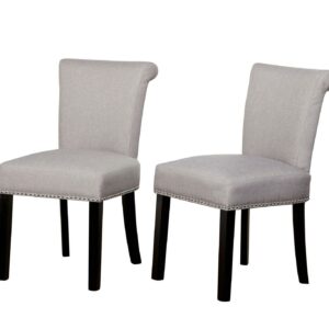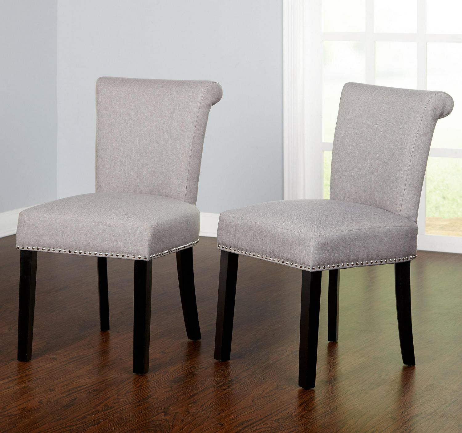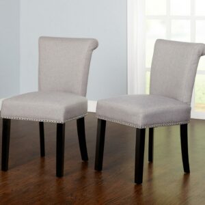 Bring a taste of elegance to your dining space with the Set of 2 Adeline Dining Chairs. The upper back rollback design adds a polished look along with the detailed silver nail-head trim. Cushioned seats and backs allow for greater comfort while dining with family or entertaining friends. Upholstered in a neutral gray linen-like fabric with black wood legs, these chairs will easily complement many dining rooms or kitchen interiors.