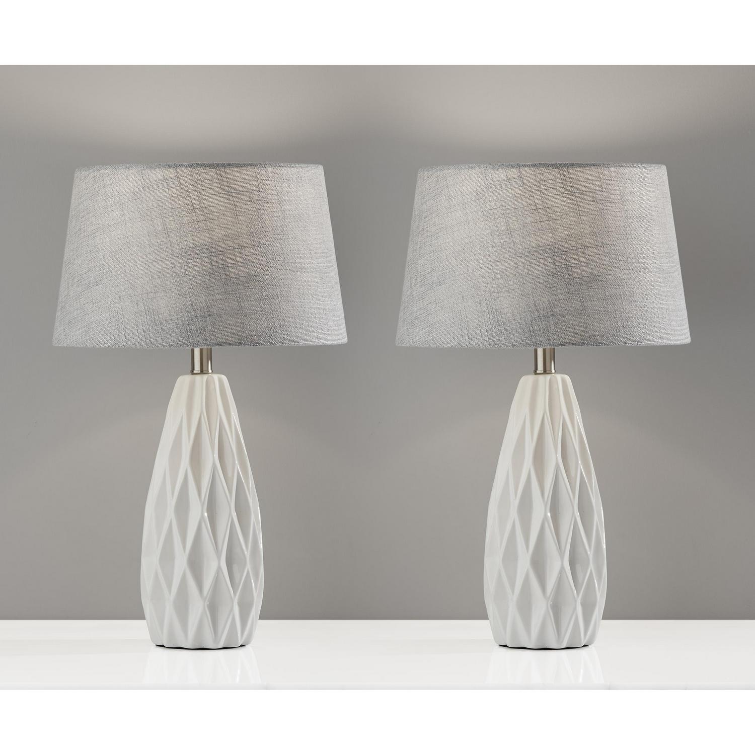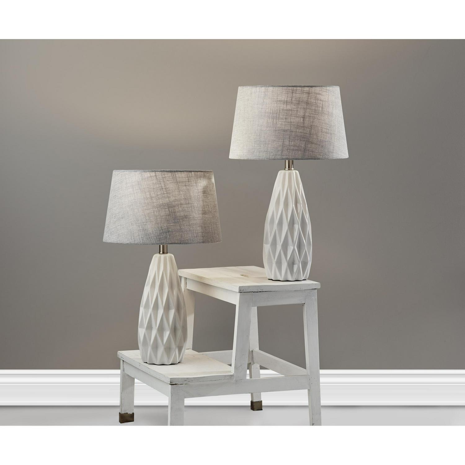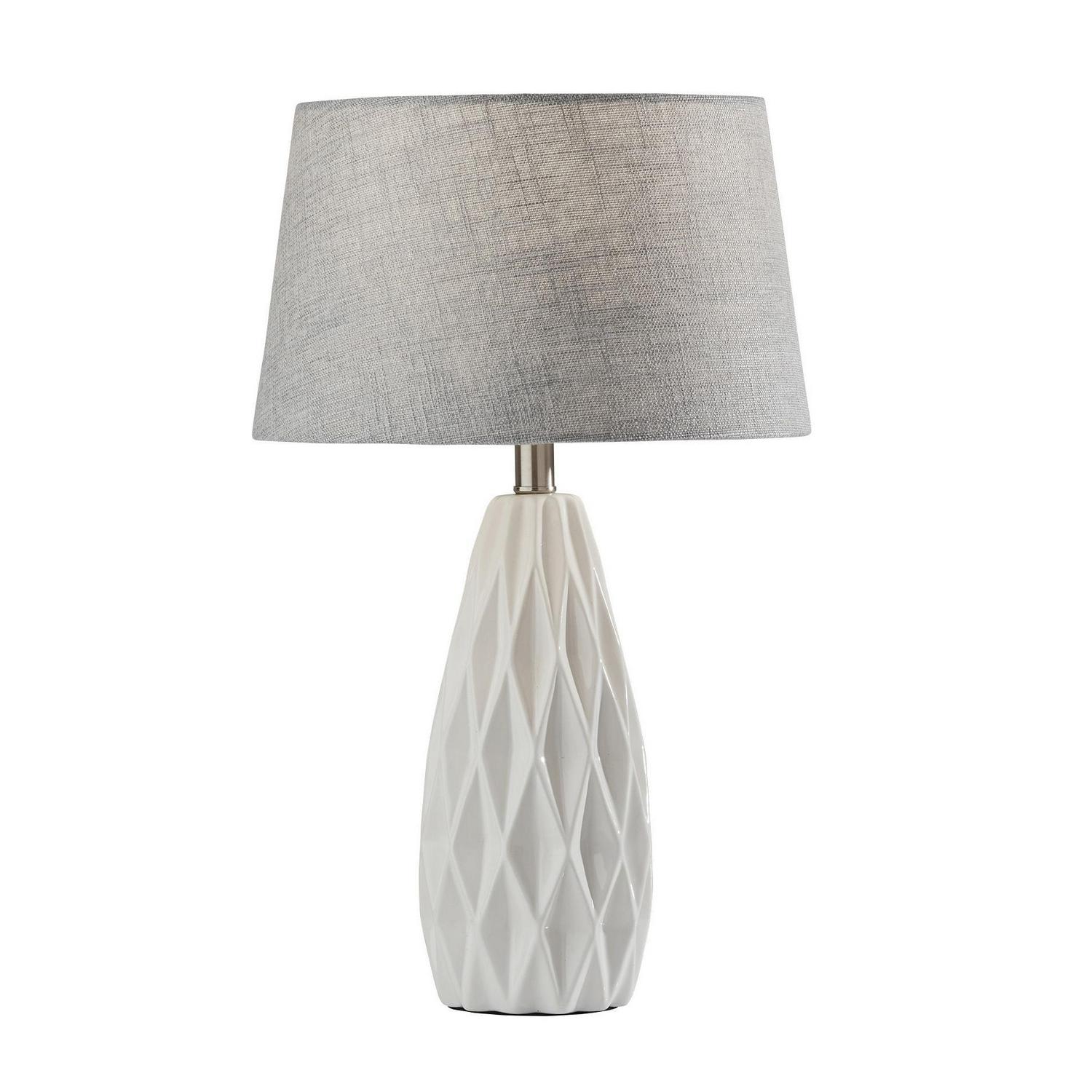 – The white ceramic base has a unique geometric silhouette while the grey fabric shade reveals its beautiful texture when lit up. Turn the lamps on and off with a convenient switch on the socket. All Adesso lighting product is either UL or ETL listed, meaning that it has been tested and approved to meet the government-regulated safety standards for the USA. Bulb is not included.