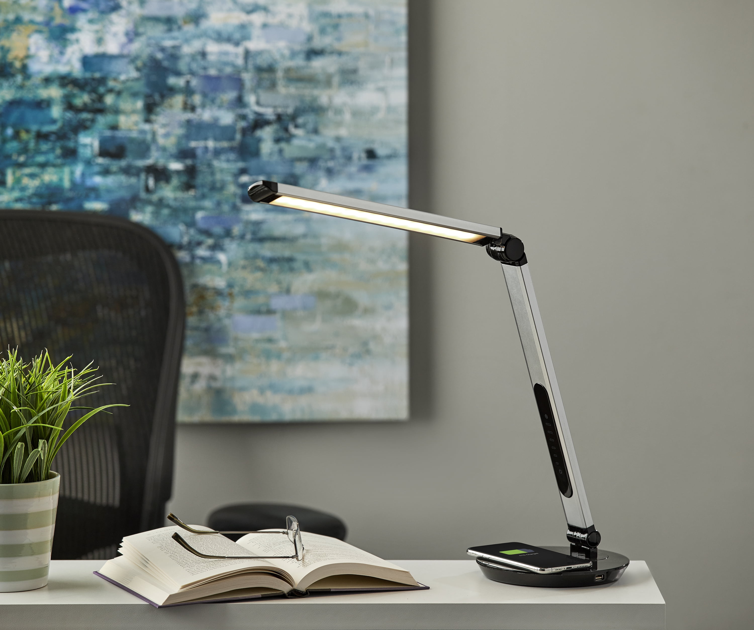Easy on the eyes: 6 Watts of flicker free, glare free LED lighting, perfect for working or reading Qi Wireless Charging Pad & USB Port: connect and recharge your smartphone or tablet 5 Color Temperature Modes & 5 Brightness levels: Adjust the light to match your activity and the time of day Convenient Adjustability: Adjust at the base or mid-point to direct light where it is needed