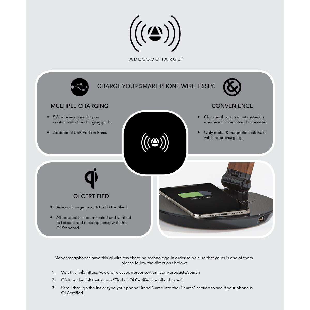 An upgrade from the standard desk lamp, the Rodney LED Wireless Charging Mult-Function Desk Lamp takes desk lamps to the next level with extra functionality and a sleek silver finish. With 6 watts of adjustable, flicker free LED lighting, you can feel free to work, study or read without straining your eyes.Full control over the 5 different color temperature modes and 5 different brightness levels offers an infinite range of lighting selections. This lamp also adjusts in 2 different locations providing a wide range of reach on your desk. In addition, a Qi certified wireless charging pad is conveniently located inside of the base. Many smartphones (list below) have Qi technology built in, so just place your phone on the pad and it will charge right up. No cords, no mess. It’s that easy! All AdessoCharge product is Qi certified by the Wireless Power Consortium. Please visit to see a list of Qi certified products. Our product has been tested and verified to be safe and in compliance with the Qi standard. The AdessoCharge pad supports 5W charging on contact with the charging pad, which gets your phone from 0% to 100% in just 3-4 hours, depending on your phone model. A USB is located on the base and can charge up a second device simultaneously. The LED’s are integrated into this lamp and are not replaceable. However, Adesso LED’s are top quality and last around 50,000 hours!