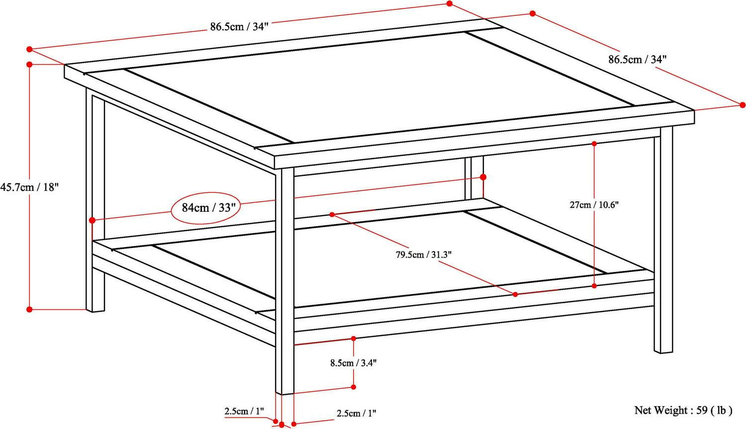 - Assembled Product Dimensions (L x W x H): 34.00 x 34.00 x 18.00 Inches