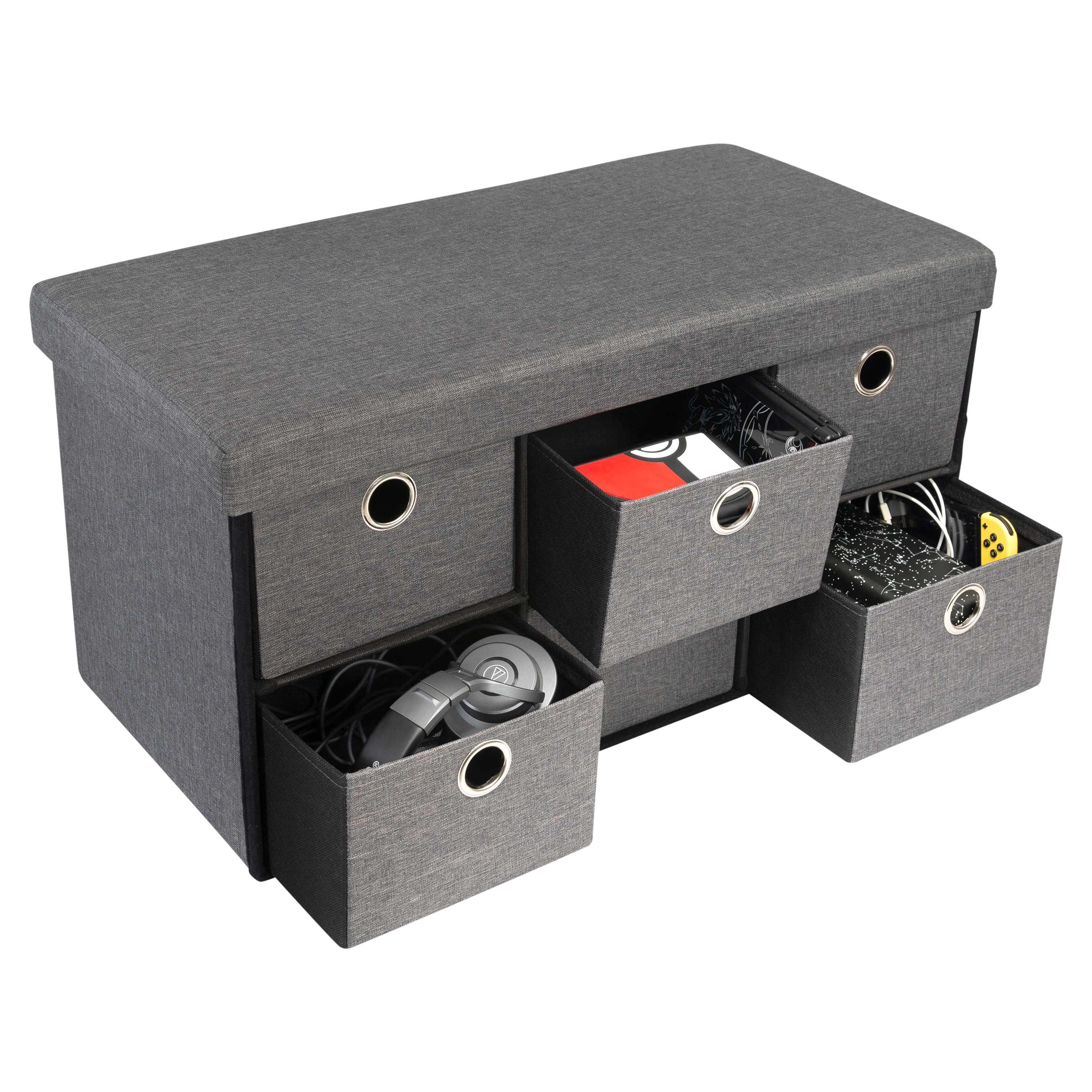 Solve your storage and seating problem with this all in one storage ottoman. Built with 6 removable drawers this is the ideal piece for your home, office or dorm! The cushioned seating makes this comfortable to sit on, great for gaming! Can be used to store gaming accessories, toys, books & magazines and household items. Lightweight and collapsible for when not in use. Look no further your perfect storage solution is here!