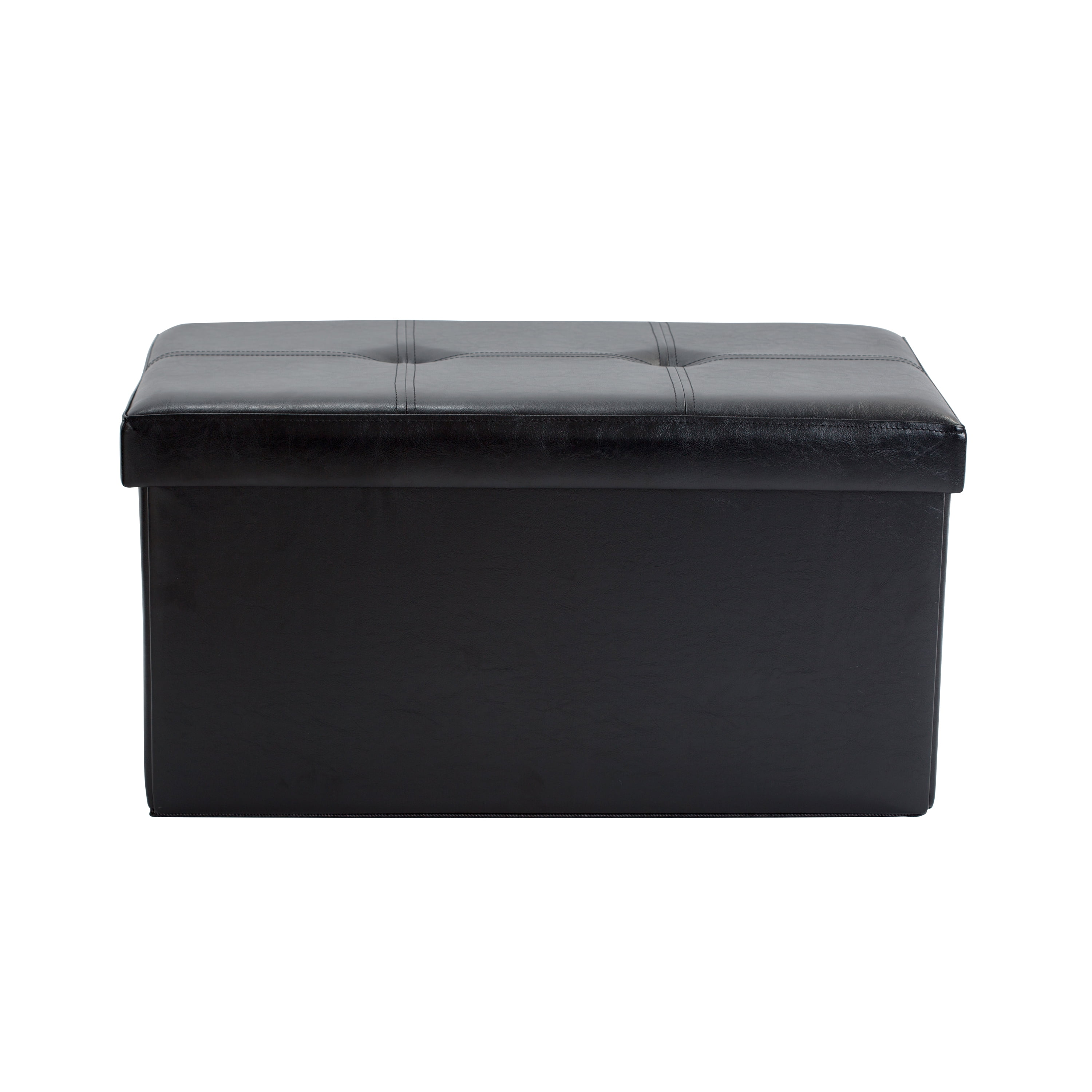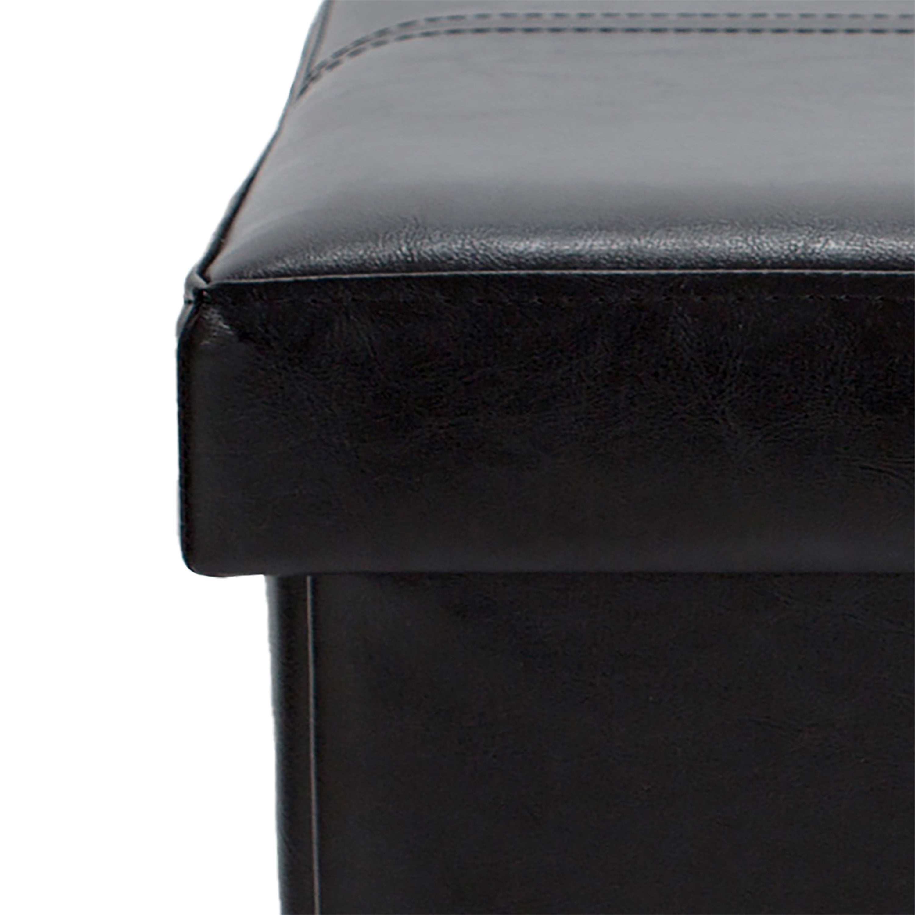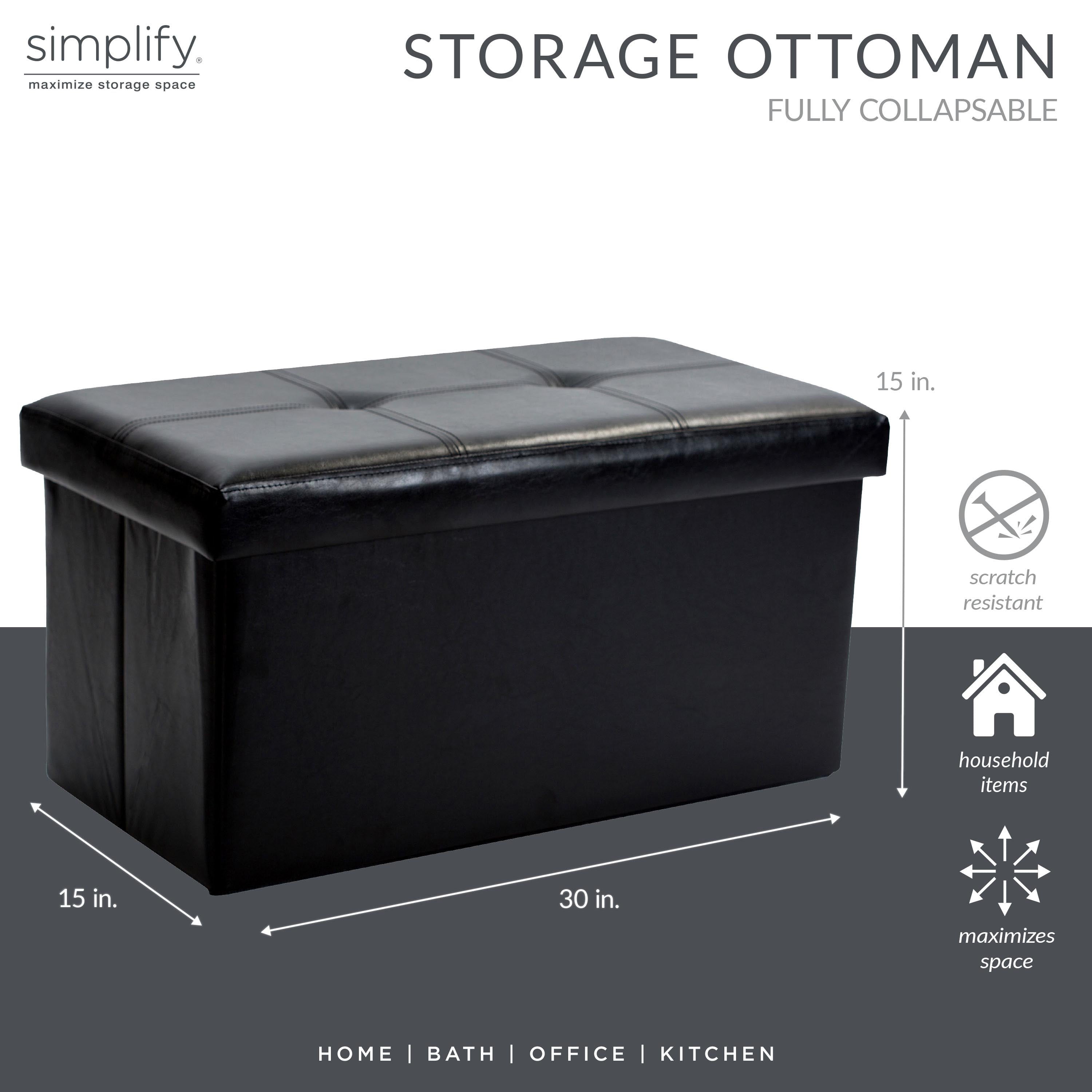 Dimensions 30″L x 15″W x 15″H Made from high-quality PU faux leather Easy to clean Black ottoman assembles in seconds Padded top for extreme comfort; seat, footrest and more Extremely durable (water-resistant), light and mobile Hidden storage space inside: holds a multitude of items; up to approximately 2 cu ft Double-button tufted design with denim piping around bottom edge; prolongs the life of leather material even when moved multiple times 500 lb weight capacity Faux leather ottoman folds flat when not in use Interior offers plenty of space for stashing throw blankets, books, remote controls, toys and other household necessities Ideal for placing in a bedroom, den, living room and other spaces