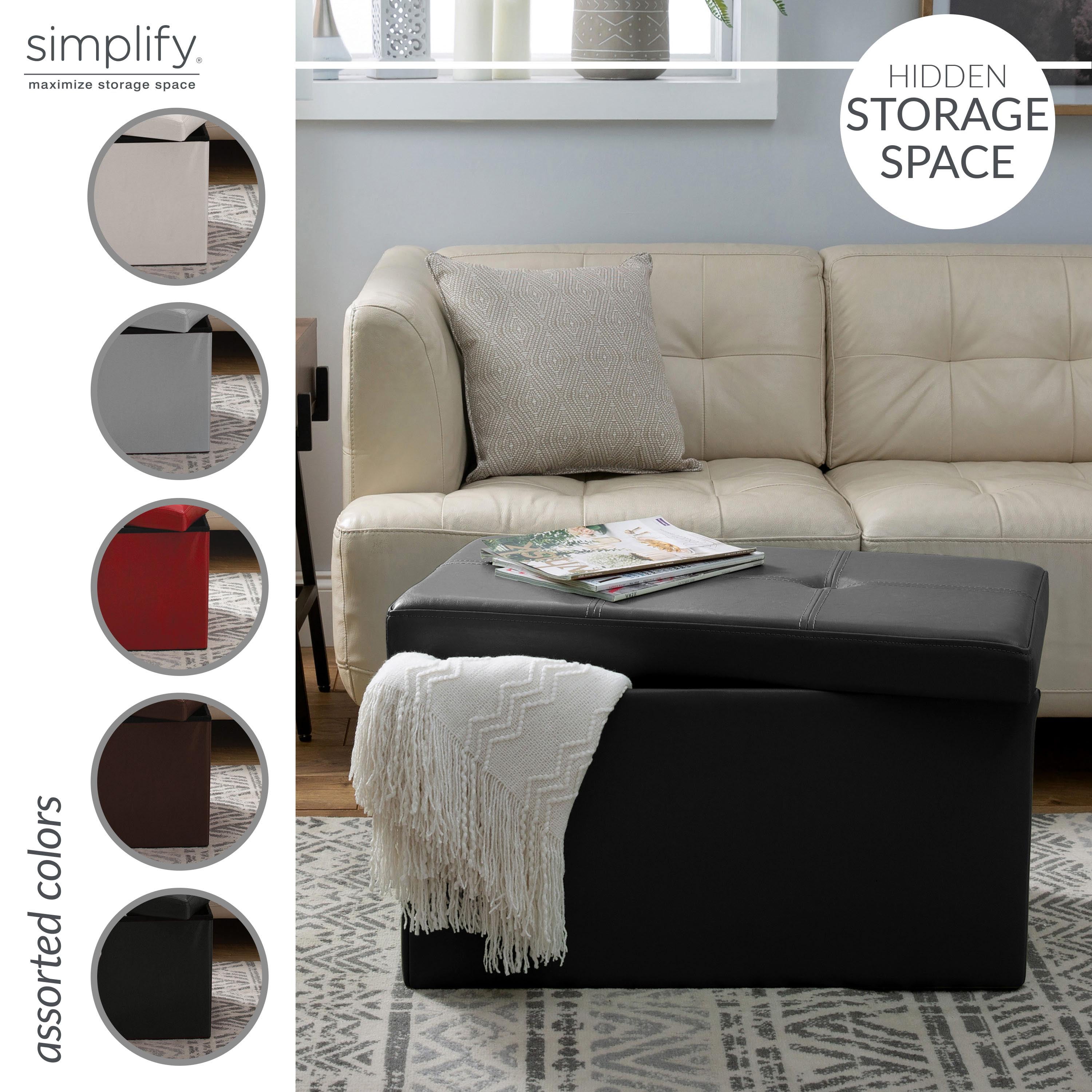 The Double Folding Ottoman adds seating and storage space to any room. Coming in a variety of colors to spice up any room, it can store a variety of items in your room. Its removable top lifts off to reveal a roomy interior offering plenty of space for stashing throw blankets, books, remote controls, toys, and other household. The Simplify Storage Ottoman is the perfect addition to any household. Easily to construct the ottoman serves as storage, a foot rest, additional seating and more! The cushioned top makes it comfortable to rest your feet or sit on. The hidden storage is perfect to store away those items you don’t want laying around. When not in use the ottoman can be folded and put away.