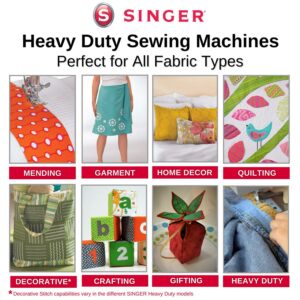 Strength, Speed, Enhanced Power these are a few words that may come to mind when describing a superhero! Incredible as it seems, these are also some of the features of the SINGER Heavy Duty 6360M sewing machine. From denim to canvas, the Heavy Duty 6360M sewing machine is designed with your heavy duty projects in mind. Thanks to the machine s powerful motor, you ll have the needle piercing power and extra high sewing speed to take on your heavy duty sewing projects with ease. Sewing sheer or lightweight fabrics No problem! The easily adjustable presser foot pressure makes sewing very lightweight fabrics a breeze as well. In addition to strength, speed, and enhanced power, enjoy incredible creative capabilities. With over a hundred Stitch Applications, you will have the right stitch for any fabric. The SINGER Heavy Duty 6360M sewing machine also includes carefully selected accessories to bring your sewing projects to life. Slide-on the removable extension table for a level sewing surface when sewing larger projects. Five hand-picked sewing and quilting presser feet are also included. One of the included presser feet is the SINGER Non-Stick Foot. The slick surface on the foot’s underside allows for effortless glide on tricky fabrics such as vinyl and leather. SINGER includes the tools needed to add a professional touch to your projects! Whether you re designing original garments, upcycling jeans, or transforming your home with custom home decor, ensure a great start on your sewing journey with the SINGER Heavy Duty 6360M by your side!