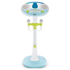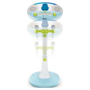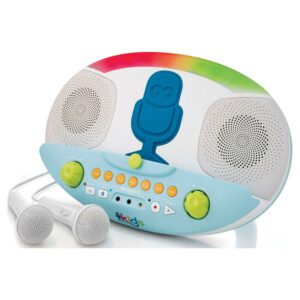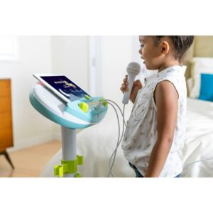 It allows little ones to sing and record their songs for up to three minutes at a time. With six different voice-changing effects, this kids’ pedestal karaoke makes each performance unique. It features Bluetooth capability and can connect to a smart device to stream a favorite song to sing along with. An audio input jack allows other devices to be connected manually. This kids’ karaoke system is detachable and highly portable. Take it on the go for musical fun during travel. Multiple singers can join the fun, thanks to two wired microphones. Each one has adjustable volume to get a sound that’s just right. This toy has an automatic shut-off function to help save power when left on without use. It runs on four C batteries (sold separately) and can also be plugged in with AC/DC operation. The Singing Machine Kids’ Pedestal with Lights is suitable for children ages 4 years and up.
