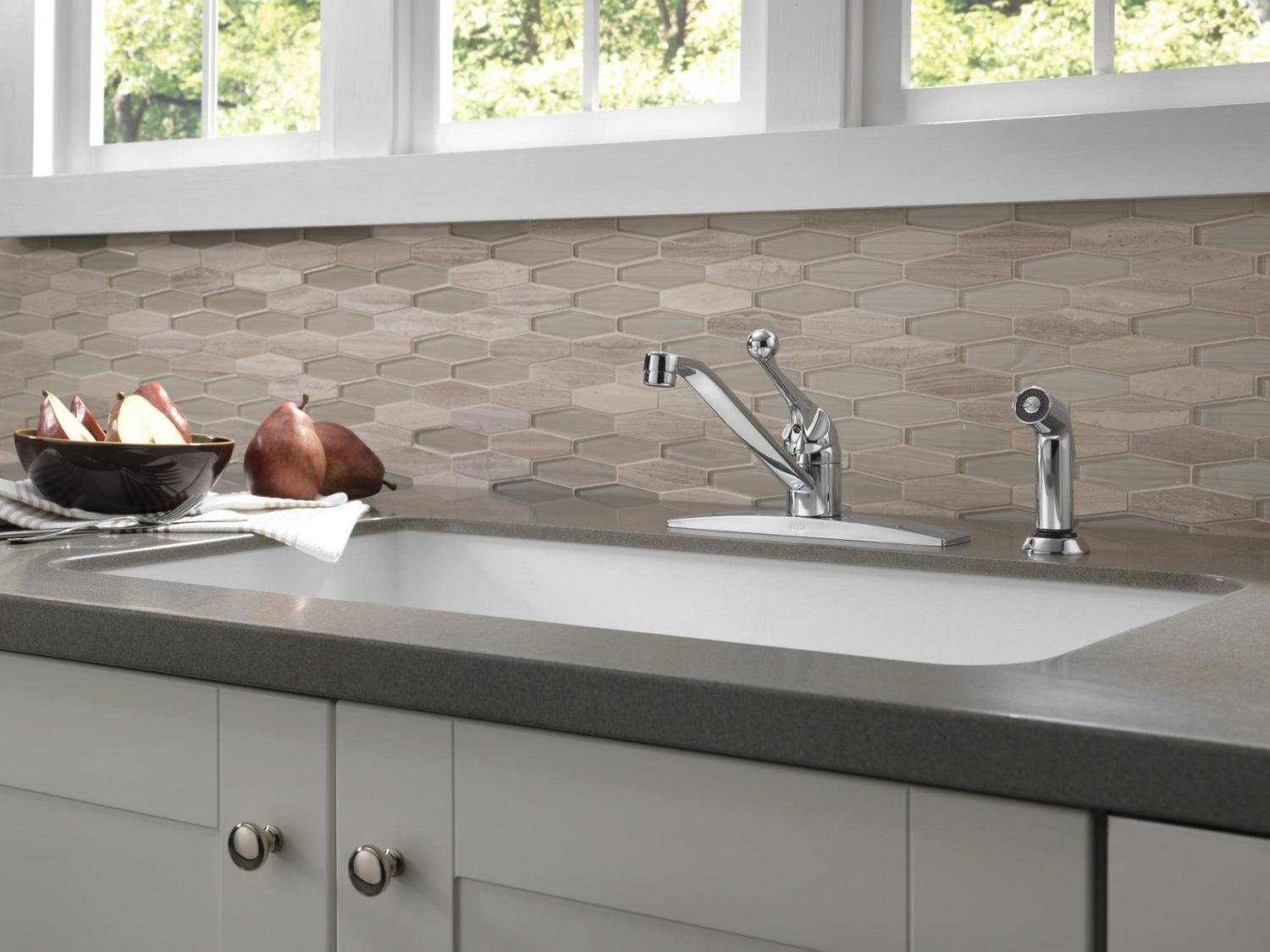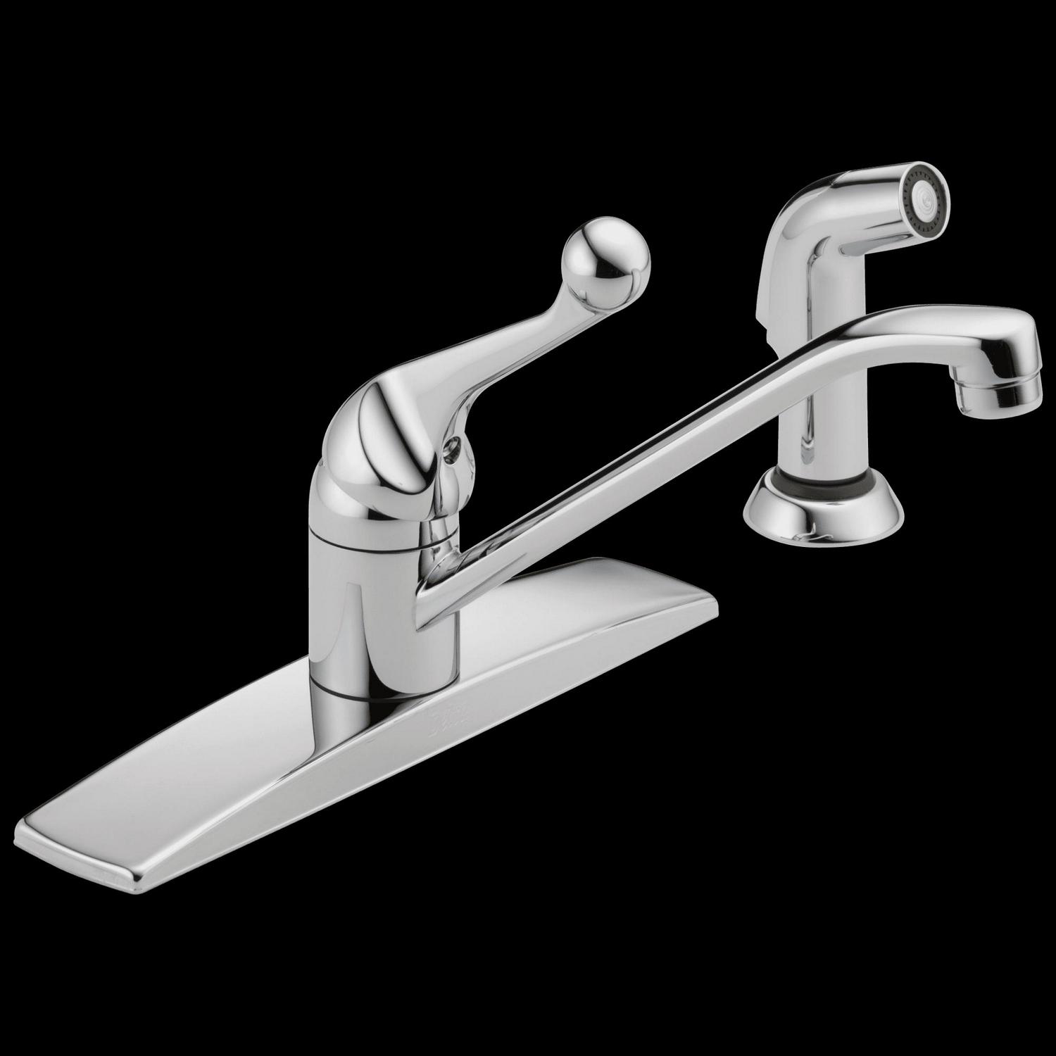 This Classic Single-Handle Kitchen Faucet with Side Sprayer and Fittings in Chrome is designed to allow easy adjustments to water flow and temperature. The mid-arc spout gives you ample room for pots and pans while the color-matched side sprayer can be used to wash vegetables, as well as help keep the sink clean. Practical and hardworking, this series withstands the test of time. From the Manufacturer, the Classic kitchen offering provides a practical, hardworking solution that will stand the test of time, every time. Delta(R) is a reflection of your personality – as individual as you are. Delta faucets complement you, your style, your life, the way you think, work and move throughout the day. Bring your individuality to life.