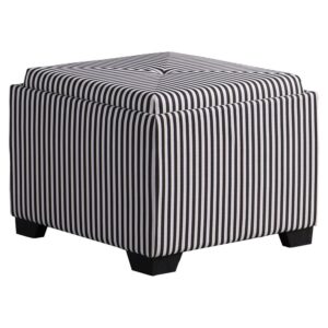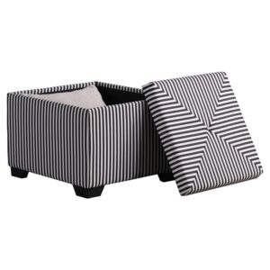 A pop of color and dimension is on display with this alluring and stylish little ottoman. The chic pinstripe pattern offers a well-curated look perfect for completing an ensemble. The top lifts up to reveal ample storage for your convenience, and the padding allows for an extra seat when you need it.
