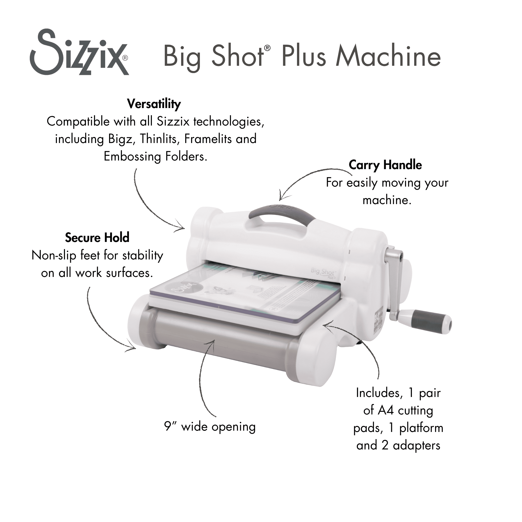 It’s everything you love about the Big Shot – plus the versatility to use 8 1/2″ x 11″ materials! With a sleek white and gray color scheme and the Sizzix® logo embossed on the handle, the Big Shot Plus Fabric Series Machine offers plenty of stylish appeal with the same versatility of working with the entire Sizzix product library (with the exception of Bigz™ Pro dies) – including our smallest to our big 9″ wide plastic-backed dies and embossing tools. – Create your own one-of-a-kind cards, invitations, scrapbook pages, home décor, fashion, altered art, quilting and much more! (To ensure compatibility, always check machine and accessory requirements. – Includes: 1 Big Shot Plus Die Cutting Machine, 1 Platform, 1 Adapter A, 1 Adapter B and 1 Pair of Cutting Pads – Machine Dimensions: 15 3/4″ x 11 3/4″ x 7 1/2″ and features a three-year limited warranty. – Construction: Solid Core Steel Rollers, Unibody Cast Roller Housing, Solid Steel Gears, ABS Plastic Exterior