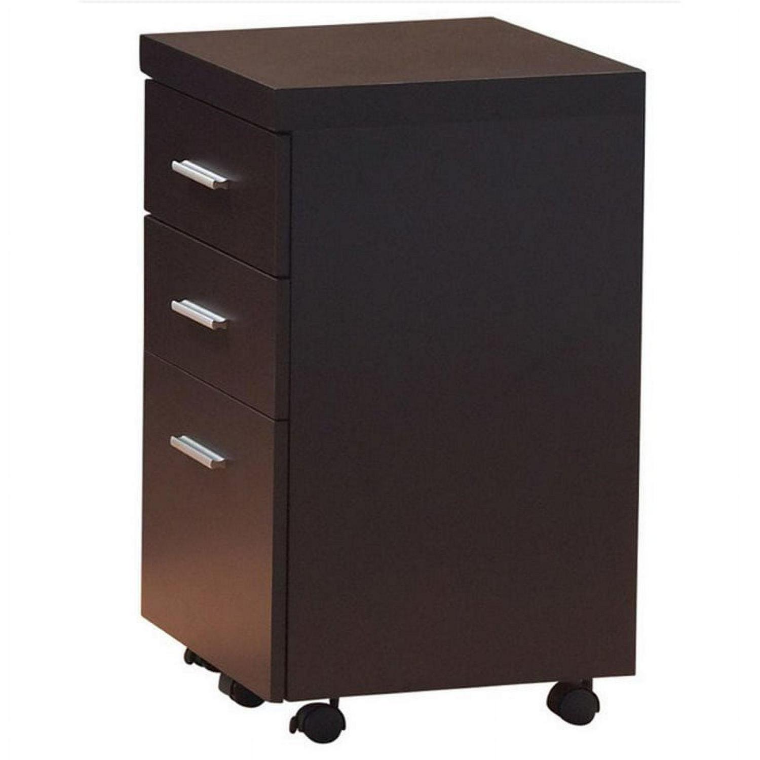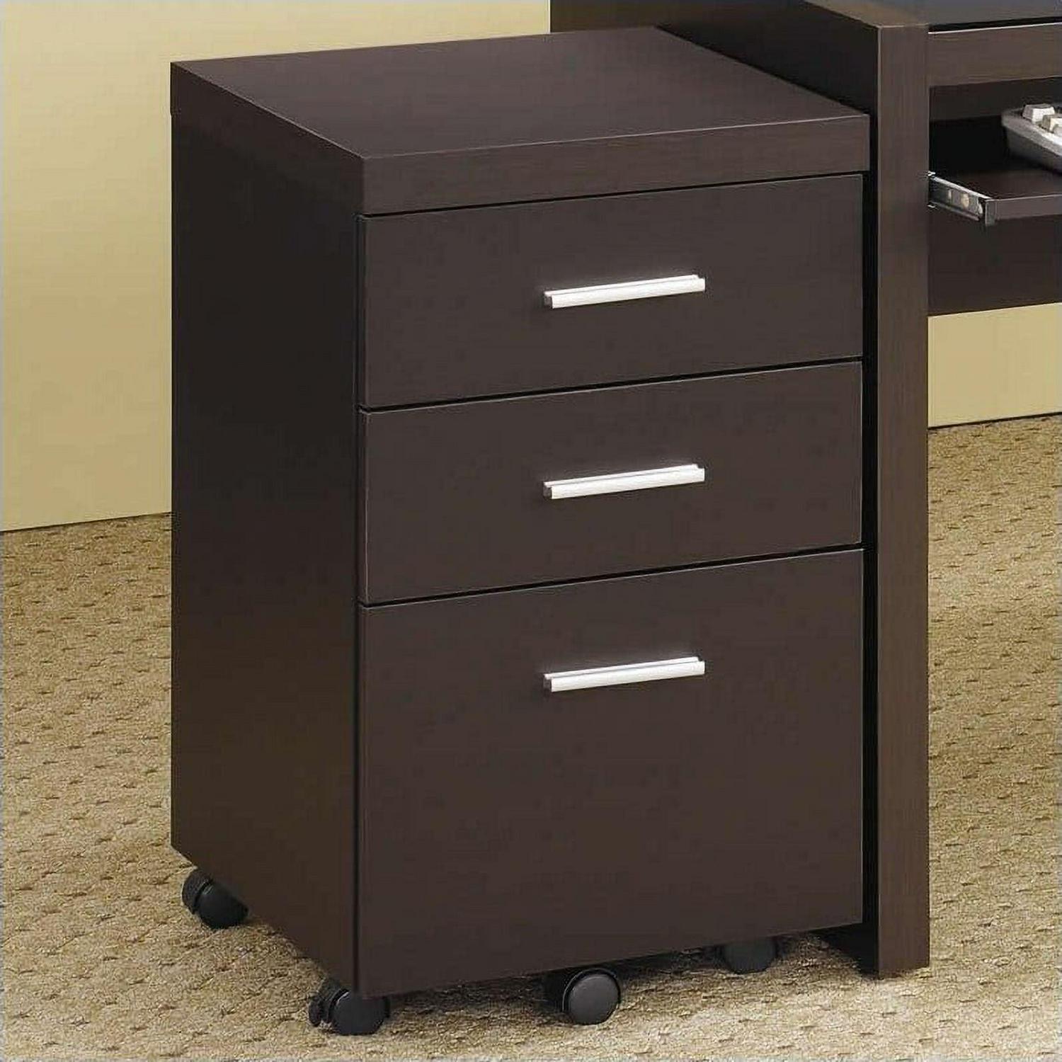 Add no-nonsense glamour and functionality to a den, office, or even a bedroom. With casters built-in, this file cabinet can be easily transported from room to room. Its cappuccino finish blends elegantly with silver handles, adding attractive appeal. Crafted from top-quality materials, this cabinet is as sturdy as it is stylish. It combines perfectly with a desk to create a convenient workstation.