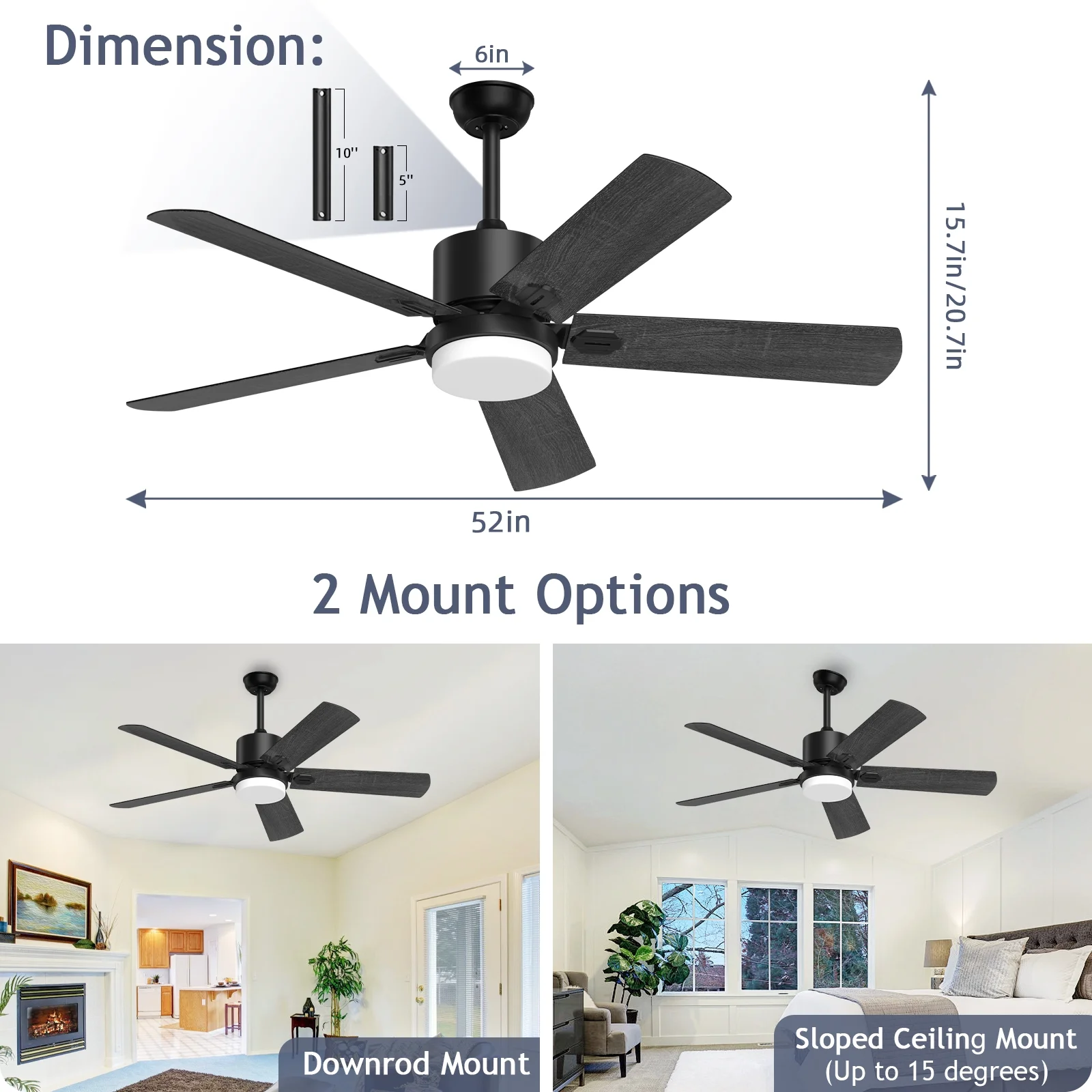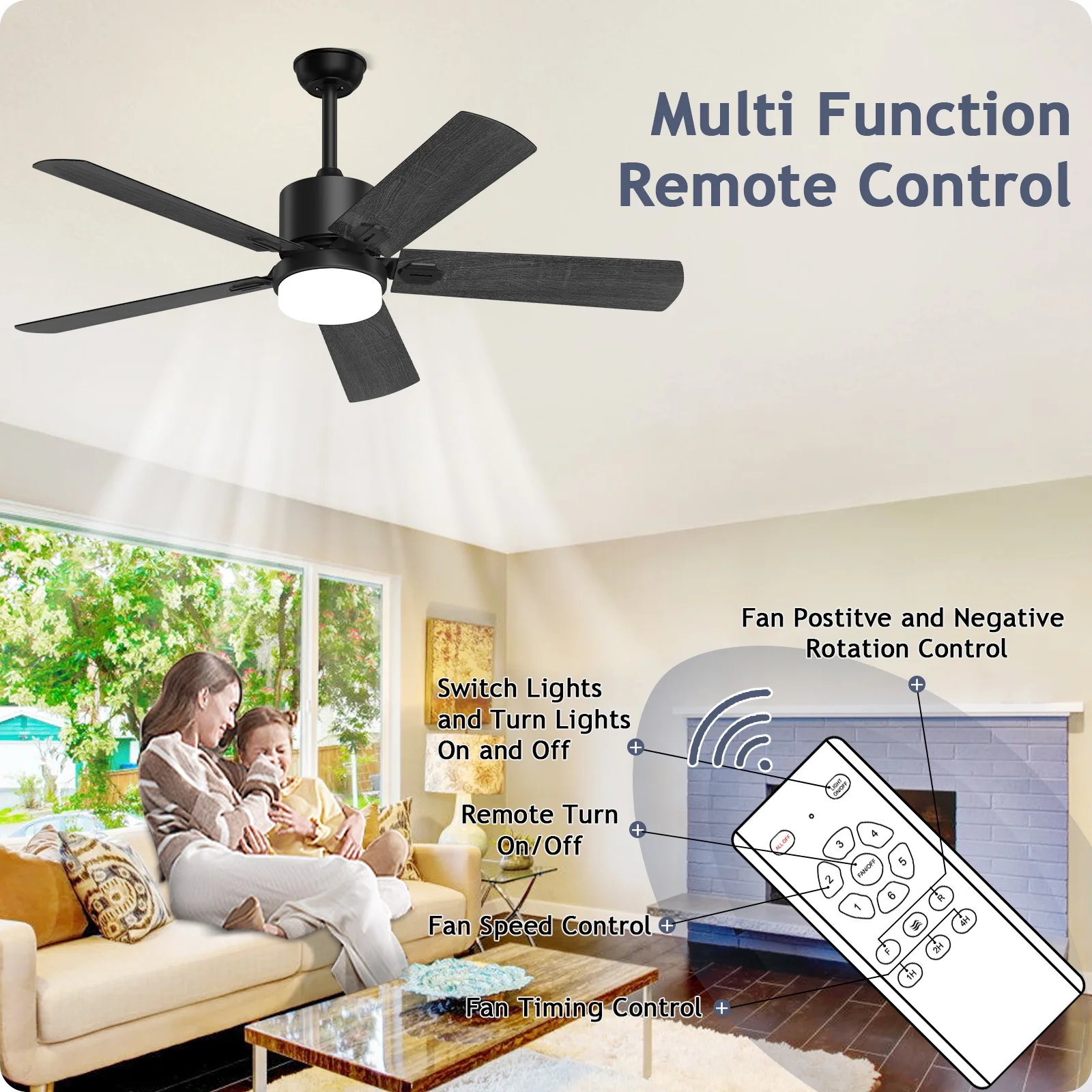 SKEVEN 52” Ceiling Fan with Light and Remote Control, 6-Speed Reversible DC Motor, 5 Wood Fan Blades,Black