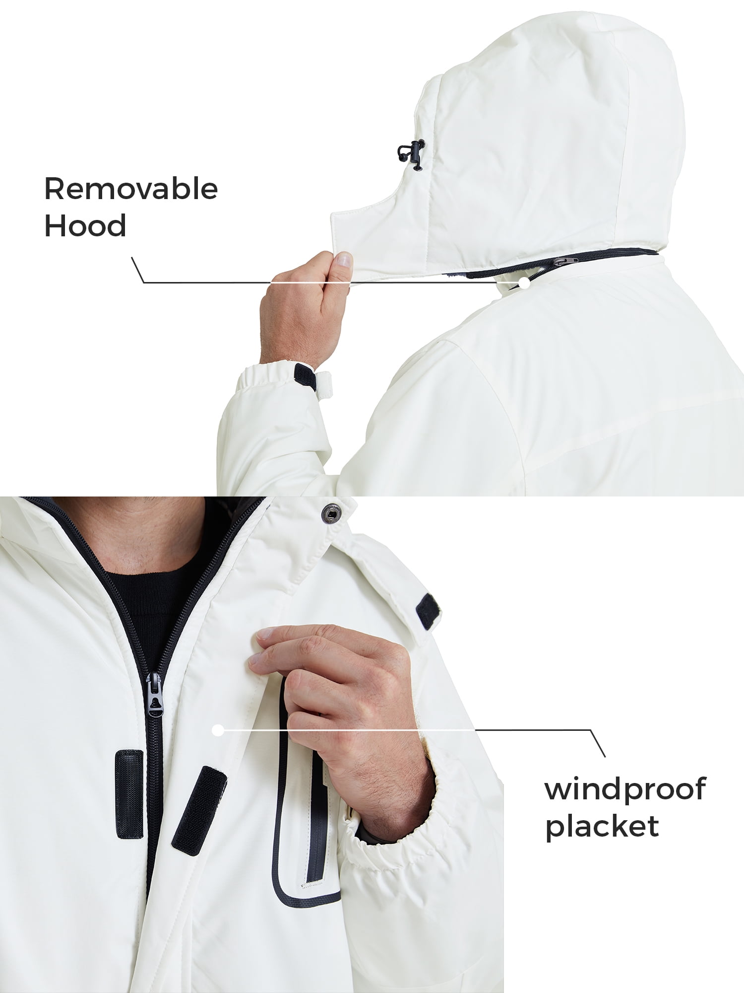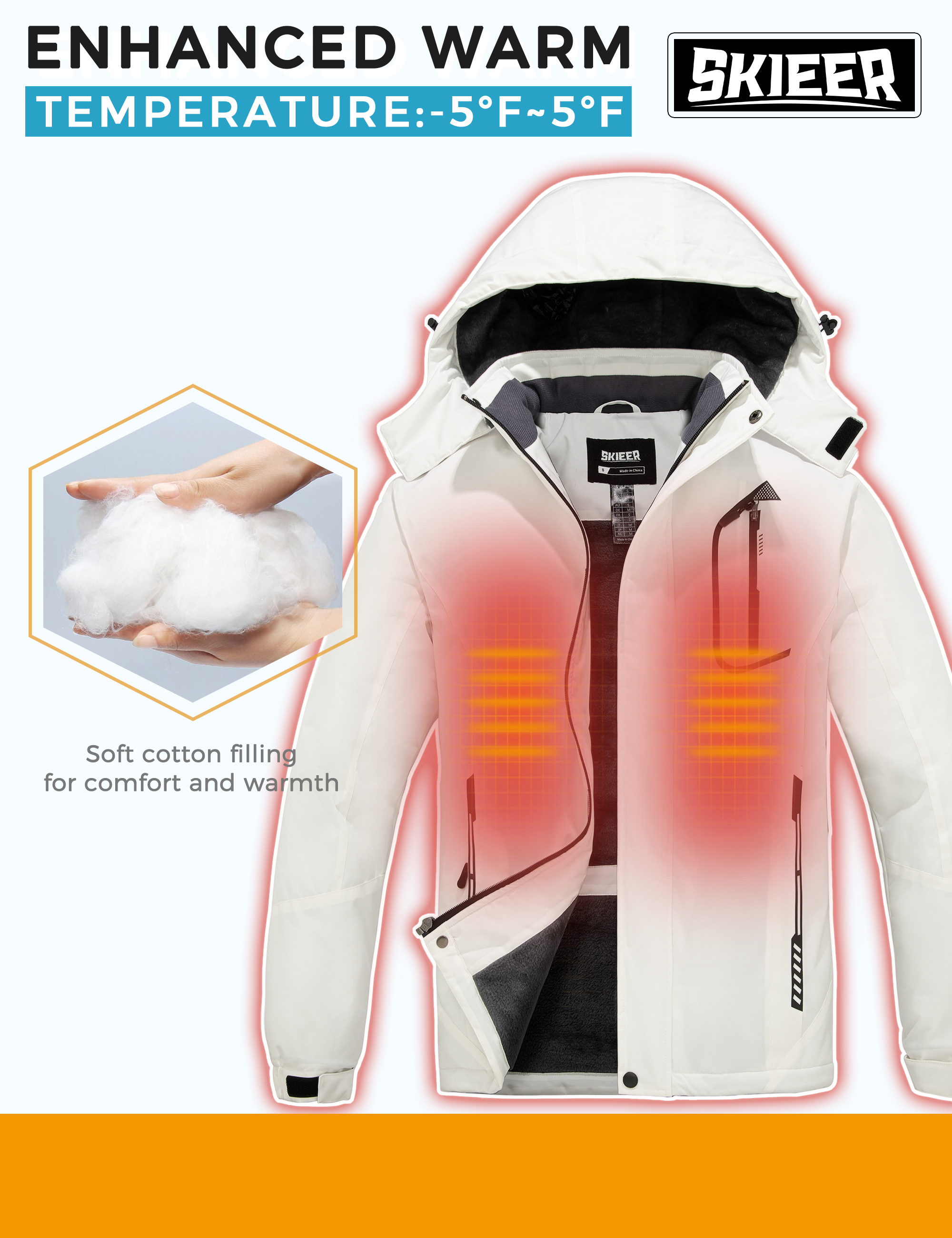 Waterproof- The outer shell of this men’s ski jacket has a waterproof index of 10,000mm. You won’t worry about getting wet while skiing or snowsports in snow days. Our waterproof rain jacket’s waterproof PU membrane will protects you all-around effectively from wet-weather by stopping saturated snow and rain. Windproof- This warm hooded winter jacket features adjustable hook-and-loop closures cuffs, an inner drawstring hem, a detachable fleece-lined hood and full zipper closure to keep gusts of wind. This windproof jacket for men keeps you covered from ice cold gusts of wind on slope. Keep Warm- The soft 240 grams of imitation down cotton padding and fluffy fleece liner in this men’s winter coat provide excellent insulation and cozy. This snow jacket effectively keeps you warm while enjoying the outdoors amidst low temperatures. Move Freely- Using a 150D matte stretchy shell on skiing jacket for men provides more flexible skiing experience, so you can focus on your ski leaps comfortably. These waterproof windproof winter coats are built to handle challenging weather and snowsports like skiing, snowboarding, mountaineering and hiking. Practical Pockets- Designed with convenience in mind for men waterproof jacket. Tailored with 4 zip-secured pockets and 1 inner mesh pockets on snow coats for keeping your hands warm and storing essentials like phones, cards and passports. Connecting Band- There are two elastic bands on the waist of the windproof snow jacket (linked with buttons and detachable) for using with ski pants by the belt hole on the waistband. See the big from the small, Skieer snowboard coats have more convenient functions, suitable for a variety of snow pants. Reliable SBS Zipper- Durable and High Quality Detial: The smooth SBS zipper of the ski jacket is easy to open and close. The winter coat is more convenient to put on and take off. Meanwhile, creating good seal for Skieer’s winter jacket for men, let people enjoy the “toasty” warm. Detachable Hat- The waterproof rain jacket’s hood provides added warmth and acts as a safeguard against cold wind and frigid temperatures to keep head and ears cozy and warm. This men mountain ski jacket’s hood can be removed for those not-so-cold winter days.