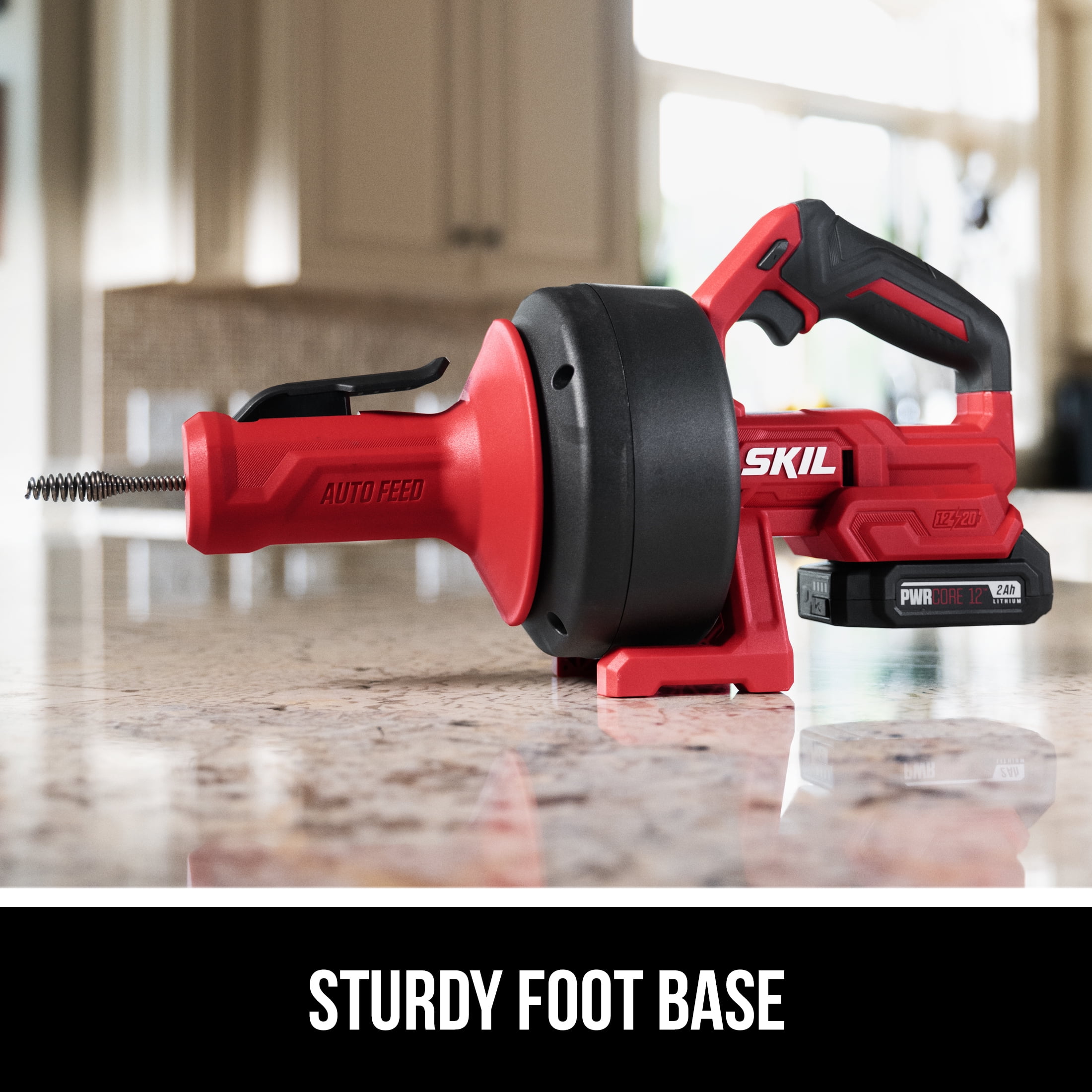 Clear tough clogs and keep bathtub, shower, and sink drains flowing freely with the SKIL 12V/20V Power Snake Drain Cleaner. This cordless power snake features a ¼-inch by 25-foot carbon steel cable for extended reach and maximum durability around elbow joints and curves to clear drains from ¾-inch to 2 inches in diameter. Its variable speed trigger delivers precise control while its auto feed cable extends and retracts with the press of a paddle lever. A foot base offers sturdy support while the drain auger is in use, and a cleaning port drains excess water after clearing a clog and retracting the cable from a drainpipe. This drain snake is compatible with either SKIL 12V batteries for a compact, lightweight tool or SKIL 20V batteries for more power and longer runtime. This 20V cordless drain cleaner kit includes a PWR CORE 20™ 2.0Ah lithium battery and PWR CORE 20™ 30W charger.