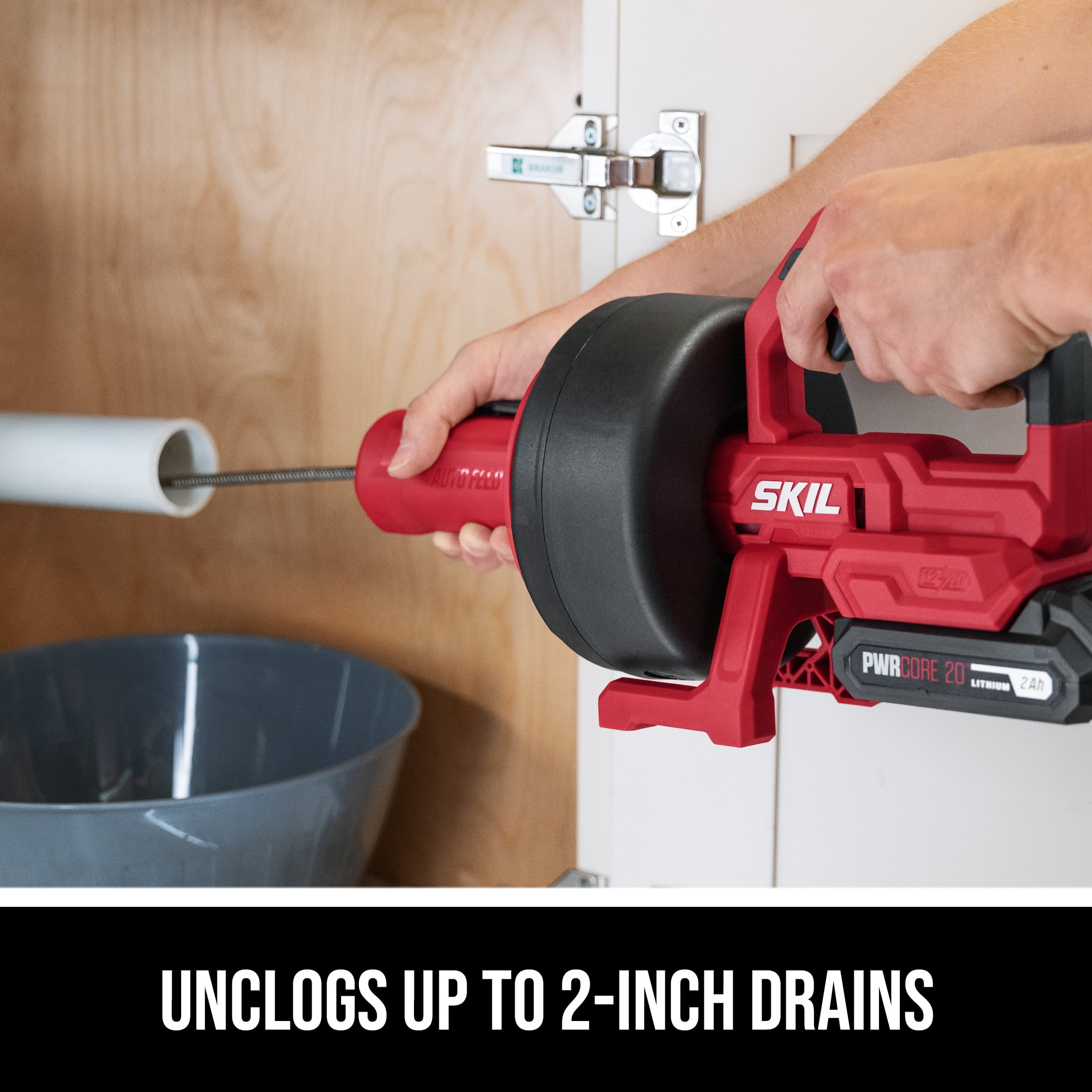 20V CORDLESS DRAIN CLEANER KIT – Includes a 2.0Ah lithium battery and 30W charger AUTO FEED AND RETRACT – Engage clutch to extend or retract cable UNCLOGS UP TO 2-INCH DRAINS – Clears drains from 3/4-inch to 2 inches in diameter 1/4-INCH X 25-FOOT CARBON STEEL CABLE – For extended reach and maximum durability VARIABLE SPEED TRIGGER – For precise control CLEANING PORT – Drains excess water after use STURDY FOOT BASE – For better ergonomics during use POWERED BY SKIL 12V OR 20V BATTERIES – Adaptable to multiple power sources for convenience