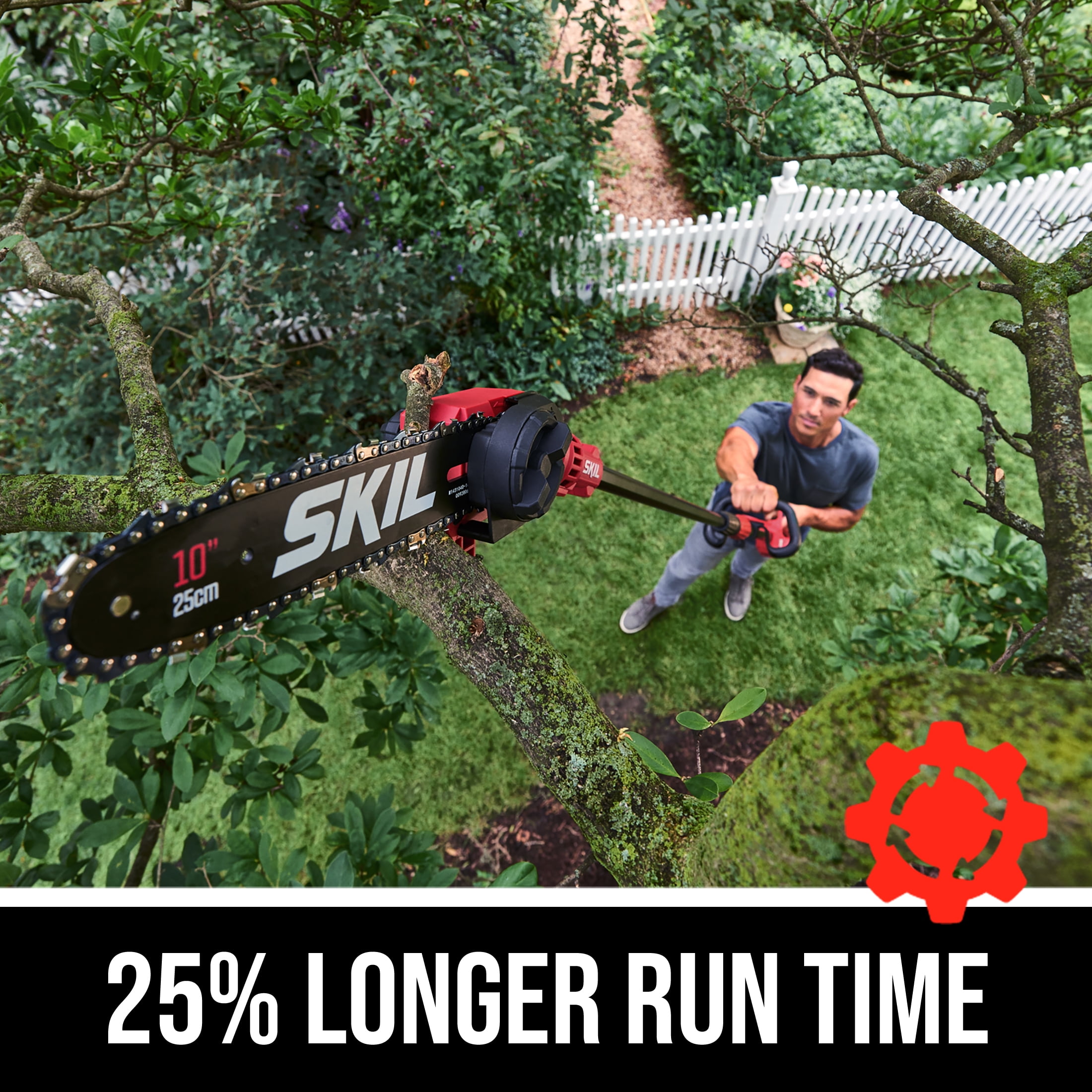 SKIL CORDLESS POLE SAW – Includes PWR CORE 40 Brushless 10” 40V Pole Saw, 2.5Ah Battery, and Automatic PWR JUMP Charger AUTO LUBRICATING & TOOL-LESS CHAIN TENSIONING – The auto-lubricating feature provides efficiency and performance, and the tool-less chain tensioning adjusts hassle-free, giving you quality cuts 15-MINUTE CHARGING – Auto PWR JUMP charges the battery from 0-30% in just 15 minutes (based on 2.5Ah battery) TELESCOPIC SHAFT & ANGLED HEAD – Aluminum telescoping shaft extends from 7.5-10 ft and angled 10 In. Bar and Chain provide cutting control and versatility POWERFUL PERFORMANCE – The digital brushless motor provides efficient, high-performance power for longer tool life without the hassle of gas LONGER RUN TIME & BATTERY LIFE – Industry-leading PWR CORE 40 lithium battery technology wraps each cell with cooling material to keep it powering on for 25% longer run time and 2X battery life LIGHTEST IN ITS CLASS (Compared to 40v competitive brands)
