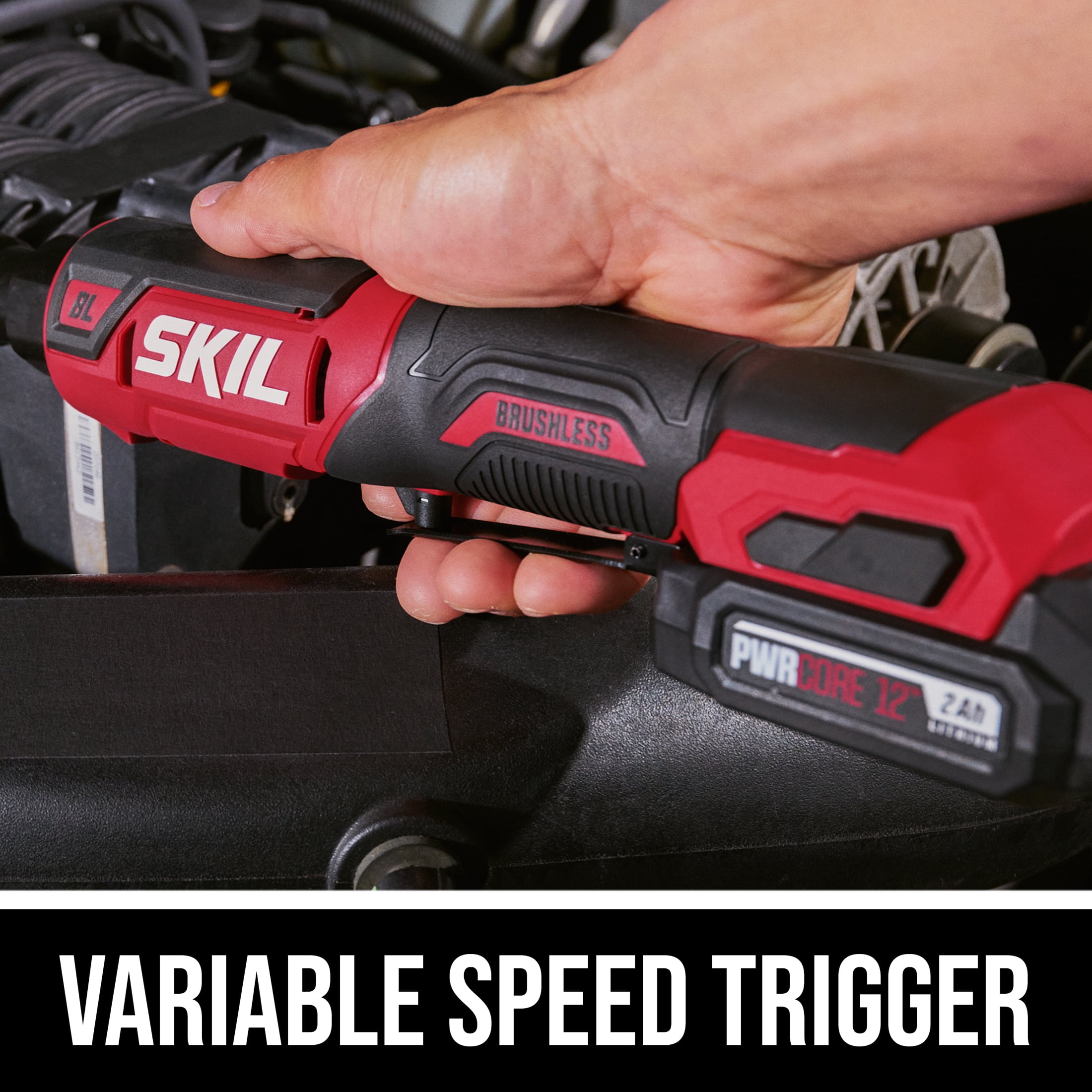 Get industry-leading performance with a brushless cordless ratchet wrench powered by SKIL PWR CORE 12 lithium technology. This 12V brushless ratchet brings power to the tightest of spaces with its low-profile head design and overpowering torque, allowing you to work in an engine bay without any issues. Whether you are in the garage or assembling furniture, look no further as this ratchet wrench will conquer nuts, bolts or fasteners thrown its way. This brushless cordless ratchet comes equipped with a variable speed trigger that delivers 0-220 RPMs while choosing 55ft-lbs. of max torque or 150ft-lbs of max manual torque. The built-in LED light allows for swift use in tight, dimly lit environments, such as under the hood or beneath the car. Backed by the SKIL PWR CORE 12 lithium-ion battery technology, this wrench runs up to 25% longer and delivers 2X the battery life, while the PWR JUMP charger charges the battery 25% in just 5-minutes.